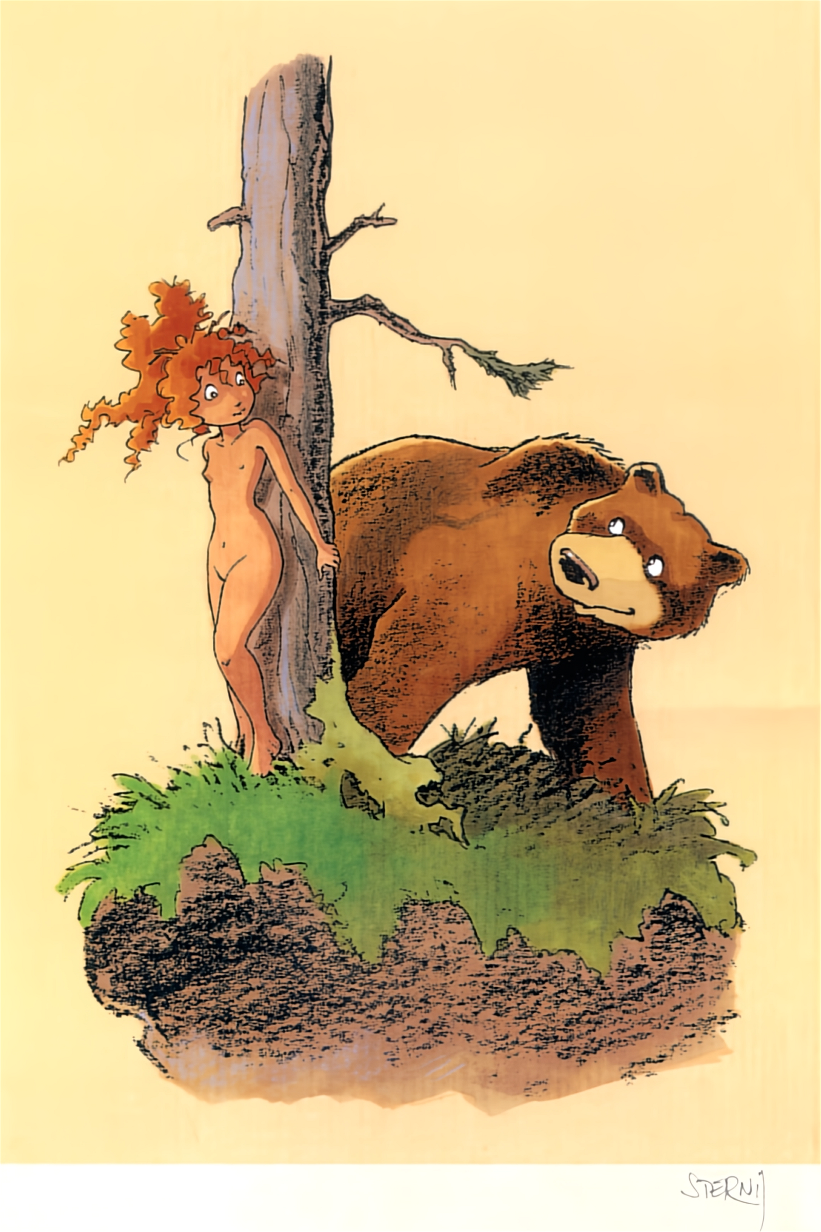 Pyrénée (clothed) and the bear go boating | Pyrénée (clothed) running with Aesop’s hare | Pyrénée (clothed) playing basketball with various children’s animal characters | Pyrénée (clothed) climbing with Aesop’s(?) fox | Pyrénée (clothed) and the bear, rowing, discover a balance problem (and who's the swimmer?) | Pyrénée (clothed) in a montage of Sternis motifs Pyrénée (clothed) rough sketch - possibly a preliminary for an unfinished sequel