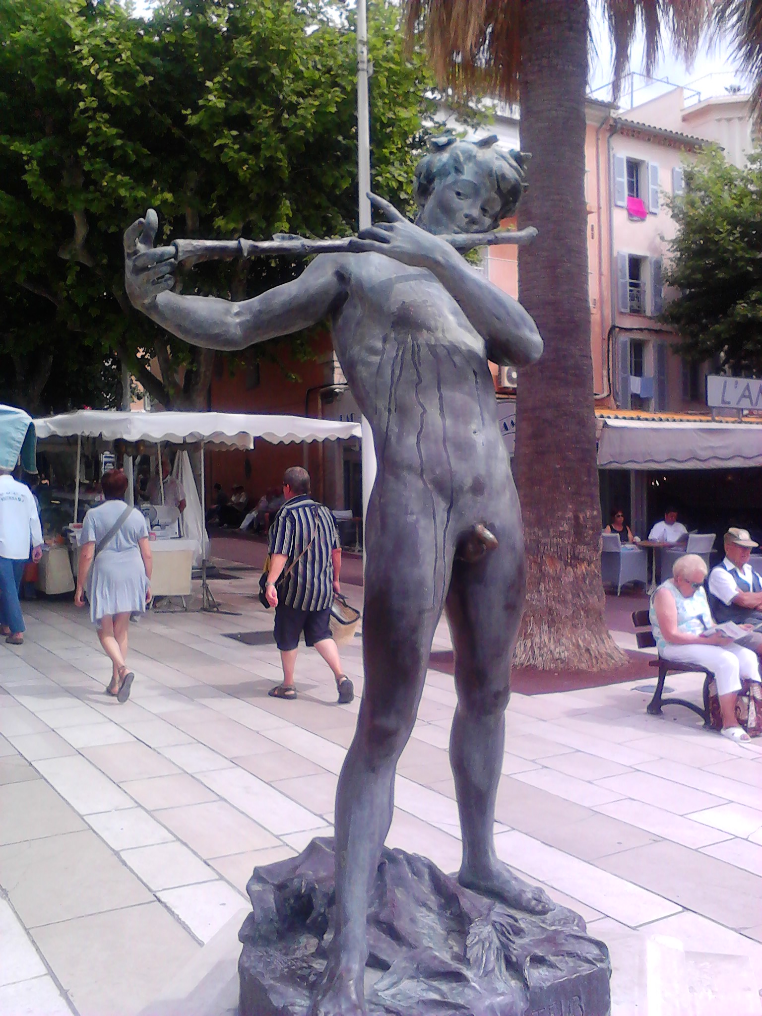 This statue is the inspiration for my stories Being and Be2ng, which contain some mild sexual references. It depicts a youth or faun playing a crude flute that he has improvised from a tree branch. The black and white pictures have been cleaned up from faded antique sepia photos on the net, and depict the original marble and bronze versions. As you can see from the other images, when the statue was reproduced in miniature it suffered the same kind of pointless censorship that many 19th-century statuettes were subjected to, proving that even the French could sometimes be prudish - at least about front views! Full size version, Bandol, France ![]() Between 21 April 1953 and 8 October 2020, a lifesize bronze copy of the statue in its original nude state stood on the promenade at Bandol in southern France, between the marketplace and the seafront, close to the Hotel de Ville and what is now the Bar-Restaurant l’Amiral. It was set on a low-rise pedestal, allowing passers-by to see it almost face to face. Over the course of almost seven decades it acquired some pretty nasty discolouration and was in serious need of cleaning; on the other hand, its penis looked as if it had been polished, possibly by people touching it for luck... or whatever. This led one wag to label his photo “Golden Dick”. How very droll. I’ve scoured just about every public photo gallery on the internet in search of images and these are the best ones I could find. ![]() ![]() ![]() ![]() ![]() ![]() ![]() ![]() ![]() ![]() ![]() ![]() ![]() ![]() ![]() ![]() ![]() ![]() ![]() ![]() ![]() ![]() ![]() Restoration and Reinstallation On 8 October 2020 the statue was removed for much-needed cleaning and restoration, and when it returned on 4 February 2021 it was installed inside the Médiathèque de Bandol, where it will no longer be subject to the ravages of the elements.