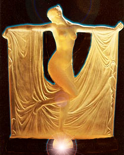 Lost amid the confusion from segue between small gray captive to half-woman and half-clay, the Asian-Indian beauty found herself unable to stop the coke-bottle-thick spectacled Pygmalion stand-in as he guided her as sculpture-in-progress into another classical stance nearly as famous as that of her QQ colleague. Even elements of her superheroine attire had been employed into the pose… her ankle-length saffron sari was now artfully-lovingly draped along her shoulders and arms outstretched sideways. Emma’s limbs felt thick and heavy, her mind-controlled body becoming more and more like molded clay drying into immutable hardness. She found herself poised like a flamingo, teetering upon one foot planted atop her pedestal with the other leg drawn up within a sideways-tuck, bent knee pointing outwards and to the left. From Weasel’s perspective, the trickiest part about posing Empath Girl was folding and creasing her robe just so to become both true to the intended original artist’s representation; as well as providing full and unfettered future access for the Colonel to key and critical areas along her delicate shapely physique. Once this was accomplished, however, the end for the olive-skinned beauty came quickly from airbrush blasts combining a creamy orange-pink translucent covering with a fast-drying shiny clear lacquer. The process was so rapid that her crowning Mind-TRAMP was superfluous! Poor Emma’s original theta- wave jolt inside the elevator had carried her brain fully through from boot camp to fashion runway to pet store to her final podium pose. Head turned to the side and uplifted slightly toward the gallery ceiling, her imitation of a rose-quartz early-1900’s masterpiece stood strikingly upon its perch, while enclosed under-lighting enhanced this QQ’s artistic attitude by coaxing forth an outward warm peach glow. Stepping back from this rapidly-rigidifying teenager (once the Catalina Island clear-coat blended into her bodypaint dried there would be nothing she could do), CC’s cruel third-in-command proclaimed her transformation to be complete: “Sweetie, that’s damned-near perfect! You’re a museum-quality life-sized copy of Lalique’s Suzanne. Hold it right there!... as if you had any choice in the matter. Ha….Hah…Hah”! Weasel’s guffaws punctuate her predicament. Emma is now a shellacked statue.