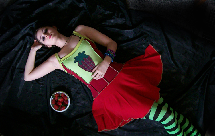 Her costume was quite adorable on her athletic frame. To accent her dollness, Stephanie had found a tan long-sleeved leotard. Though she had searched, Stephanie could not find a pair of similarly made gloves, and so kept her hands, unfortunately, bare. Her dress was red and lime green with a strawberry patch over her chest. The dress had a light and airy skirt that made it half way to her knees. She kept to the rag doll theme with striped black and green tights that hugged close to her shapely legs. Though she had first thought to get regular Mary Jane’s for her shoes, Stephanie instead decided on black ballet slippers. With their elastic buckle and soft canvas fabric, they looked all the more appropriate.