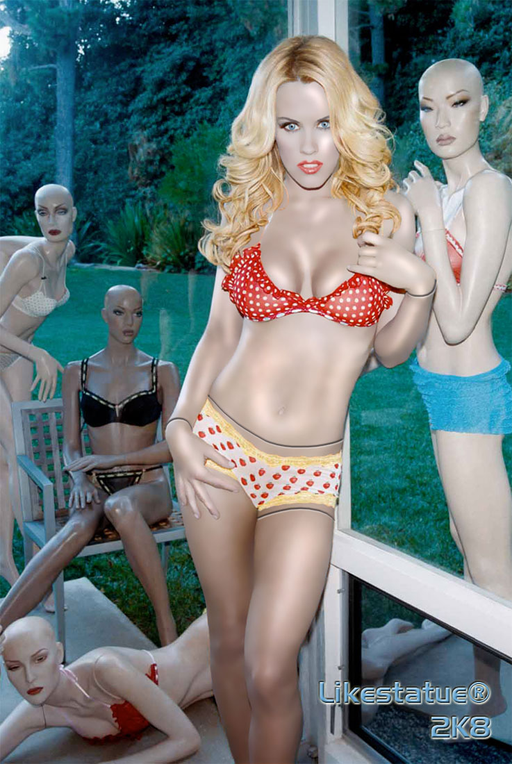 “Sorry, Miss Jenny, you’ll have to settle for eternal beauty instead,” Stewart replied a few seconds later when the plastic color had covered her motionless body completely. Melanie and the other mannequin withdrew slowly, the glow in their eyes fading for now. They took classic display poses flanking the frozen model and became still again, for the time being.