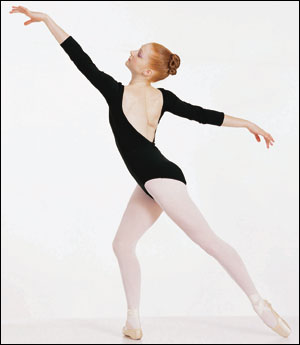 leotard, white tights, and a short sheer chiffon wrap skirt. You could see the