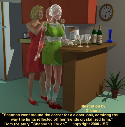 Shannon went around the counter for a closer look, admiring the way the lights reflected off her friend’s crystallized form. She went behind Terri and untied the halter-top of the dress, glad that Terri had worn her hair up that evening. She allowed the top to drop down and hang loosely at the waist, revealing her friend’s naked torso. She reached around and ran her hands over Terri’s frozen breasts, amazed at their smooth hardness.