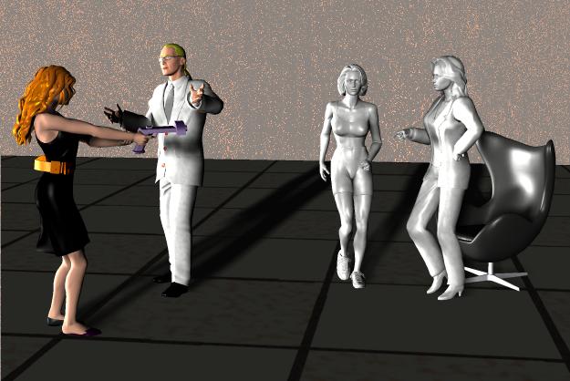 Chief Meyers was reaching for the intercom button in the room when Gorgun stuck her with the fingernail. Her eyes were wide with fear as she froze with her fingers mere inches from the button, her legs spread forwards. After a second she joined the other officers in the realm of marble statues. Smiling, Gorgun pressed her nail again, deactivating the secret device on top of it. Appearing like a normal fingernail, if it was pressed down it could petrify anything it touched. Melissa had received it from her visitor a day earlier, an errand boy for the man who'd invented her raygun.