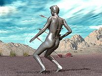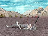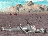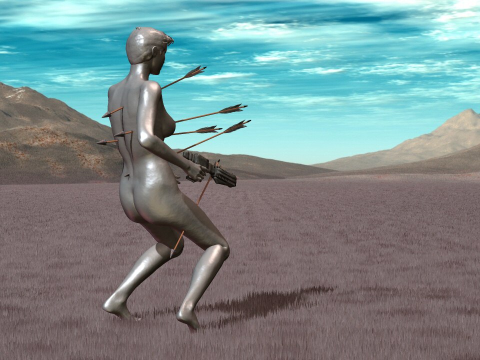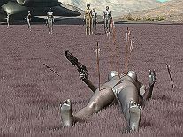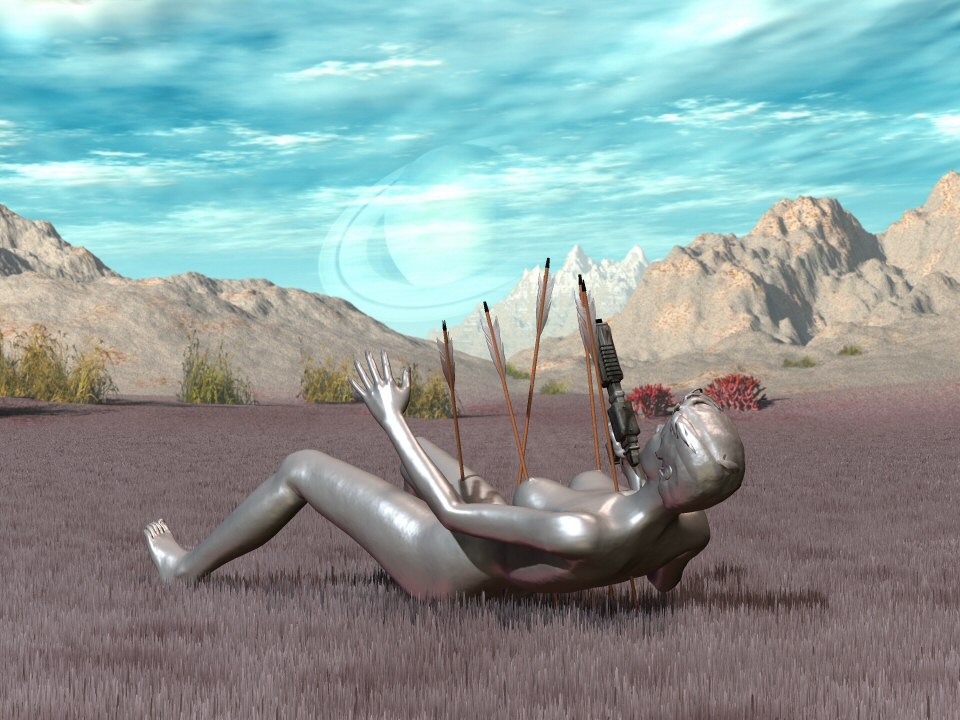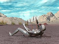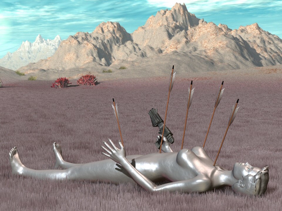 In mechanical slow motion, the debilitated gynoid lay down on the ground. |