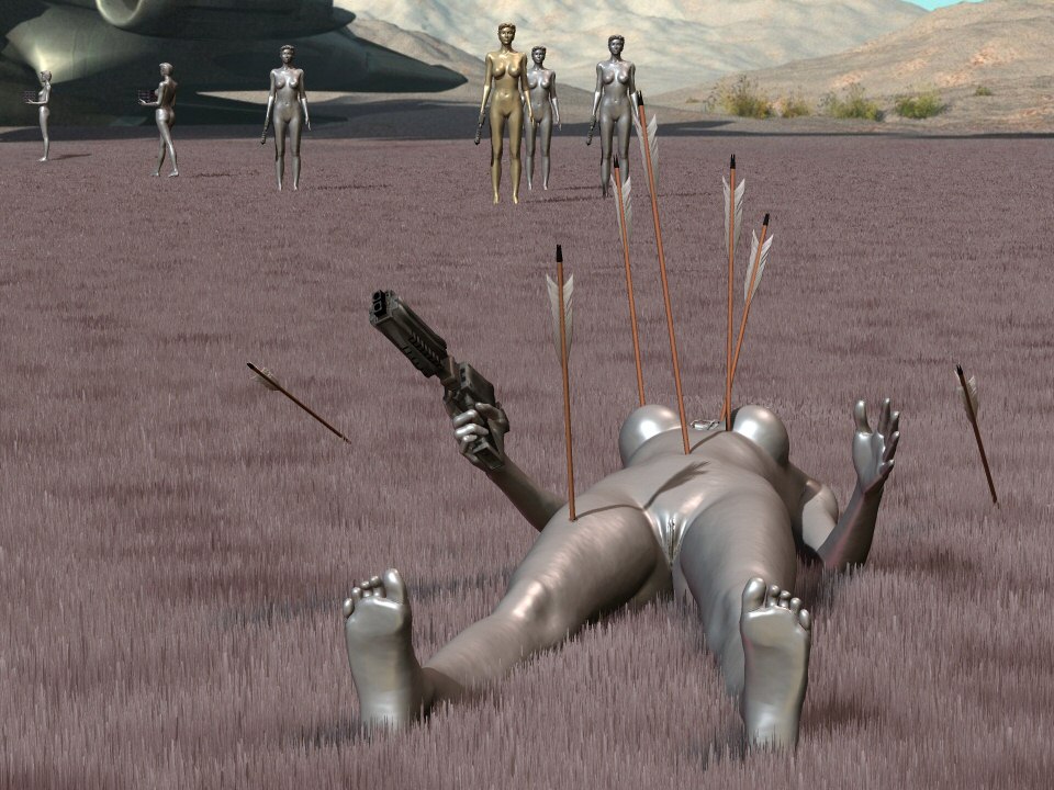 The amazons had slain one of the invading metal-women. |