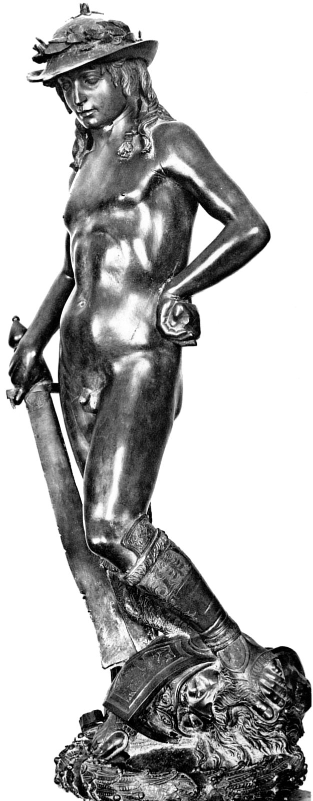 The right foot is planted on a wing. Bent back in ease Upon a supple knee — the toes curl a little, grasping The crag upon which they are set in triumph — The left leg glides toward, the left foot lies upon A head. The head’s other wing (the head is bearded And winged and helmeted and bodiless) Grows like a swan’s wing up inside the leg; Clothes, as the suit of a swan-maiden clothes, The leg. The wing reaches, almost, to the rounded Small childish buttocks. The dead wing warms the leg, The dead wing, crushed beneath the foot, is swan’s-down. Pillowed upon the rock, Goliath’s head Lies under the foot of David. |  |