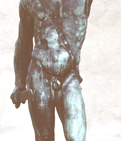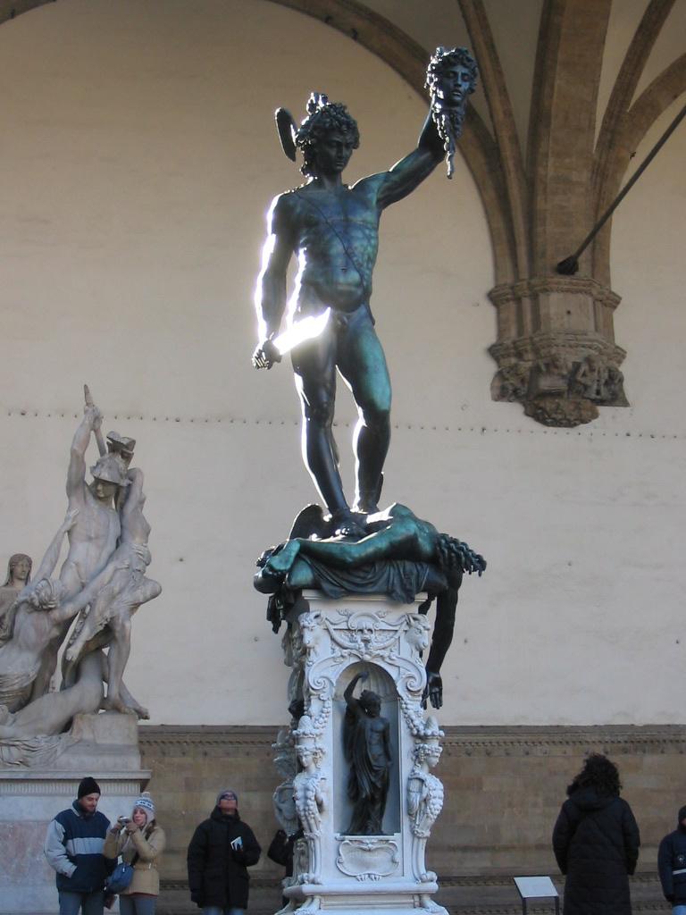 Across his chest and back Perseus is wearing a sash inscribed with the sculptor’s name and the date of the statue’s casting. Of course that’s a complete paradox because, had Perseus been real, he couldn’t have known he was going to be sculpted by Cellini, or when; and even if he did, there was no way he could have been wearing something that had an inscription in Latin!