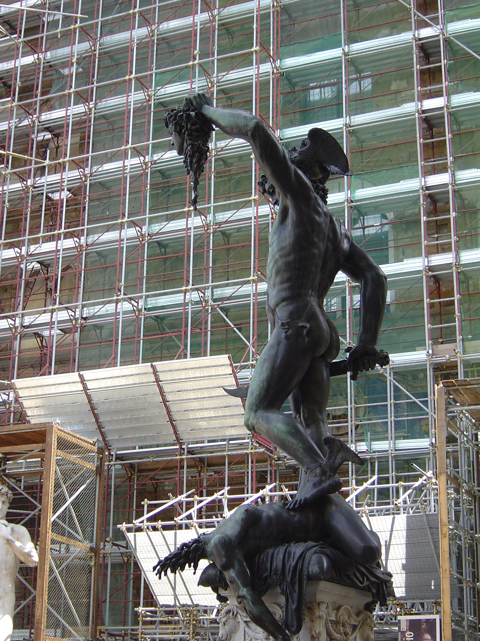 Post-restoration In late 1996 the statue was taken to the Uffizi museum for a thorough programme of cleaning and restoration. This was a slow, painstaking process, but the statue was returned to the square in plenty of time for Cellini’s 500th birthday in 2000. Nowadays they allow all sorts of ruffians to wander around the city wielding digital cameras, and below you’ll find just a few of the pictures those cameras have obtained of the cleaned and restored statue.File size warning! Most people have decent broadband these days, but to anyone who happens not to, I apologise for the long wait you’re going to have before some of these images load.