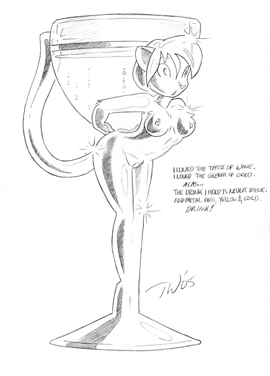 Note by Leem: The two “Gold Chalice” pictures are based on this picture by Naga. The Naga’s Den site features many types of transformation, including inanimate, although that particular early image can no longer be found there. This is not the first time that Taral has taken inspiration from Naga, and you’ll also find some of Naga’s work on this site. In the Cat version Taral adds a new design element, namely the girl’s tail, which becomes a handle for the chalice. The self-described doggerel that accompanies the picture was of course written by Taral himself.