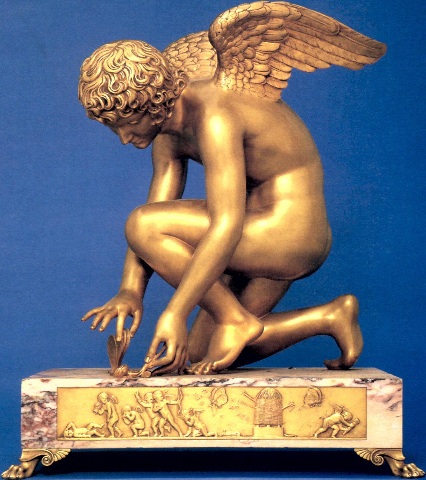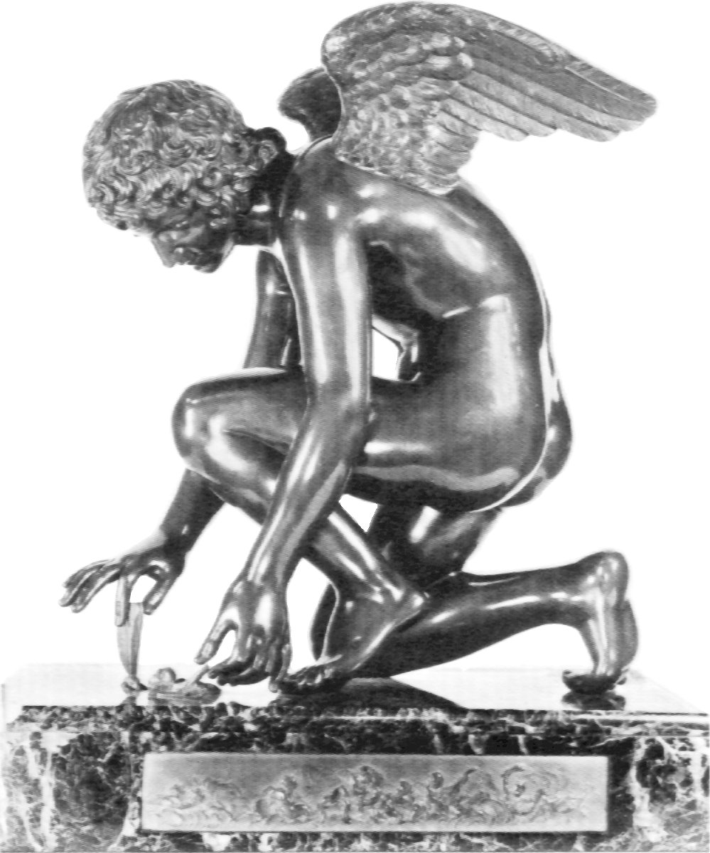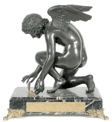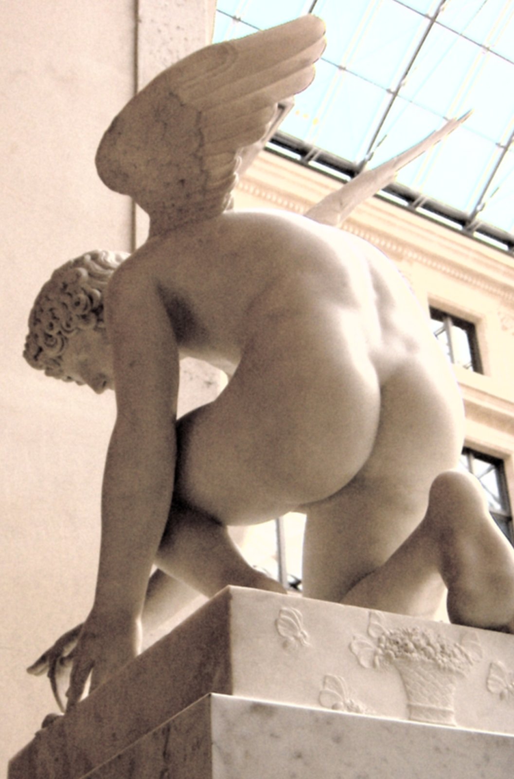 Views of the original marble and bronze reproductions Chaudet’s Cupid is featured in my adult story “On Display” Antoine-Denis Chaudet is probably best known for his statue of Cupid, now in the Louvre. His other works include the column in the Place Vendôme, Paris, and his busts of Napoleon and the Empress Josephine. Chaudet exhibited a plaster model of his Cupid at the Paris Salon of 1802. The sculptor died in 1810, and it was not until 1817 that the life-size marble statue was completed from the original model by Pierre Cartellier. The butterfly may represent the human soul tormented by love. Alternatively it may represent Cupid’s mortal lover Psyche who had to face many trials before winning his hand and being accepted by the gods (‘psyche’ is Greek for both ‘butterfly’ and ‘soul’.) Below: several views of the original statue. Most pictures show it from the left side in order to display Cupid’s graceful pose. Many thanks to Anonymous Benefactor for supplying some additional poses.