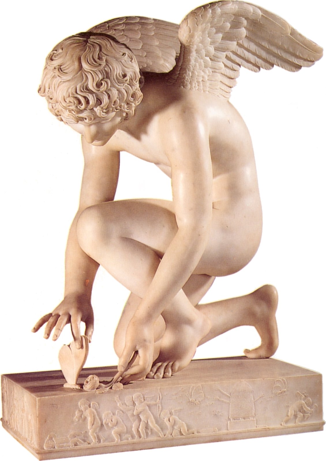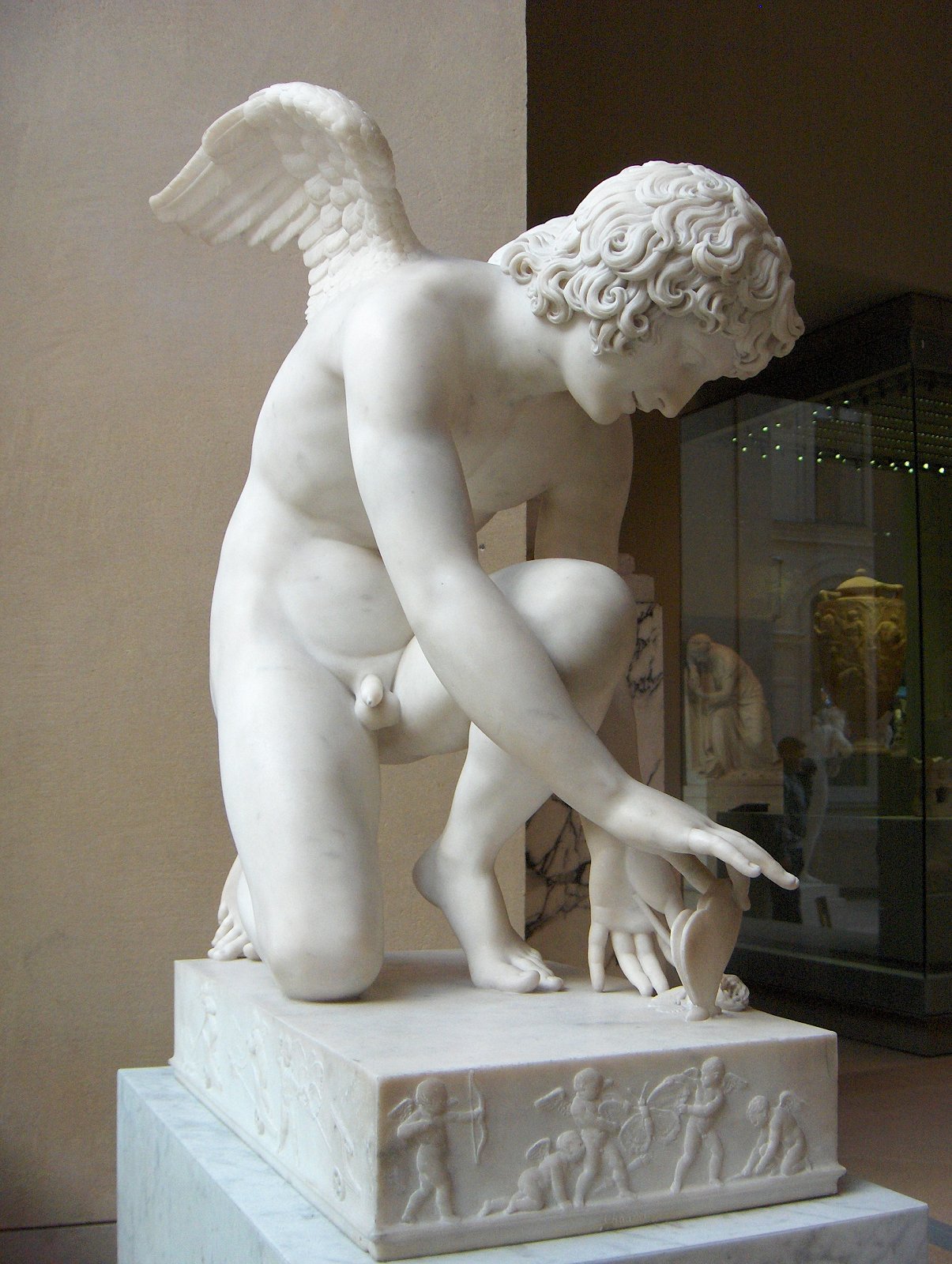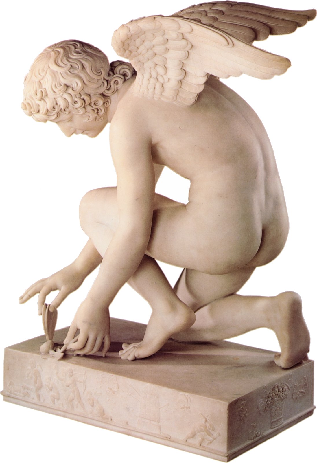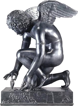 Views of the original marble and bronze reproductions Chaudet’s Cupid is featured in my adult story “On Display” Antoine-Denis Chaudet is probably best known for his statue of Cupid, now in the Louvre. His other works include the column in the Place Vendôme, Paris, and his busts of Napoleon and the Empress Josephine. Chaudet exhibited a plaster model of his Cupid at the Paris Salon of 1802. The sculptor died in 1810, and it was not until 1817 that the life-size marble statue was completed from the original model by Pierre Cartellier. The butterfly may represent the human soul tormented by love. Alternatively it may represent Cupid’s mortal lover Psyche who had to face many trials before winning his hand and being accepted by the gods (‘psyche’ is Greek for both ‘butterfly’ and ‘soul’.) Below: several views of the original statue. Most pictures show it from the left side in order to display Cupid’s graceful pose. Many thanks to Anonymous Benefactor for supplying some additional poses.