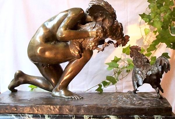 The boys’ poses in the two works are so similar that it is tempting to think the painting inspired the statue. I’ve also read a suggestion that the boy in Gérôme’s Cockfight was inspired by the pose of Antoine-Denis Chaudet’s Cupid. Interesting to think that a statue may have inspired a painting that inspired a statue. What goes around.... Comment on this page Site Introduction | Art Gallery Index | Return to Top of Page | |||||||||||||||||