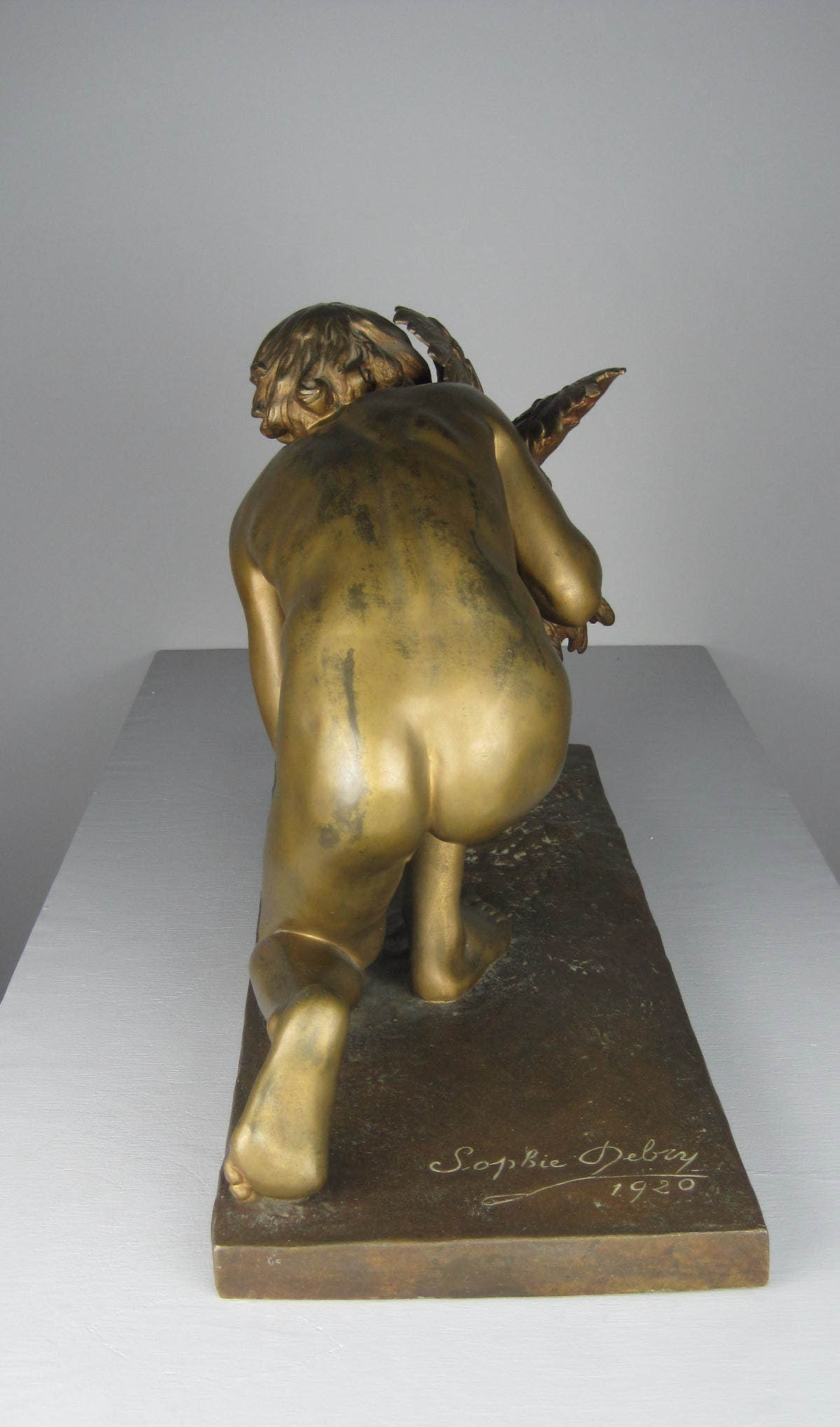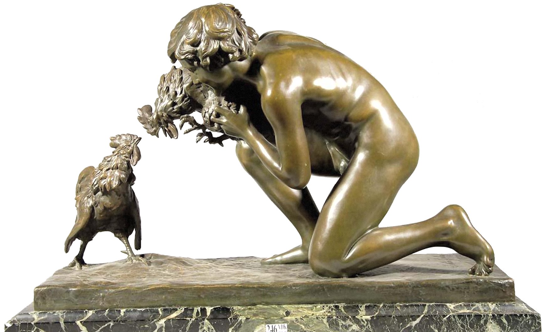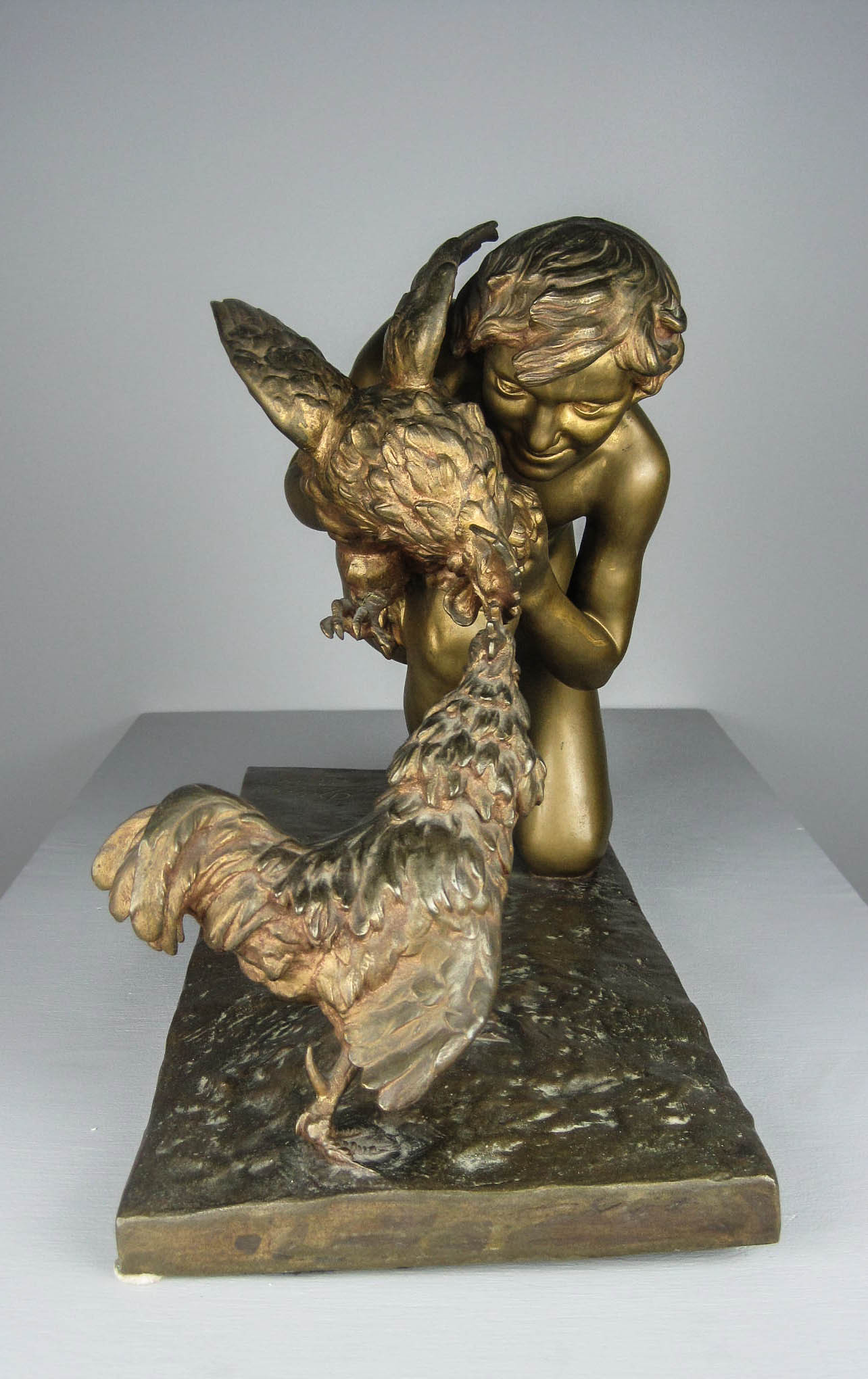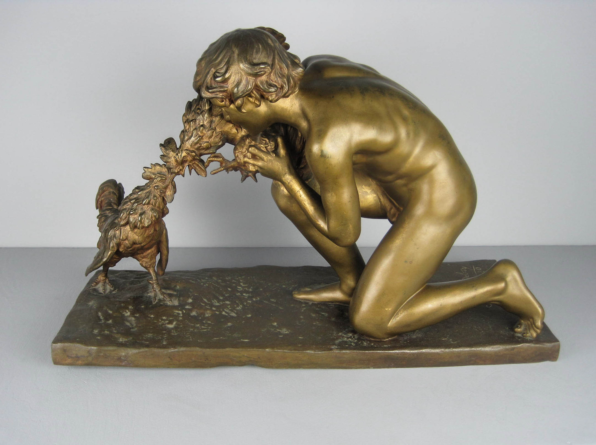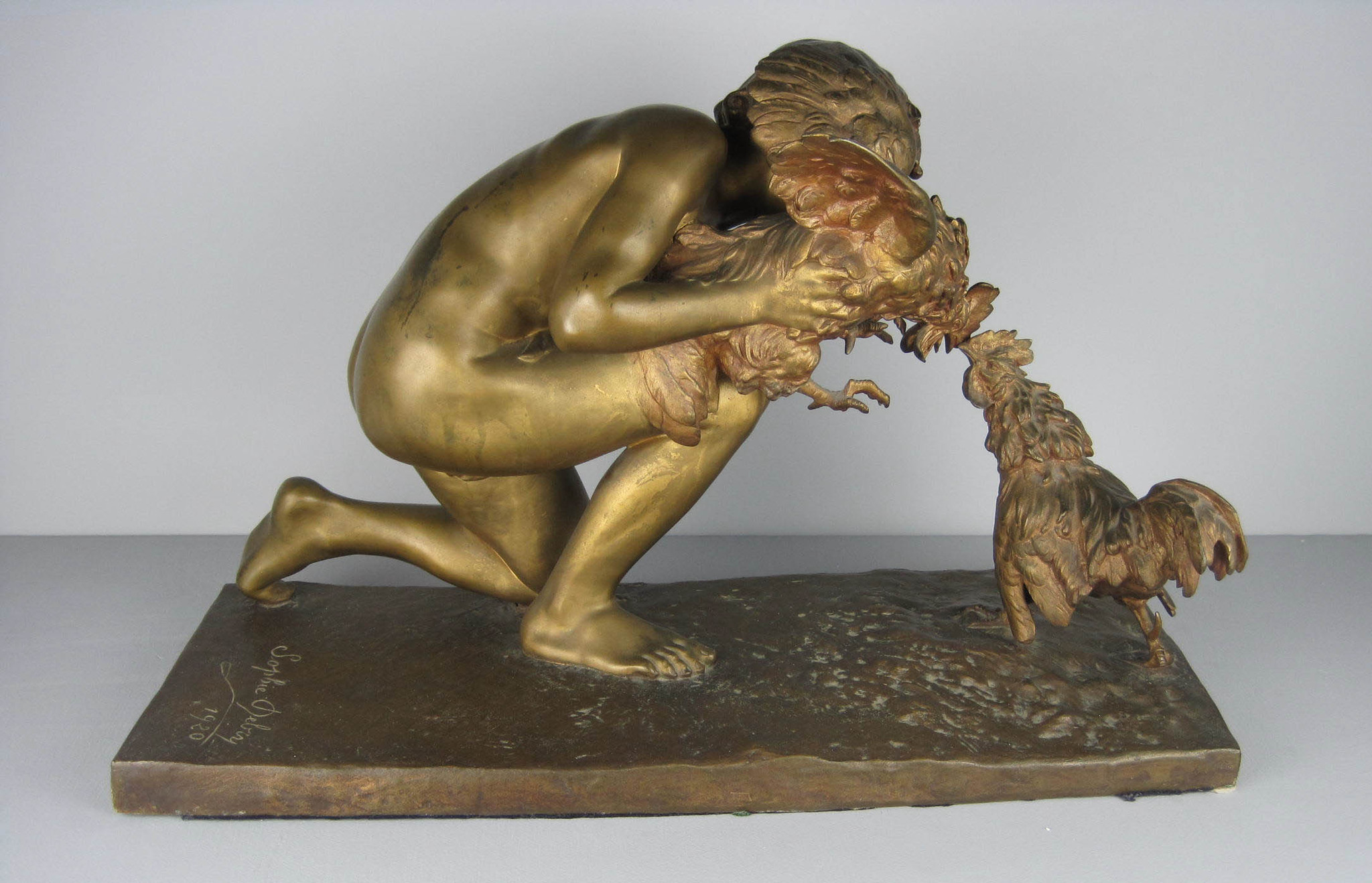 Magnificent antique bronze of "the cockfight" (sic) by Sophie-Victoire Debry, a French female sculptor. The work was exhibited in the Paris Salons of 1920 and she received an honorable mention for it. It is signed by the artist, dated 1920 and has the foundry mark on it. The marble base is 62.5 cm x 28 cm. The total height is 41 cm. I hope I won’t be considered sexist for saying how surprised I was to find a woman excelling at what I’d long regarded as an exclusively male profession. Other works inspired by cock fighting include Jean Léon Gérôme’s painting Le Combat de Coq (The Cockfight) and Jean-Alexandre Falguière’s statue The Winner of the Cockfight. Of course all of these works downplay the inherent violence of cock fighting, and instead concentrate on the pretty bodies of the birds’ owners.