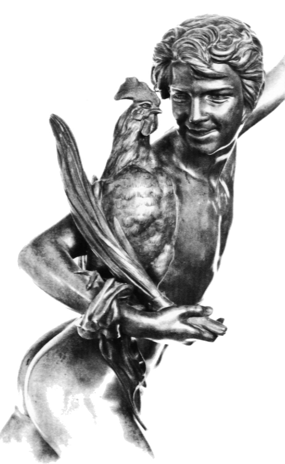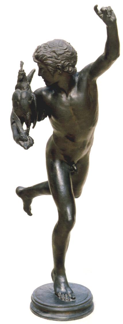 Falguière’s Cockfight: statuette versions Like most 19th Century French statues, Falguière’s Cockfight was reproduced in statuettes of various sizes. Unlike the full-size version, the statuettes conceal the boy’s genitalia with a small piece of drapery. One engraving of the statue depicts a long drape which hangs from the boy’s right wrist to the base, but this may have been added to the engraving as a piece of censorship.