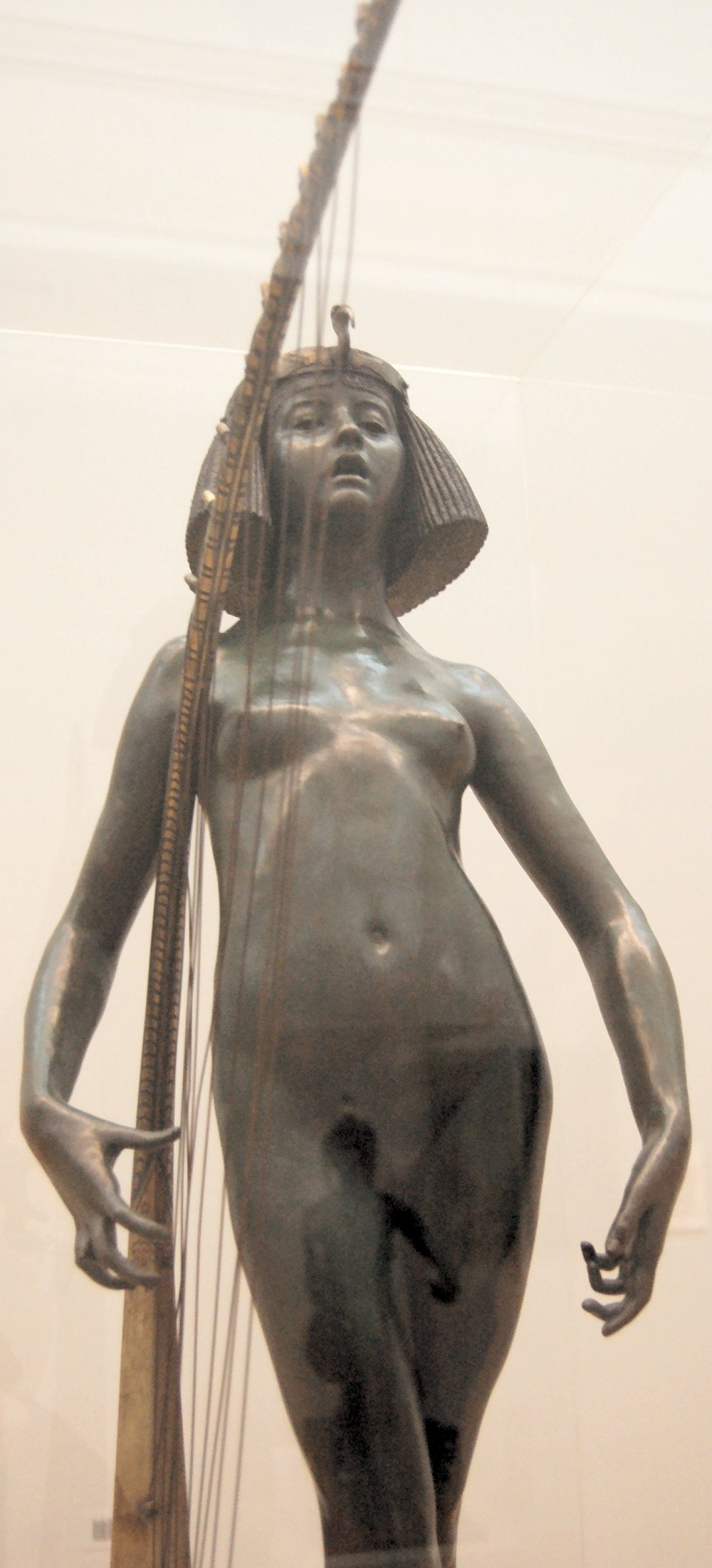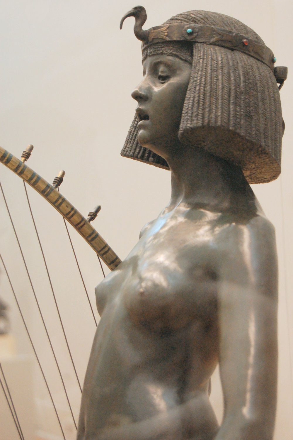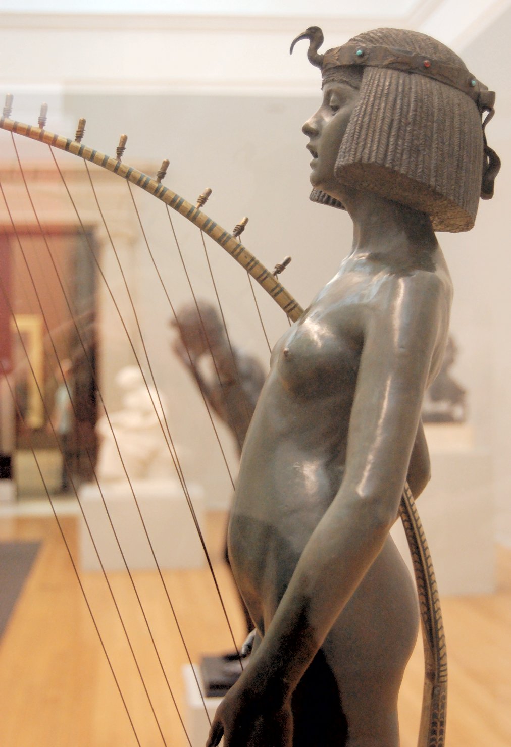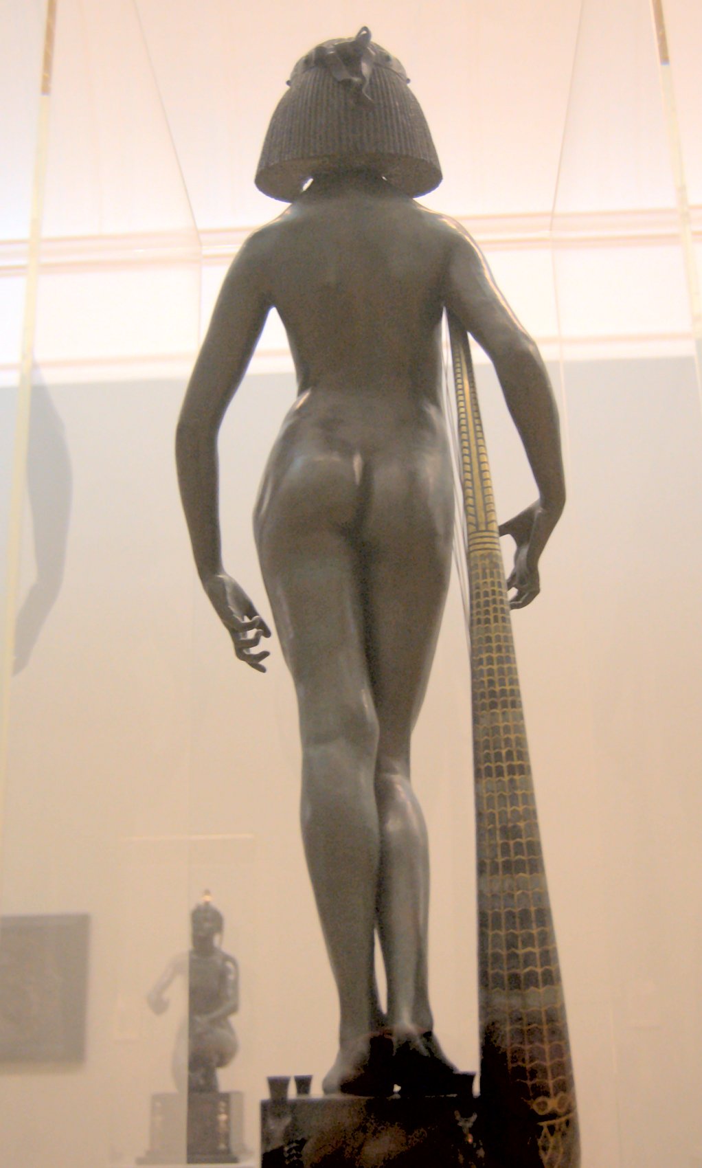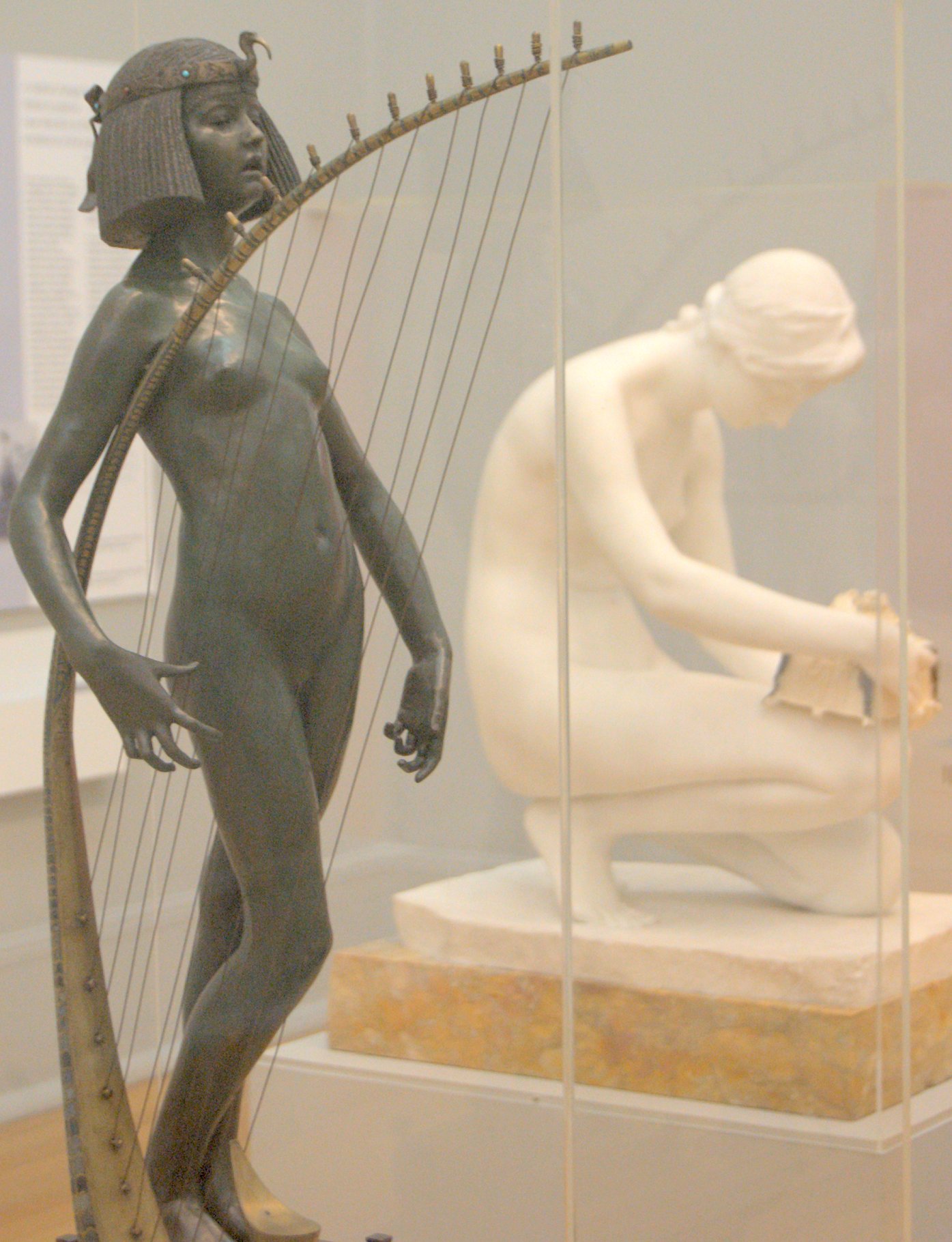 ![]() ![]() ![]() ![]() ![]() ![]() ![]() ![]() This 1893 companion piece to The Singer doesn’t seem to appear in many vintage art books, at least not the ones where I found the older photos of The Singer. Unlike The Singer, which was part of the original Tate collection, Applause used to be privately-owned and was hardly ever displayed. She was later acquired by the Tate and, her appearance there in the summer of 2010 was a rare opportunity for me to photograph her. Admittedly these images suffer from the same problems as my other Tate pictures, but apart from one small image on the official Tate website and a few more on Flickr, these were for a time be the only photos you could find of her anywhere. Finally in December 2012 she went back on permanent display at the Tate’s BP Walk Through British Art galleries - though frustratingly, The Singer has not been put back on display with her. One of the following shots (see if you can spot which one) was taken while the room was being prepared, before she was put back in her glass case. As for the rest, by using a wide angle lens, and wearing dark clothing and gloves, I was able to avoid some of the reflection problems I’d previously experienced with the glass, although in some views the wide angle makes her hands look freakishly big. ![]() ![]() ![]() ![]() ![]() ![]() ![]() ![]() ![]() ![]() ![]() ![]() ![]() ![]() ![]() ![]() Some rare old engravings show the statue on a tall pedestal, just like her ‘sister’. It would be fascinating to see the two statues displayed that way, but I guess it wasn’t practical, even assuming the pedestals still exist. As you can see, this girl also has a headdress and coronet, this time decorated with cobras (representing the Nile, apparently), and also sits on a sculpted pedestal. Although not as finely-detailed as The Singer, there’s still a lot to enjoy about this piece. ![]() This is a contrast-enhanced photo of the rear of the pedestal, showing two statuettes of Egyptian goddesses, and a hidden image that hopefully shouldn’t be too hard to make out... ![]() Amongst the Egyptian-style engravings on the sides of the pedestal (the left side is a mirror-image of the right) are two figures, one of which looks suspiciously similar to Applause herself, and the other of which is indubitably The Singer. The engraved Singer seems to have been promoted to lead singer in the band. Good for her. ![]() ![]() ![]() ![]() Finally, here’s a comparison between a real panel from an Ancient Egyptian tomb painting, now in the Metropolitan Museum of Art, New York, and the top row of musicians on the base of Applause. Note the similarities between the clothing (what there is of it!), decoration, headdresses and musical instruments, demonstrating that Ford had done some research on his subject. ![]() Dating from roughly the same period, French sculptress Jeanne Itasse’s statue Egyptian Harpist uses similar subject matter to Ford’s Egyptian girls. Unfortunately I’ve only been able to find one vintage photo of it, and it’s possible that it may not have survived the upheavals of the 20th century, which would be a shame. ![]() Meanwhile, rounding off this look at the two girls, here’s a comparison of their faces in profile. You’ll notice that in both cases the camera chose to focus on the foreground, so their headpieces came out sharper than their actual faces. ![]() Folly (1886) Tate Britain Gallery, London, August-September 2010.