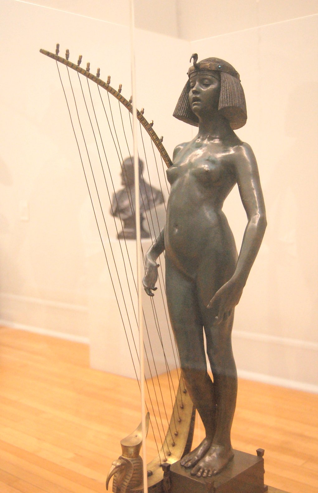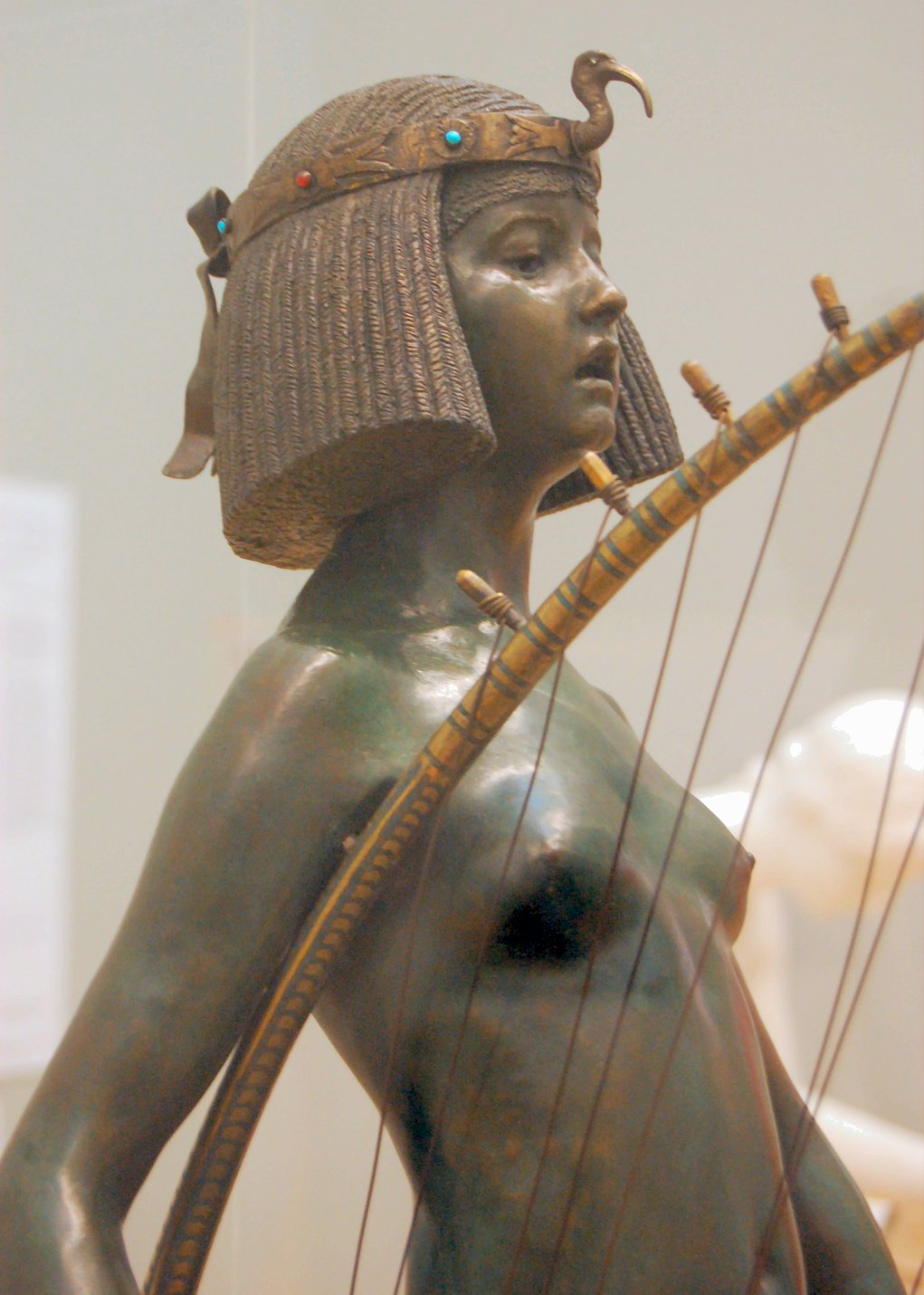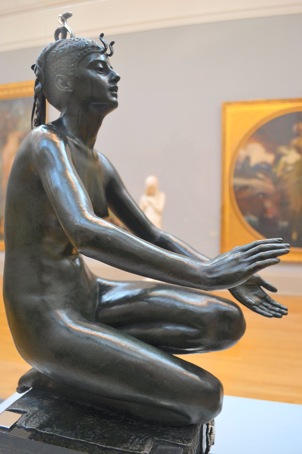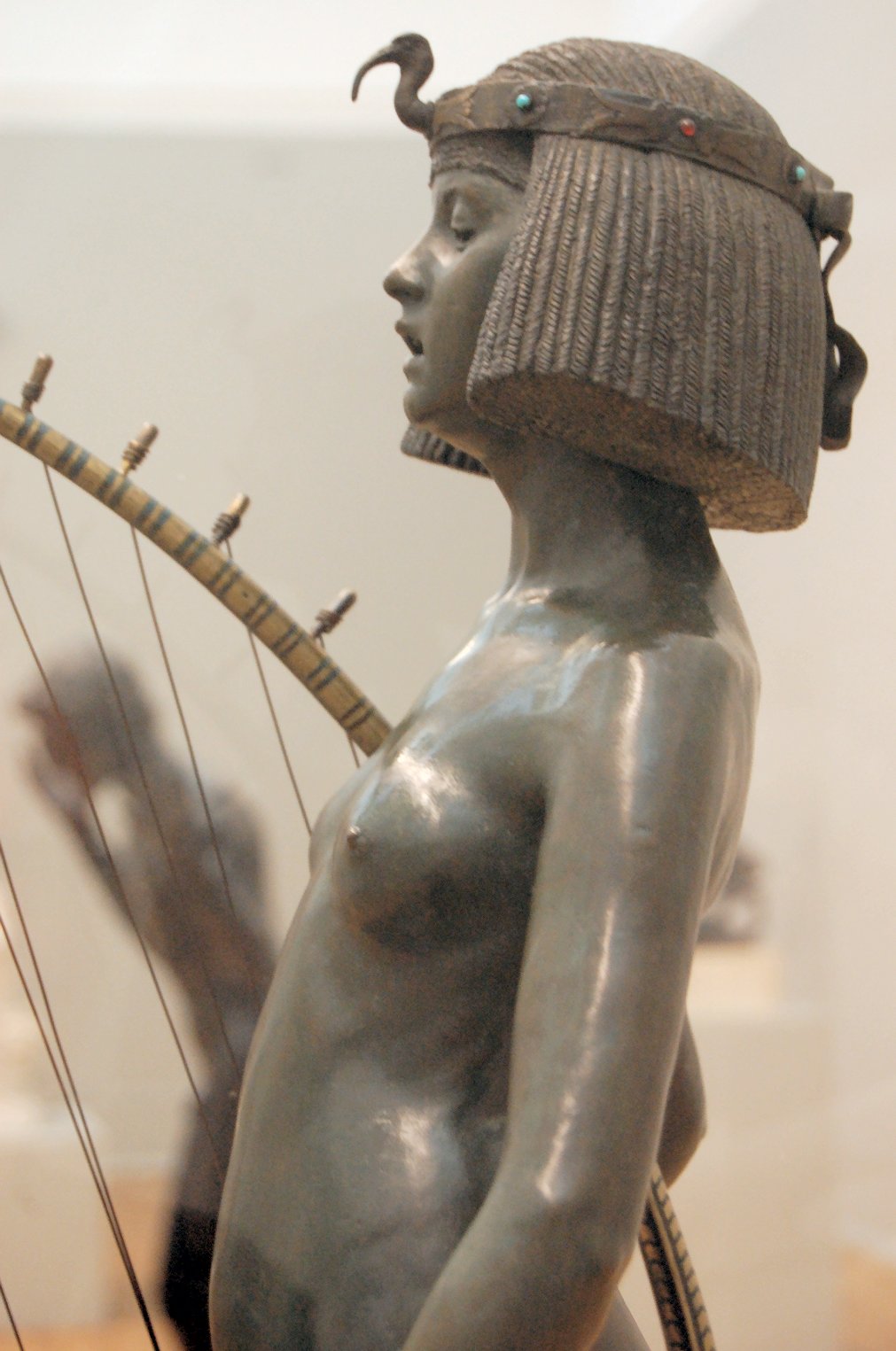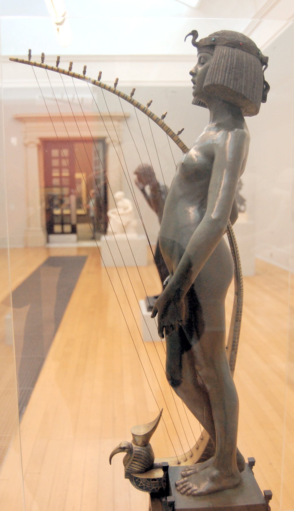![]() ![]() ![]() ![]() ![]() ![]() ![]() ![]() This 1893 companion piece to The Singer doesn’t seem to appear in many vintage art books, at least not the ones where I found the older photos of The Singer. Unlike The Singer, which was part of the original Tate collection, Applause used to be privately-owned and was hardly ever displayed. She was later acquired by the Tate and, her appearance there in the summer of 2010 was a rare opportunity for me to photograph her. Admittedly these images suffer from the same problems as my other Tate pictures, but apart from one small image on the official Tate website and a few more on Flickr, these were for a time be the only photos you could find of her anywhere. Finally in December 2012 she went back on permanent display at the Tate’s BP Walk Through British Art galleries - though frustratingly, The Singer has not been put back on display with her. One of the following shots (see if you can spot which one) was taken while the room was being prepared, before she was put back in her glass case. As for the rest, by using a wide angle lens, and wearing dark clothing and gloves, I was able to avoid some of the reflection problems I’d previously experienced with the glass, although in some views the wide angle makes her hands look freakishly big. ![]() ![]() ![]() ![]() ![]() ![]() ![]() ![]() ![]() ![]() ![]() ![]() ![]() ![]() ![]() ![]() Some rare old engravings show the statue on a tall pedestal, just like her ‘sister’. It would be fascinating to see the two statues displayed that way, but I guess it wasn’t practical, even assuming the pedestals still exist. As you can see, this girl also has a headdress and coronet, this time decorated with cobras (representing the Nile, apparently), and also sits on a sculpted pedestal. Although not as finely-detailed as The Singer, there’s still a lot to enjoy about this piece. ![]() This is a contrast-enhanced photo of the rear of the pedestal, showing two statuettes of Egyptian goddesses, and a hidden image that hopefully shouldn’t be too hard to make out... ![]() Amongst the Egyptian-style engravings on the sides of the pedestal (the left side is a mirror-image of the right) are two figures, one of which looks suspiciously similar to Applause herself, and the other of which is indubitably The Singer. The engraved Singer seems to have been promoted to lead singer in the band. Good for her. ![]() ![]() ![]() ![]() Finally, here’s a comparison between a real panel from an Ancient Egyptian tomb painting, now in the Metropolitan Museum of Art, New York, and the top row of musicians on the base of Applause. Note the similarities between the clothing (what there is of it!), decoration, headdresses and musical instruments, demonstrating that Ford had done some research on his subject. ![]() Dating from roughly the same period, French sculptress Jeanne Itasse’s statue Egyptian Harpist uses similar subject matter to Ford’s Egyptian girls. Unfortunately I’ve only been able to find one vintage photo of it, and it’s possible that it may not have survived the upheavals of the 20th century, which would be a shame. ![]() Meanwhile, rounding off this look at the two girls, here’s a comparison of their faces in profile. You’ll notice that in both cases the camera chose to focus on the foreground, so their headpieces came out sharper than their actual faces. ![]() Folly (1886) Tate Britain Gallery, London, August-September 2010.