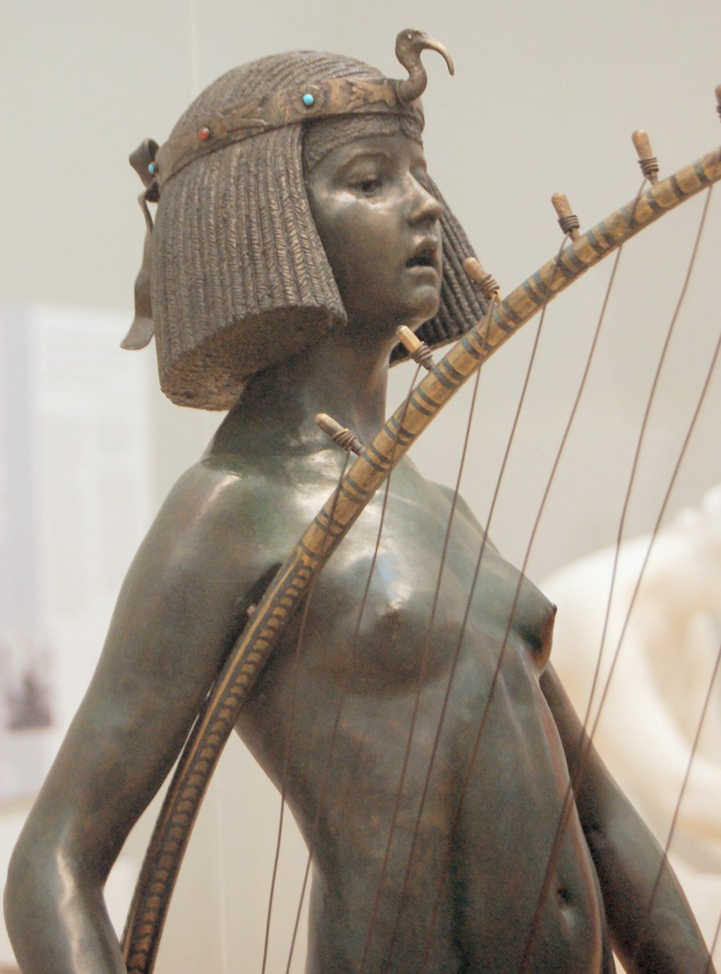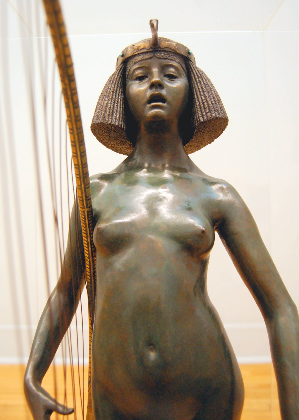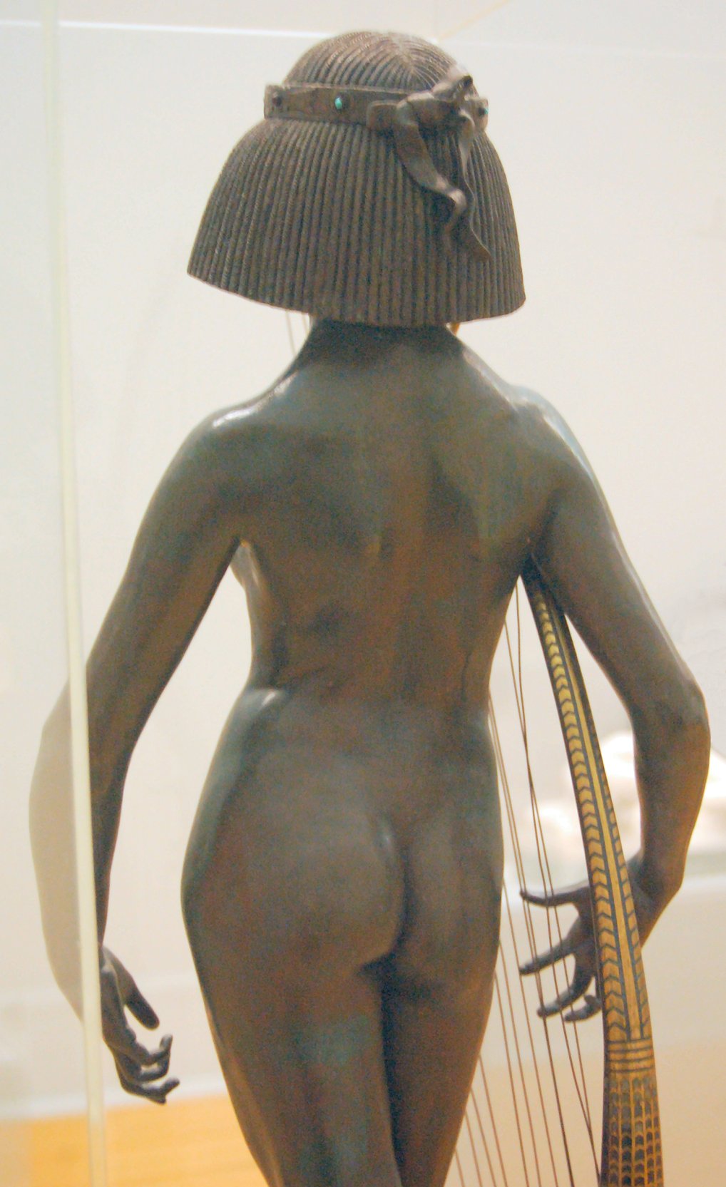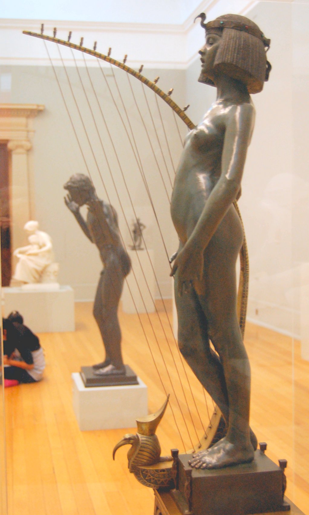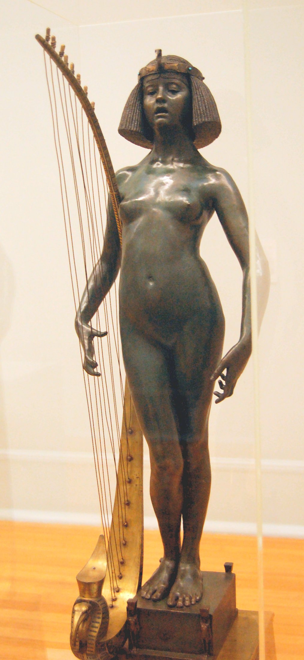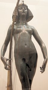 ![]() ![]() ![]() ![]() ![]() ![]() ![]() ![]() This 1893 companion piece to The Singer doesn’t seem to appear in many vintage art books, at least not the ones where I found the older photos of The Singer. Unlike The Singer, which was part of the original Tate collection, Applause used to be privately-owned and was hardly ever displayed. She was later acquired by the Tate and, her appearance there in the summer of 2010 was a rare opportunity for me to photograph her. Admittedly these images suffer from the same problems as my other Tate pictures, but apart from one small image on the official Tate website and a few more on Flickr, these were for a time be the only photos you could find of her anywhere. Finally in December 2012 she went back on permanent display at the Tate’s BP Walk Through British Art galleries - though frustratingly, The Singer has not been put back on display with her. One of the following shots (see if you can spot which one) was taken while the room was being prepared, before she was put back in her glass case. As for the rest, by using a wide angle lens, and wearing dark clothing and gloves, I was able to avoid some of the reflection problems I’d previously experienced with the glass, although in some views the wide angle makes her hands look freakishly big. ![]() ![]() ![]() ![]() ![]() ![]() ![]() ![]() ![]() ![]() ![]() ![]() ![]() ![]() ![]() ![]() Some rare old engravings show the statue on a tall pedestal, just like her ‘sister’. It would be fascinating to see the two statues displayed that way, but I guess it wasn’t practical, even assuming the pedestals still exist. As you can see, this girl also has a headdress and coronet, this time decorated with cobras (representing the Nile, apparently), and also sits on a sculpted pedestal. Although not as finely-detailed as The Singer, there’s still a lot to enjoy about this piece. ![]() This is a contrast-enhanced photo of the rear of the pedestal, showing two statuettes of Egyptian goddesses, and a hidden image that hopefully shouldn’t be too hard to make out... ![]() Amongst the Egyptian-style engravings on the sides of the pedestal (the left side is a mirror-image of the right) are two figures, one of which looks suspiciously similar to Applause herself, and the other of which is indubitably The Singer. The engraved Singer seems to have been promoted to lead singer in the band. Good for her. ![]() ![]() ![]() ![]() Finally, here’s a comparison between a real panel from an Ancient Egyptian tomb painting, now in the Metropolitan Museum of Art, New York, and the top row of musicians on the base of Applause. Note the similarities between the clothing (what there is of it!), decoration, headdresses and musical instruments, demonstrating that Ford had done some research on his subject. ![]() Dating from roughly the same period, French sculptress Jeanne Itasse’s statue Egyptian Harpist uses similar subject matter to Ford’s Egyptian girls. Unfortunately I’ve only been able to find one vintage photo of it, and it’s possible that it may not have survived the upheavals of the 20th century, which would be a shame. ![]() Meanwhile, rounding off this look at the two girls, here’s a comparison of their faces in profile. You’ll notice that in both cases the camera chose to focus on the foreground, so their headpieces came out sharper than their actual faces. ![]() Folly (1886) Tate Britain Gallery, London, August-September 2010.