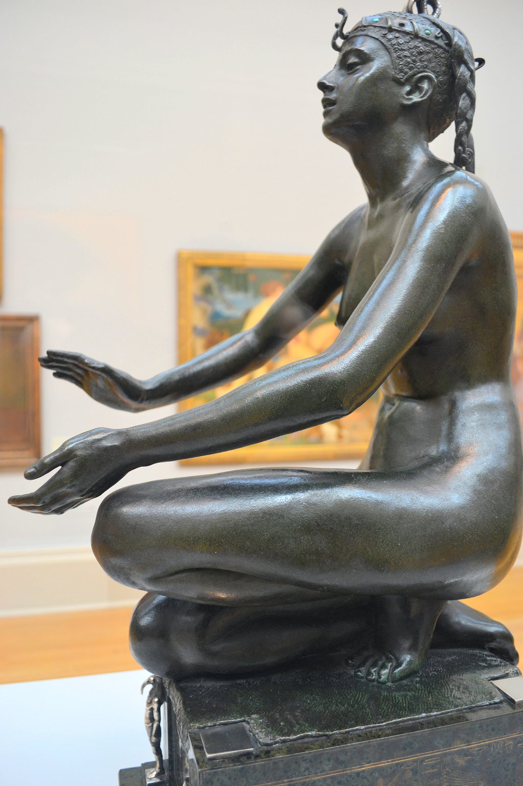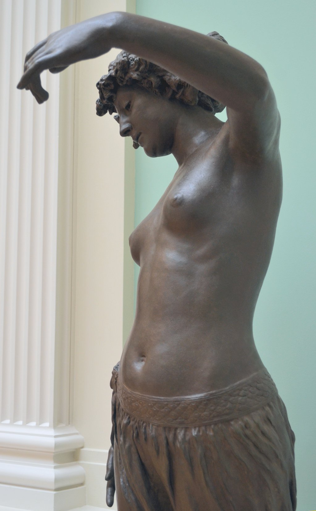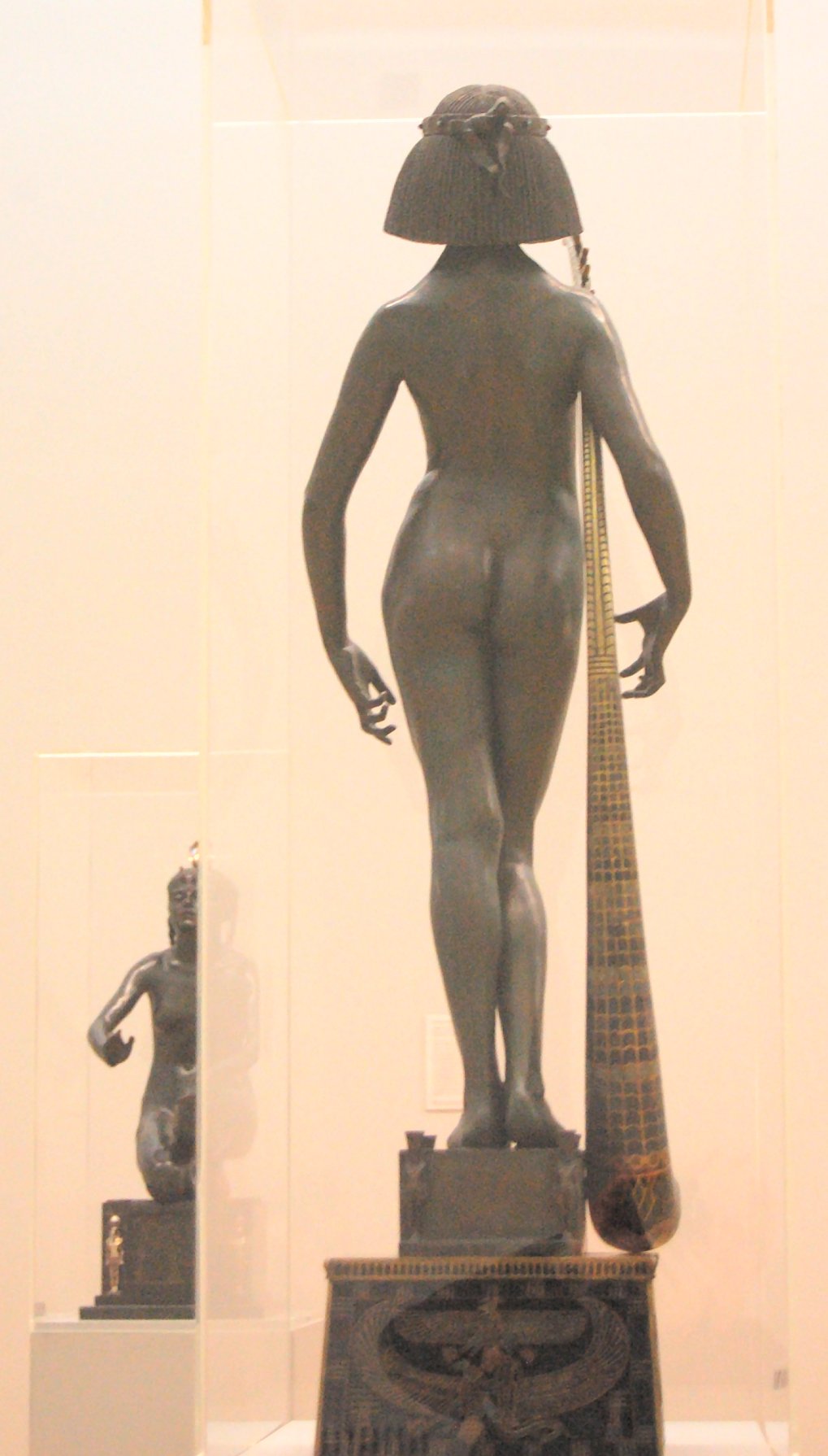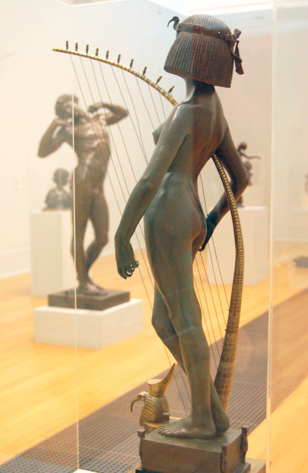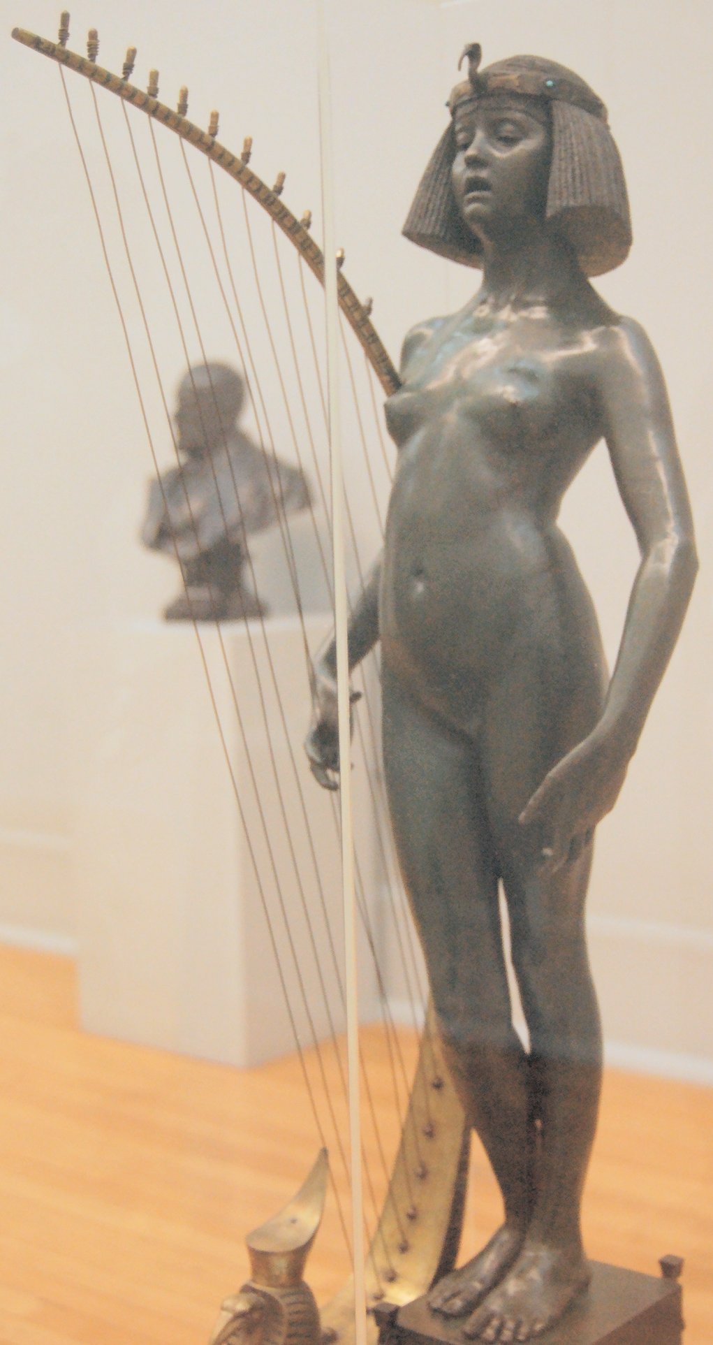 ![]() ![]() ![]() ![]() ![]() ![]() ![]() ![]() This 1893 companion piece to The Singer doesn’t seem to appear in many vintage art books, at least not the ones where I found the older photos of The Singer. Unlike The Singer, which was part of the original Tate collection, Applause used to be privately-owned and was hardly ever displayed. She was later acquired by the Tate and, her appearance there in the summer of 2010 was a rare opportunity for me to photograph her. Admittedly these images suffer from the same problems as my other Tate pictures, but apart from one small image on the official Tate website and a few more on Flickr, these were for a time be the only photos you could find of her anywhere. Finally in December 2012 she went back on permanent display at the Tate’s BP Walk Through British Art galleries - though frustratingly, The Singer has not been put back on display with her. One of the following shots (see if you can spot which one) was taken while the room was being prepared, before she was put back in her glass case. As for the rest, by using a wide angle lens, and wearing dark clothing and gloves, I was able to avoid some of the reflection problems I’d previously experienced with the glass, although in some views the wide angle makes her hands look freakishly big. ![]() ![]() ![]() ![]() ![]() ![]() ![]() ![]() ![]() ![]() ![]() ![]() ![]() ![]() ![]() ![]() Some rare old engravings show the statue on a tall pedestal, just like her ‘sister’. It would be fascinating to see the two statues displayed that way, but I guess it wasn’t practical, even assuming the pedestals still exist. As you can see, this girl also has a headdress and coronet, this time decorated with cobras (representing the Nile, apparently), and also sits on a sculpted pedestal. Although not as finely-detailed as The Singer, there’s still a lot to enjoy about this piece. ![]() This is a contrast-enhanced photo of the rear of the pedestal, showing two statuettes of Egyptian goddesses, and a hidden image that hopefully shouldn’t be too hard to make out... ![]() Amongst the Egyptian-style engravings on the sides of the pedestal (the left side is a mirror-image of the right) are two figures, one of which looks suspiciously similar to Applause herself, and the other of which is indubitably The Singer. The engraved Singer seems to have been promoted to lead singer in the band. Good for her. ![]() ![]() ![]() ![]() Finally, here’s a comparison between a real panel from an Ancient Egyptian tomb painting, now in the Metropolitan Museum of Art, New York, and the top row of musicians on the base of Applause. Note the similarities between the clothing (what there is of it!), decoration, headdresses and musical instruments, demonstrating that Ford had done some research on his subject. ![]() Dating from roughly the same period, French sculptress Jeanne Itasse’s statue Egyptian Harpist uses similar subject matter to Ford’s Egyptian girls. Unfortunately I’ve only been able to find one vintage photo of it, and it’s possible that it may not have survived the upheavals of the 20th century, which would be a shame. ![]() Meanwhile, rounding off this look at the two girls, here’s a comparison of their faces in profile. You’ll notice that in both cases the camera chose to focus on the foreground, so their headpieces came out sharper than their actual faces. ![]() Folly (1886) Tate Britain Gallery, London, August-September 2010.
