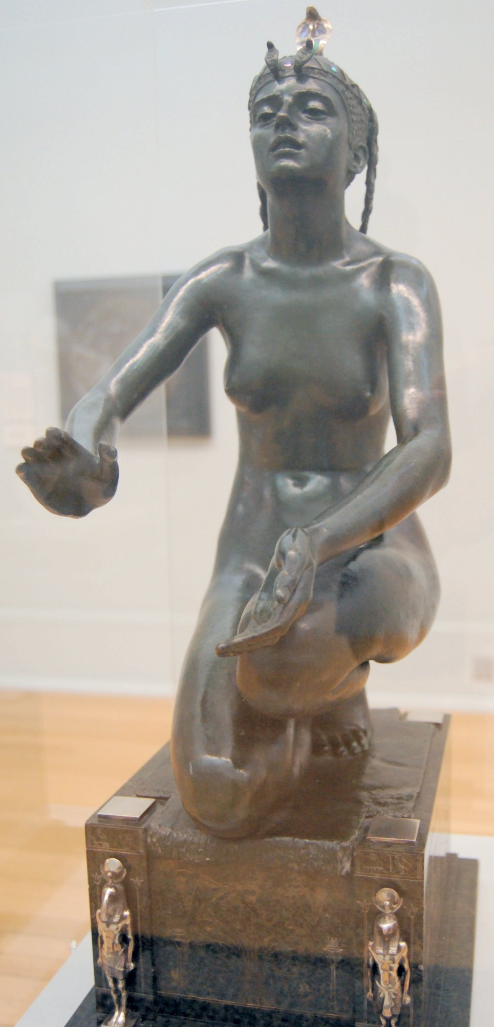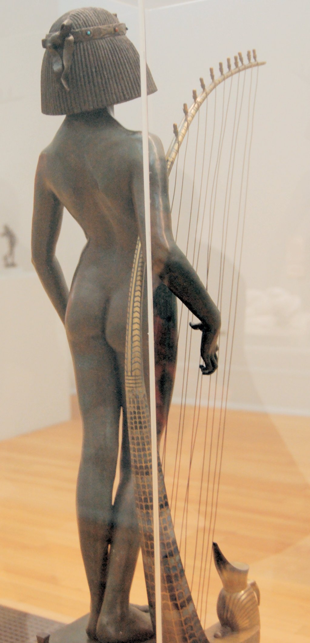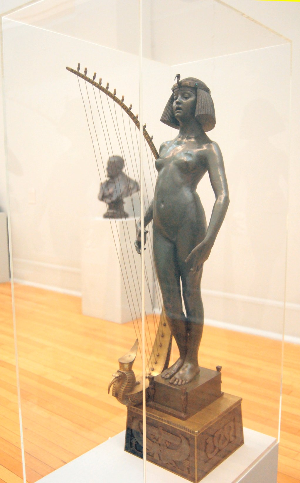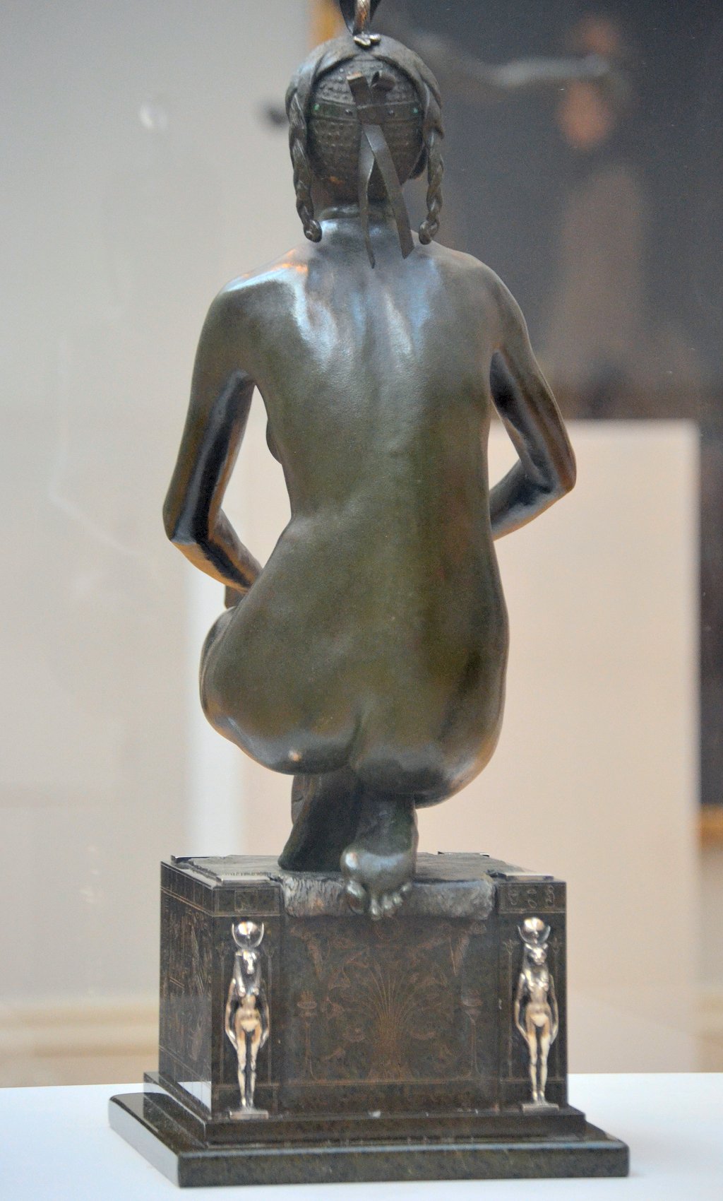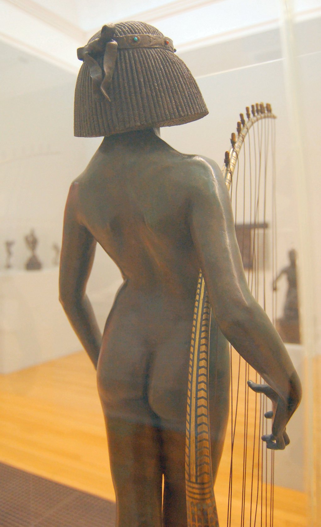 ![]() ![]() ![]() ![]() ![]() ![]() ![]() ![]() This 1893 companion piece to The Singer doesn’t seem to appear in many vintage art books, at least not the ones where I found the older photos of The Singer. Unlike The Singer, which was part of the original Tate collection, Applause used to be privately-owned and was hardly ever displayed. She was later acquired by the Tate and, her appearance there in the summer of 2010 was a rare opportunity for me to photograph her. Admittedly these images suffer from the same problems as my other Tate pictures, but apart from one small image on the official Tate website and a few more on Flickr, these were for a time be the only photos you could find of her anywhere. Finally in December 2012 she went back on permanent display at the Tate’s BP Walk Through British Art galleries - though frustratingly, The Singer has not been put back on display with her. One of the following shots (see if you can spot which one) was taken while the room was being prepared, before she was put back in her glass case. As for the rest, by using a wide angle lens, and wearing dark clothing and gloves, I was able to avoid some of the reflection problems I’d previously experienced with the glass, although in some views the wide angle makes her hands look freakishly big. ![]() ![]() ![]() ![]() ![]() ![]() ![]() ![]() ![]() ![]() ![]() ![]() ![]() ![]() ![]() ![]() Some rare old engravings show the statue on a tall pedestal, just like her ‘sister’. It would be fascinating to see the two statues displayed that way, but I guess it wasn’t practical, even assuming the pedestals still exist. As you can see, this girl also has a headdress and coronet, this time decorated with cobras (representing the Nile, apparently), and also sits on a sculpted pedestal. Although not as finely-detailed as The Singer, there’s still a lot to enjoy about this piece. ![]() This is a contrast-enhanced photo of the rear of the pedestal, showing two statuettes of Egyptian goddesses, and a hidden image that hopefully shouldn’t be too hard to make out... ![]() Amongst the Egyptian-style engravings on the sides of the pedestal (the left side is a mirror-image of the right) are two figures, one of which looks suspiciously similar to Applause herself, and the other of which is indubitably The Singer. The engraved Singer seems to have been promoted to lead singer in the band. Good for her. ![]() ![]() ![]() ![]() Finally, here’s a comparison between a real panel from an Ancient Egyptian tomb painting, now in the Metropolitan Museum of Art, New York, and the top row of musicians on the base of Applause. Note the similarities between the clothing (what there is of it!), decoration, headdresses and musical instruments, demonstrating that Ford had done some research on his subject. ![]() Dating from roughly the same period, French sculptress Jeanne Itasse’s statue Egyptian Harpist uses similar subject matter to Ford’s Egyptian girls. Unfortunately I’ve only been able to find one vintage photo of it, and it’s possible that it may not have survived the upheavals of the 20th century, which would be a shame. ![]() Meanwhile, rounding off this look at the two girls, here’s a comparison of their faces in profile. You’ll notice that in both cases the camera chose to focus on the foreground, so their headpieces came out sharper than their actual faces. ![]() Folly (1886) Tate Britain Gallery, London, August-September 2010.