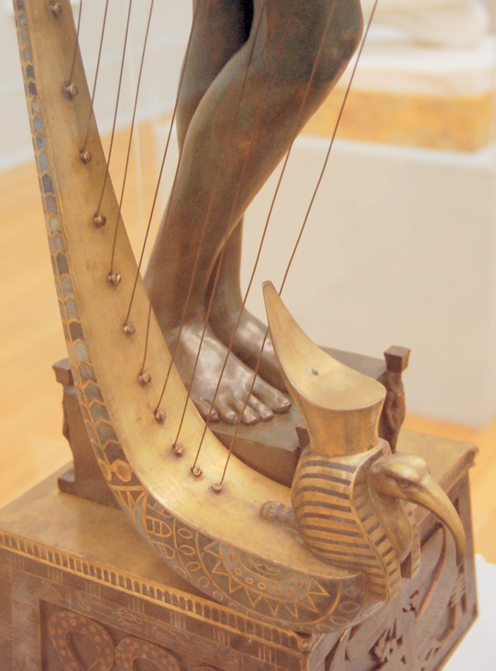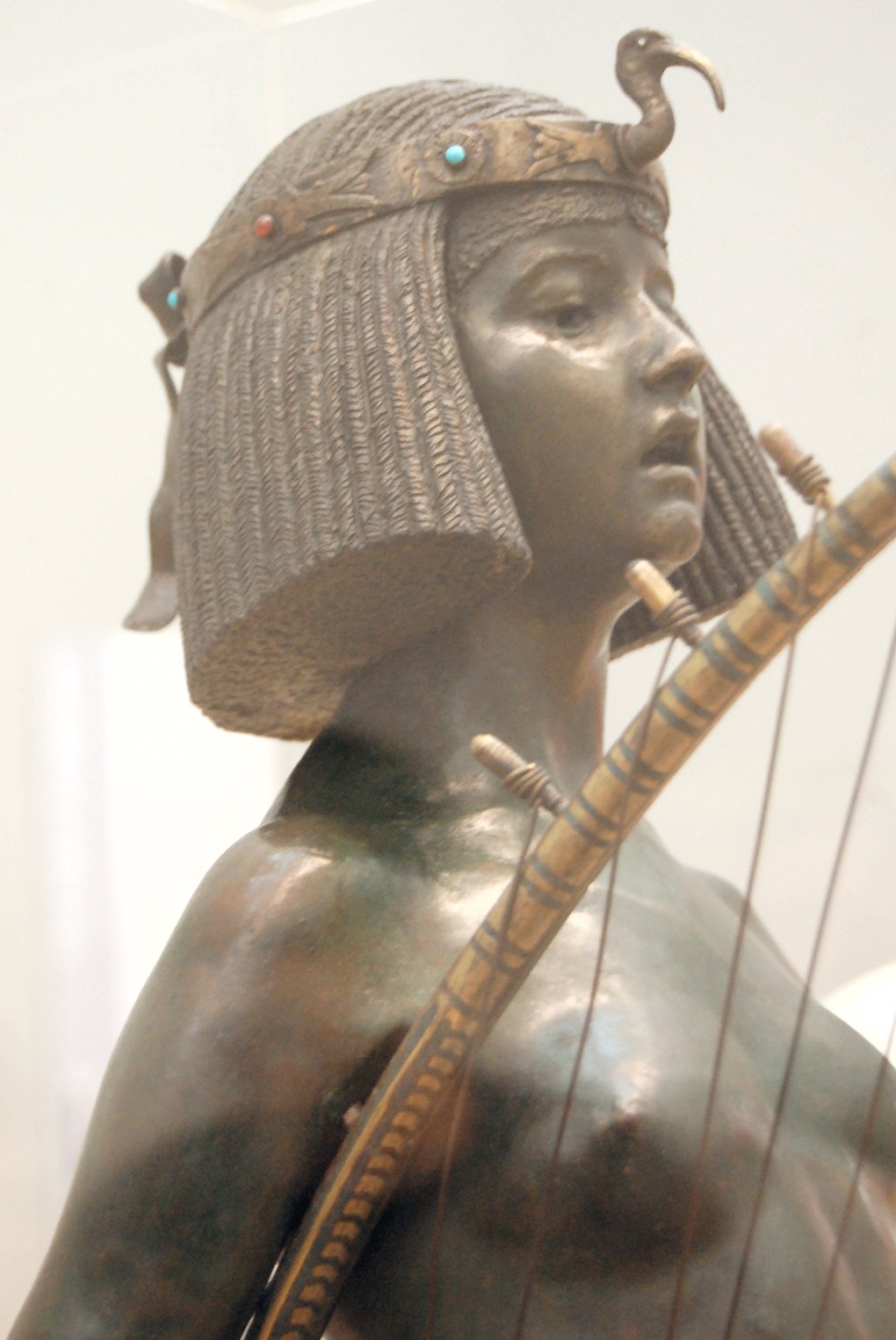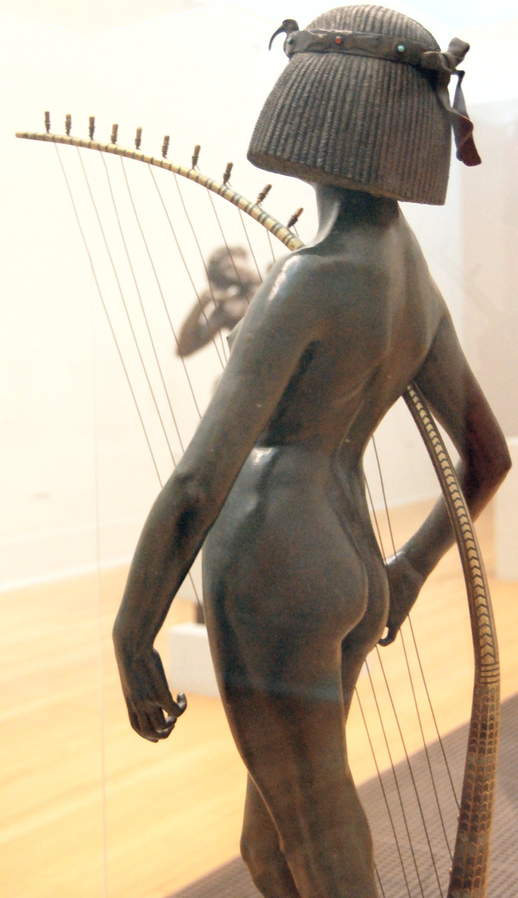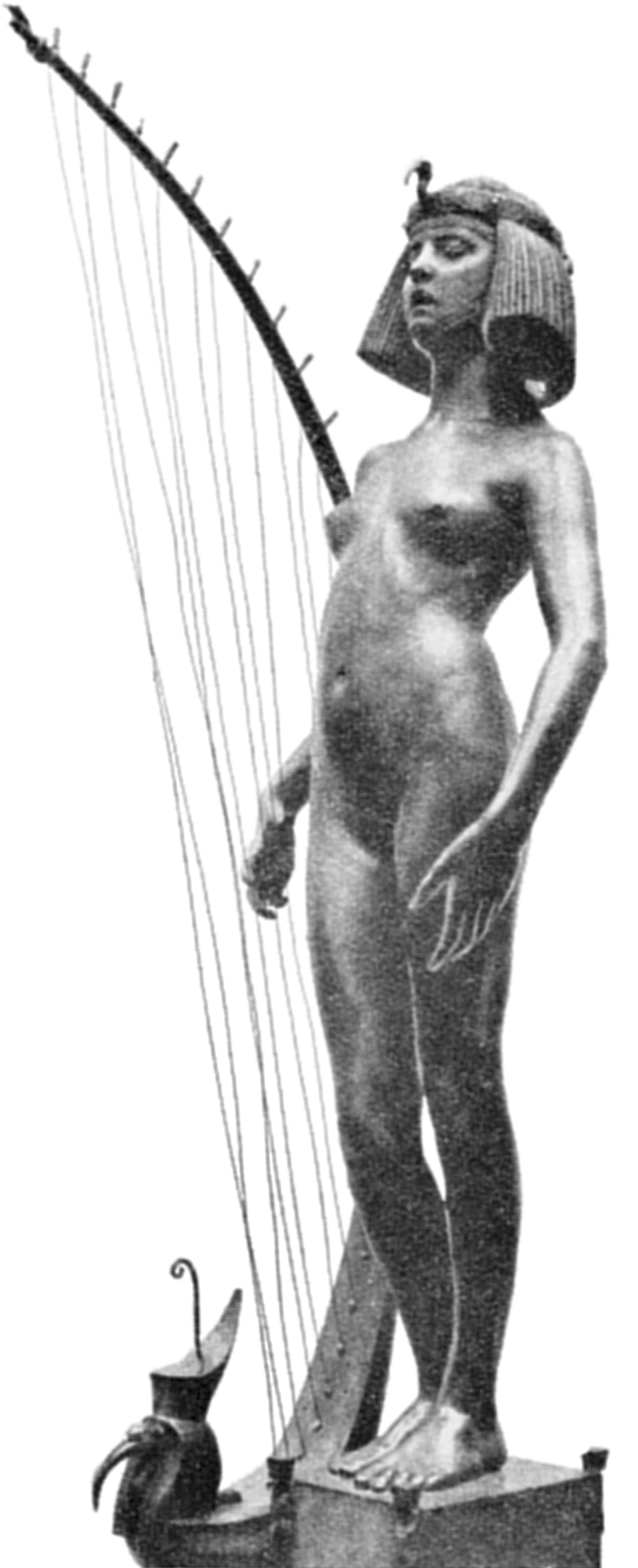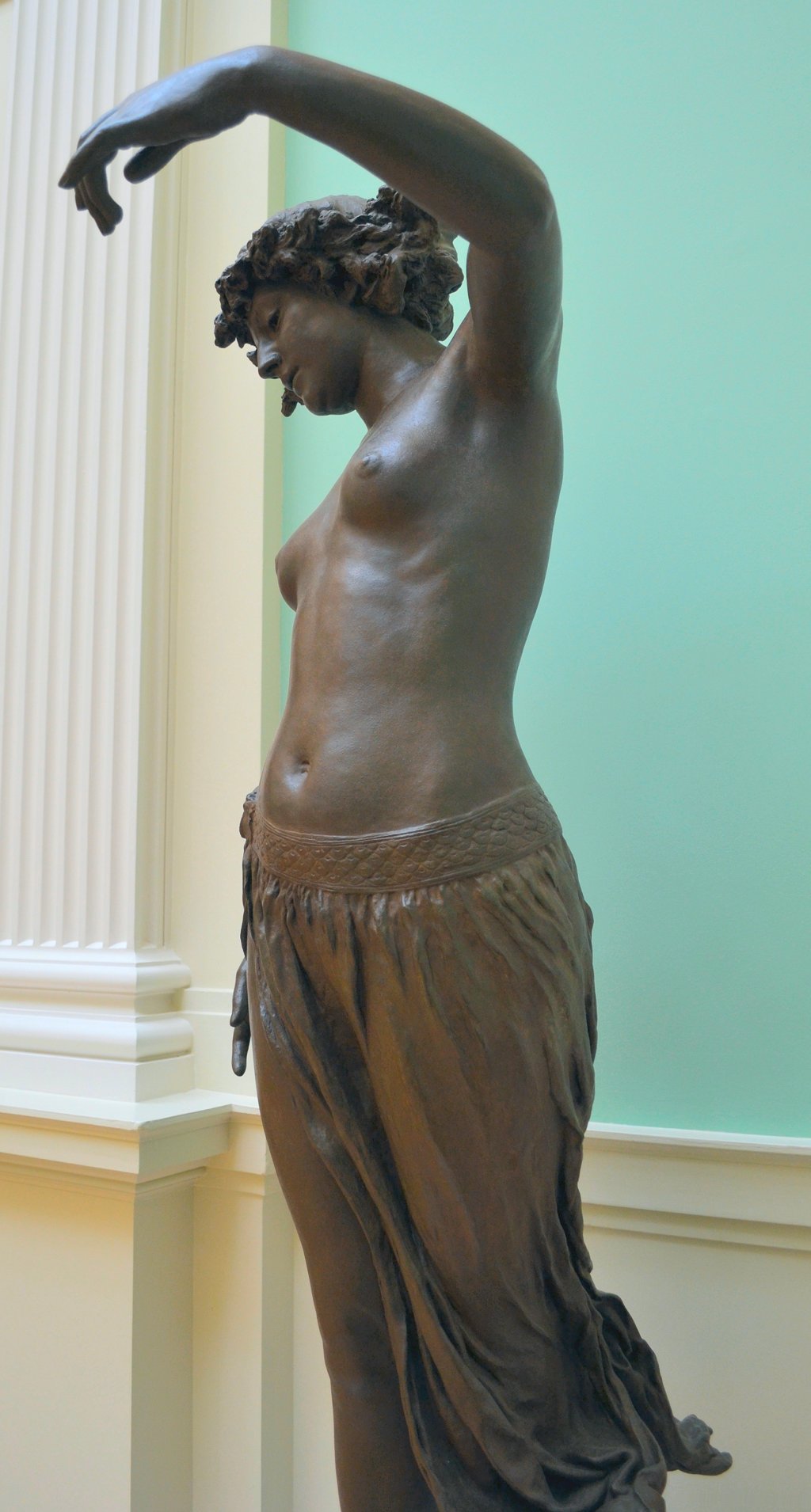 ![]() ![]() ![]() ![]() ![]() ![]() ![]() ![]() This 1893 companion piece to The Singer doesn’t seem to appear in many vintage art books, at least not the ones where I found the older photos of The Singer. Unlike The Singer, which was part of the original Tate collection, Applause used to be privately-owned and was hardly ever displayed. She was later acquired by the Tate and, her appearance there in the summer of 2010 was a rare opportunity for me to photograph her. Admittedly these images suffer from the same problems as my other Tate pictures, but apart from one small image on the official Tate website and a few more on Flickr, these were for a time be the only photos you could find of her anywhere. Finally in December 2012 she went back on permanent display at the Tate’s BP Walk Through British Art galleries - though frustratingly, The Singer has not been put back on display with her. One of the following shots (see if you can spot which one) was taken while the room was being prepared, before she was put back in her glass case. As for the rest, by using a wide angle lens, and wearing dark clothing and gloves, I was able to avoid some of the reflection problems I’d previously experienced with the glass, although in some views the wide angle makes her hands look freakishly big. ![]() ![]() ![]() ![]() ![]() ![]() ![]() ![]() ![]() ![]() ![]() ![]() ![]() ![]() ![]() ![]() Some rare old engravings show the statue on a tall pedestal, just like her ‘sister’. It would be fascinating to see the two statues displayed that way, but I guess it wasn’t practical, even assuming the pedestals still exist. As you can see, this girl also has a headdress and coronet, this time decorated with cobras (representing the Nile, apparently), and also sits on a sculpted pedestal. Although not as finely-detailed as The Singer, there’s still a lot to enjoy about this piece. ![]() This is a contrast-enhanced photo of the rear of the pedestal, showing two statuettes of Egyptian goddesses, and a hidden image that hopefully shouldn’t be too hard to make out... ![]() Amongst the Egyptian-style engravings on the sides of the pedestal (the left side is a mirror-image of the right) are two figures, one of which looks suspiciously similar to Applause herself, and the other of which is indubitably The Singer. The engraved Singer seems to have been promoted to lead singer in the band. Good for her. ![]() ![]() ![]() ![]() Finally, here’s a comparison between a real panel from an Ancient Egyptian tomb painting, now in the Metropolitan Museum of Art, New York, and the top row of musicians on the base of Applause. Note the similarities between the clothing (what there is of it!), decoration, headdresses and musical instruments, demonstrating that Ford had done some research on his subject. ![]() Dating from roughly the same period, French sculptress Jeanne Itasse’s statue Egyptian Harpist uses similar subject matter to Ford’s Egyptian girls. Unfortunately I’ve only been able to find one vintage photo of it, and it’s possible that it may not have survived the upheavals of the 20th century, which would be a shame. ![]() Meanwhile, rounding off this look at the two girls, here’s a comparison of their faces in profile. You’ll notice that in both cases the camera chose to focus on the foreground, so their headpieces came out sharper than their actual faces. ![]() Folly (1886) Tate Britain Gallery, London, August-September 2010.