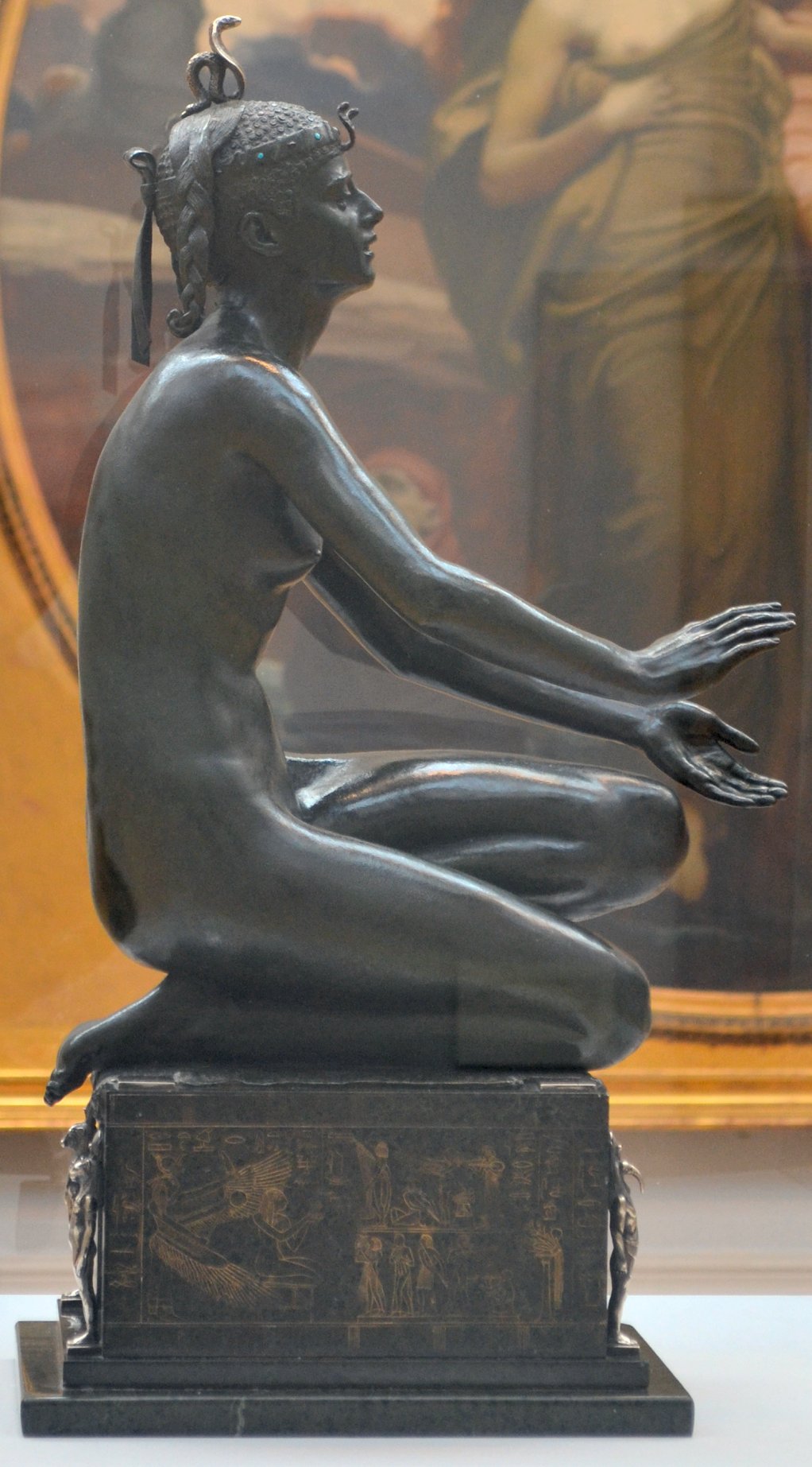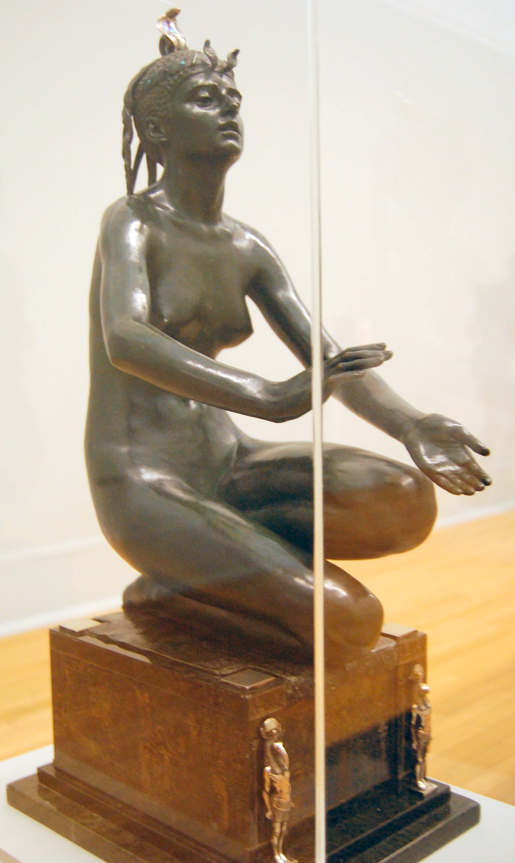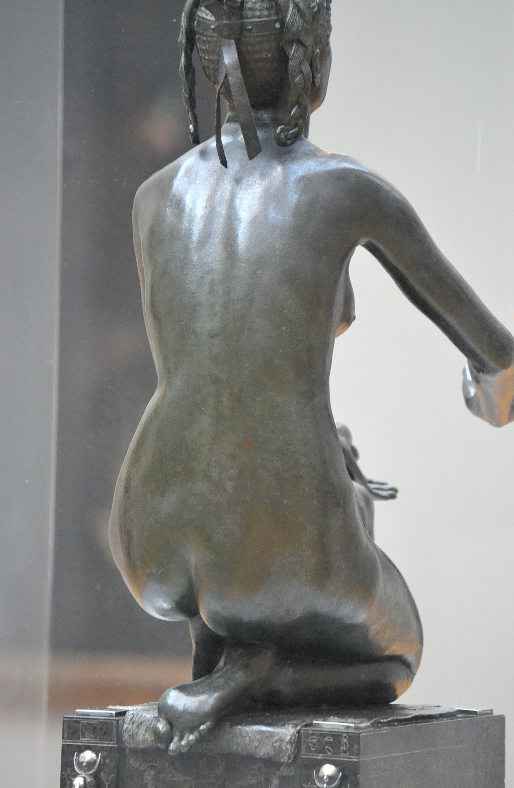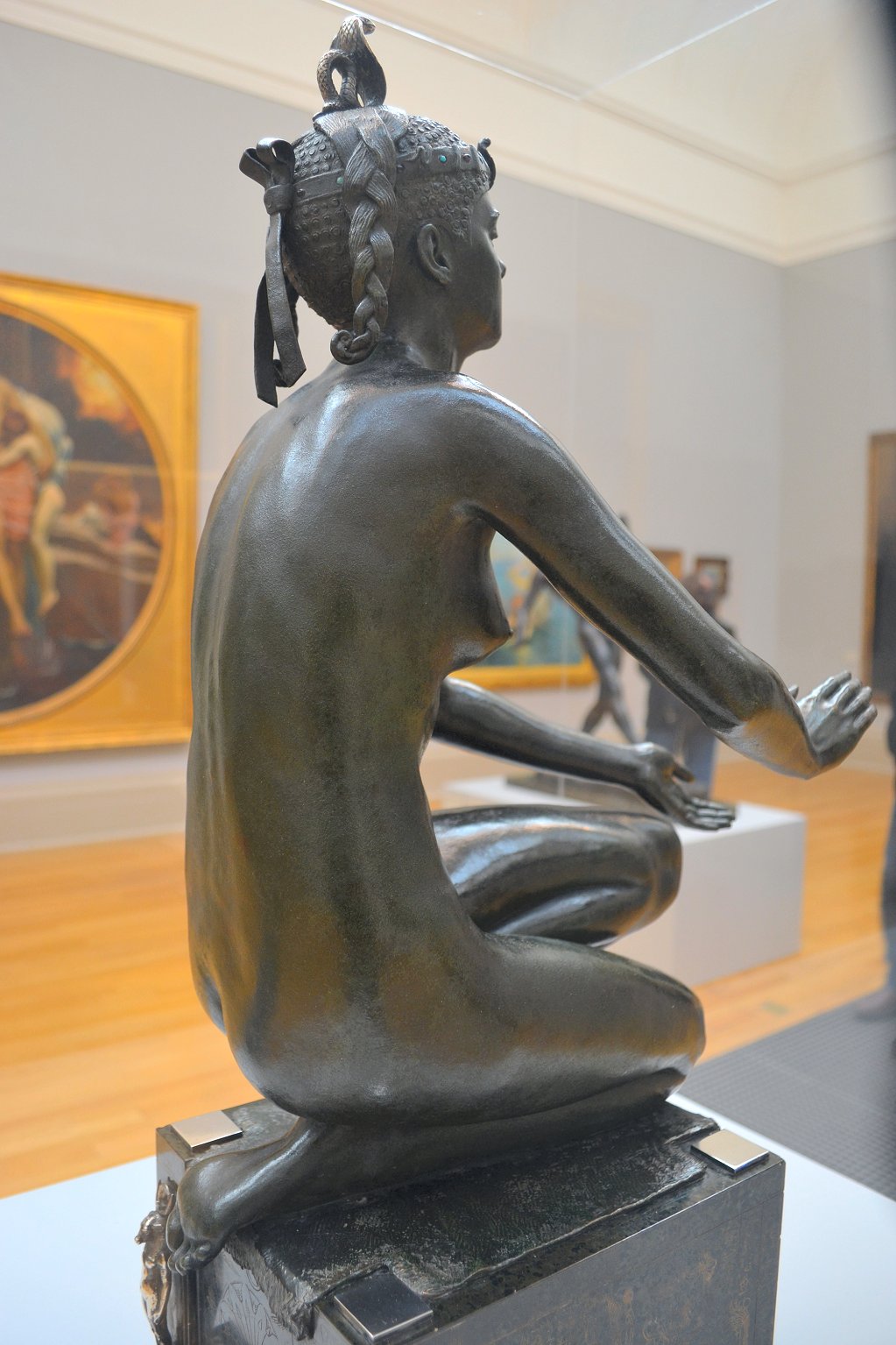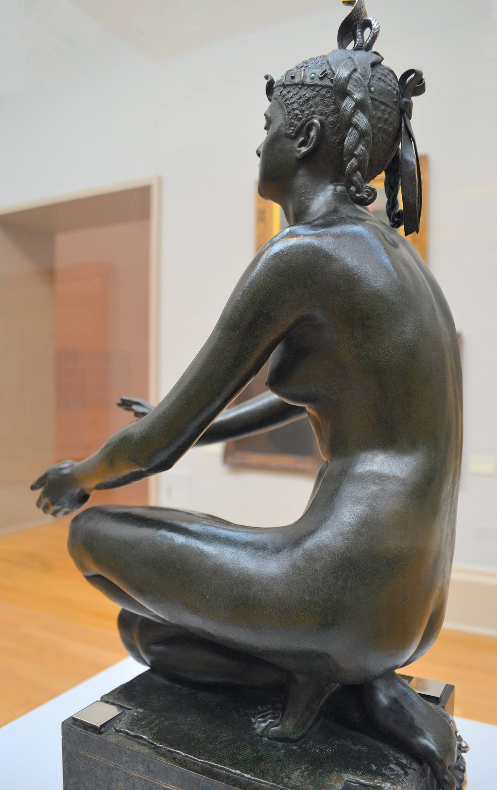 ![]() ![]() ![]() ![]() ![]() ![]() ![]() ![]() This 1893 companion piece to The Singer doesn’t seem to appear in many vintage art books, at least not the ones where I found the older photos of The Singer. Unlike The Singer, which was part of the original Tate collection, Applause used to be privately-owned and was hardly ever displayed. She was later acquired by the Tate and, her appearance there in the summer of 2010 was a rare opportunity for me to photograph her. Admittedly these images suffer from the same problems as my other Tate pictures, but apart from one small image on the official Tate website and a few more on Flickr, these were for a time be the only photos you could find of her anywhere. Finally in December 2012 she went back on permanent display at the Tate’s BP Walk Through British Art galleries - though frustratingly, The Singer has not been put back on display with her. One of the following shots (see if you can spot which one) was taken while the room was being prepared, before she was put back in her glass case. As for the rest, by using a wide angle lens, and wearing dark clothing and gloves, I was able to avoid some of the reflection problems I’d previously experienced with the glass, although in some views the wide angle makes her hands look freakishly big. ![]() ![]() ![]() ![]() ![]() ![]() ![]() ![]() ![]() ![]() ![]() ![]() ![]() ![]() ![]() ![]() Some rare old engravings show the statue on a tall pedestal, just like her ‘sister’. It would be fascinating to see the two statues displayed that way, but I guess it wasn’t practical, even assuming the pedestals still exist. As you can see, this girl also has a headdress and coronet, this time decorated with cobras (representing the Nile, apparently), and also sits on a sculpted pedestal. Although not as finely-detailed as The Singer, there’s still a lot to enjoy about this piece. ![]() This is a contrast-enhanced photo of the rear of the pedestal, showing two statuettes of Egyptian goddesses, and a hidden image that hopefully shouldn’t be too hard to make out... ![]() Amongst the Egyptian-style engravings on the sides of the pedestal (the left side is a mirror-image of the right) are two figures, one of which looks suspiciously similar to Applause herself, and the other of which is indubitably The Singer. The engraved Singer seems to have been promoted to lead singer in the band. Good for her. ![]() ![]() ![]() ![]() Finally, here’s a comparison between a real panel from an Ancient Egyptian tomb painting, now in the Metropolitan Museum of Art, New York, and the top row of musicians on the base of Applause. Note the similarities between the clothing (what there is of it!), decoration, headdresses and musical instruments, demonstrating that Ford had done some research on his subject. ![]() Dating from roughly the same period, French sculptress Jeanne Itasse’s statue Egyptian Harpist uses similar subject matter to Ford’s Egyptian girls. Unfortunately I’ve only been able to find one vintage photo of it, and it’s possible that it may not have survived the upheavals of the 20th century, which would be a shame. ![]() Meanwhile, rounding off this look at the two girls, here’s a comparison of their faces in profile. You’ll notice that in both cases the camera chose to focus on the foreground, so their headpieces came out sharper than their actual faces. ![]() Folly (1886) Tate Britain Gallery, London, August-September 2010.