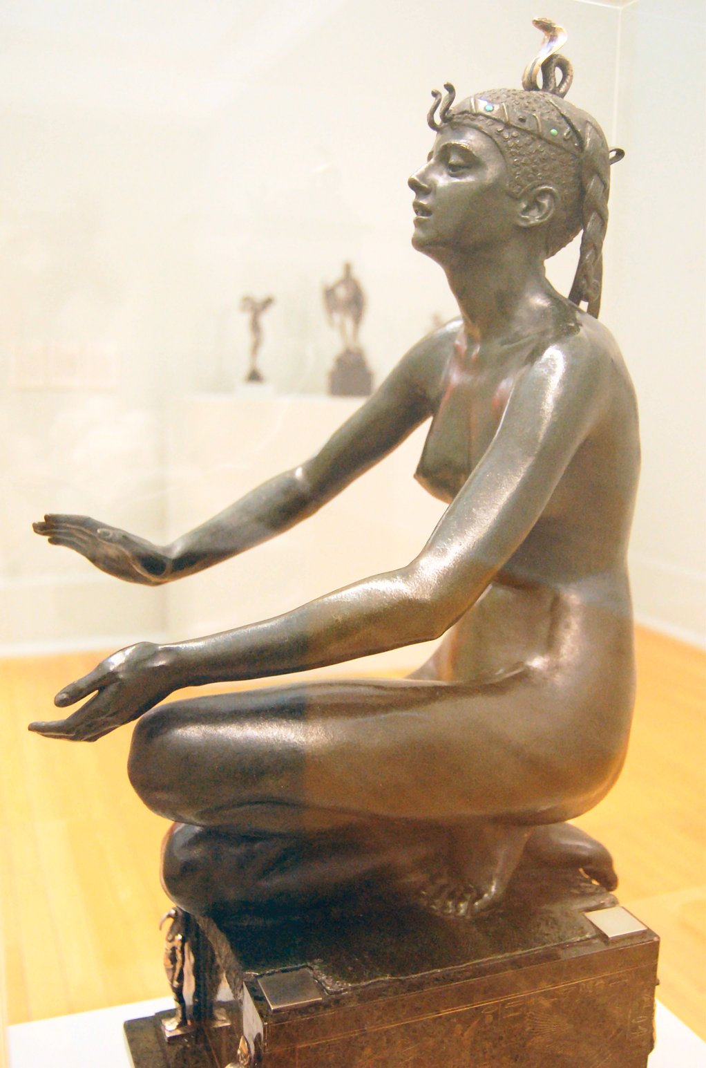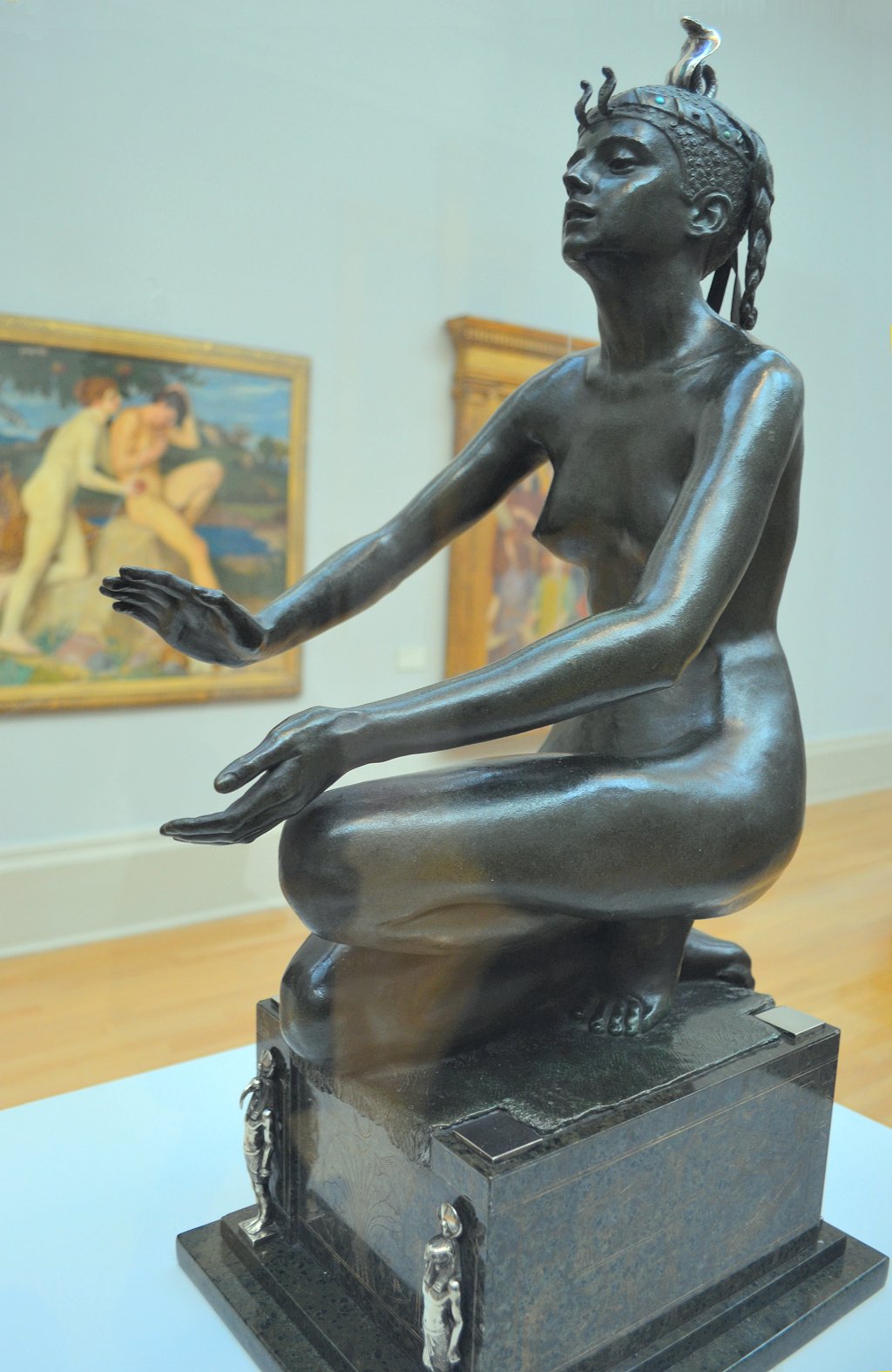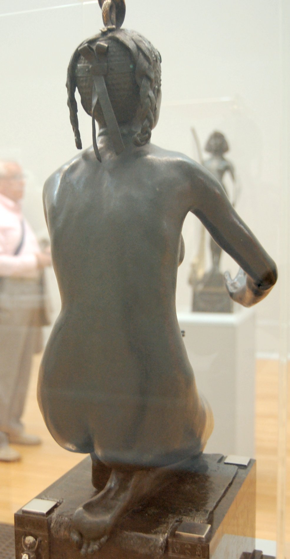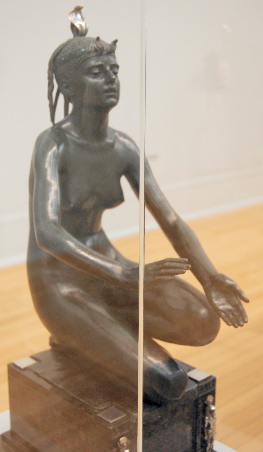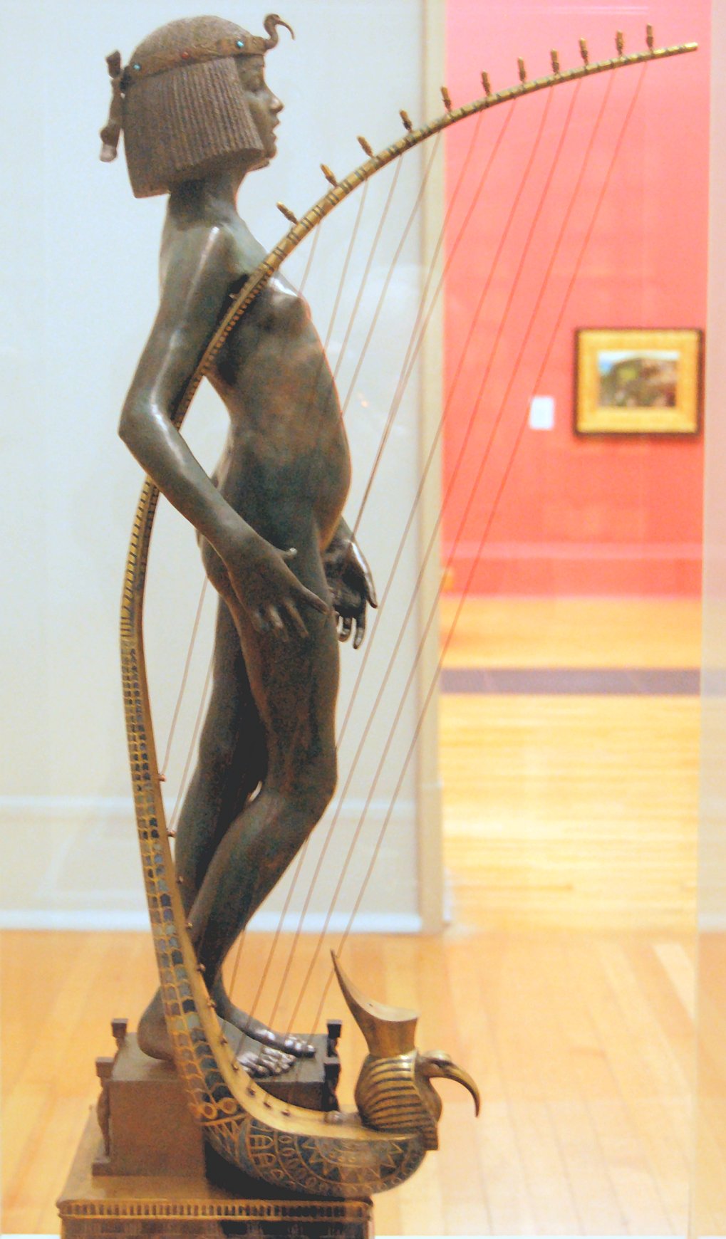 ![]() ![]() ![]() ![]() ![]() ![]() ![]() ![]() This 1893 companion piece to The Singer doesn’t seem to appear in many vintage art books, at least not the ones where I found the older photos of The Singer. Unlike The Singer, which was part of the original Tate collection, Applause used to be privately-owned and was hardly ever displayed. She was later acquired by the Tate and, her appearance there in the summer of 2010 was a rare opportunity for me to photograph her. Admittedly these images suffer from the same problems as my other Tate pictures, but apart from one small image on the official Tate website and a few more on Flickr, these were for a time be the only photos you could find of her anywhere. Finally in December 2012 she went back on permanent display at the Tate’s BP Walk Through British Art galleries - though frustratingly, The Singer has not been put back on display with her. One of the following shots (see if you can spot which one) was taken while the room was being prepared, before she was put back in her glass case. As for the rest, by using a wide angle lens, and wearing dark clothing and gloves, I was able to avoid some of the reflection problems I’d previously experienced with the glass, although in some views the wide angle makes her hands look freakishly big. ![]() ![]() ![]() ![]() ![]() ![]() ![]() ![]() ![]() ![]() ![]() ![]() ![]() ![]() ![]() ![]() Some rare old engravings show the statue on a tall pedestal, just like her ‘sister’. It would be fascinating to see the two statues displayed that way, but I guess it wasn’t practical, even assuming the pedestals still exist. As you can see, this girl also has a headdress and coronet, this time decorated with cobras (representing the Nile, apparently), and also sits on a sculpted pedestal. Although not as finely-detailed as The Singer, there’s still a lot to enjoy about this piece. ![]() This is a contrast-enhanced photo of the rear of the pedestal, showing two statuettes of Egyptian goddesses, and a hidden image that hopefully shouldn’t be too hard to make out... ![]() Amongst the Egyptian-style engravings on the sides of the pedestal (the left side is a mirror-image of the right) are two figures, one of which looks suspiciously similar to Applause herself, and the other of which is indubitably The Singer. The engraved Singer seems to have been promoted to lead singer in the band. Good for her. ![]() ![]() ![]() ![]() Finally, here’s a comparison between a real panel from an Ancient Egyptian tomb painting, now in the Metropolitan Museum of Art, New York, and the top row of musicians on the base of Applause. Note the similarities between the clothing (what there is of it!), decoration, headdresses and musical instruments, demonstrating that Ford had done some research on his subject. ![]() Dating from roughly the same period, French sculptress Jeanne Itasse’s statue Egyptian Harpist uses similar subject matter to Ford’s Egyptian girls. Unfortunately I’ve only been able to find one vintage photo of it, and it’s possible that it may not have survived the upheavals of the 20th century, which would be a shame. ![]() Meanwhile, rounding off this look at the two girls, here’s a comparison of their faces in profile. You’ll notice that in both cases the camera chose to focus on the foreground, so their headpieces came out sharper than their actual faces. ![]() Folly (1886) Tate Britain Gallery, London, August-September 2010.