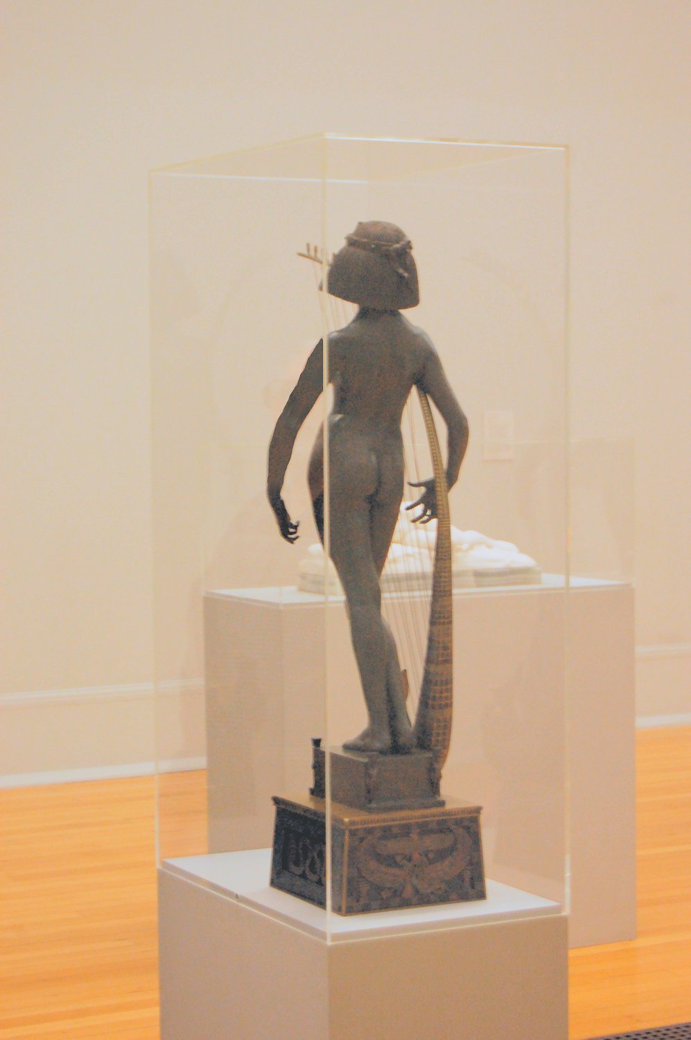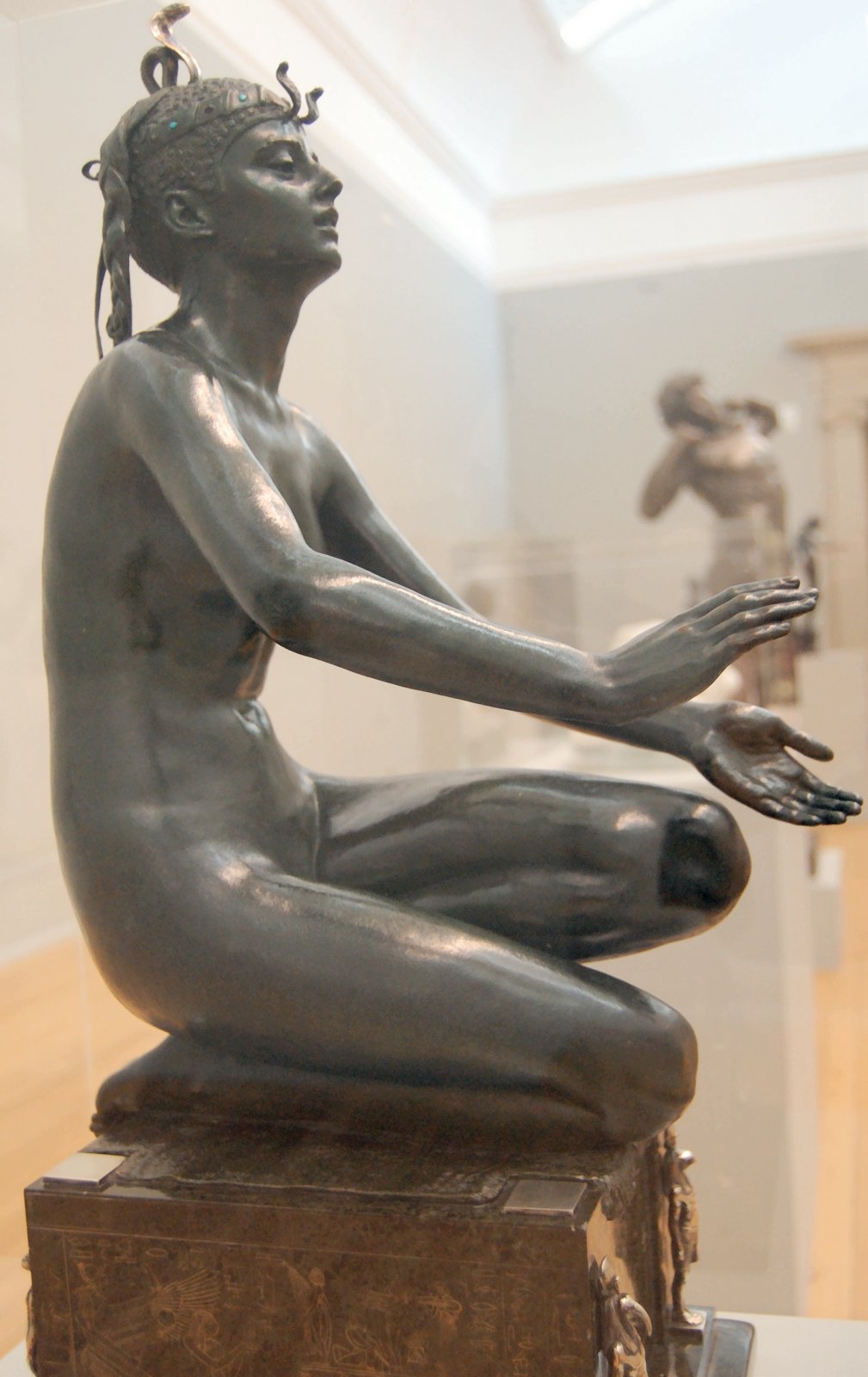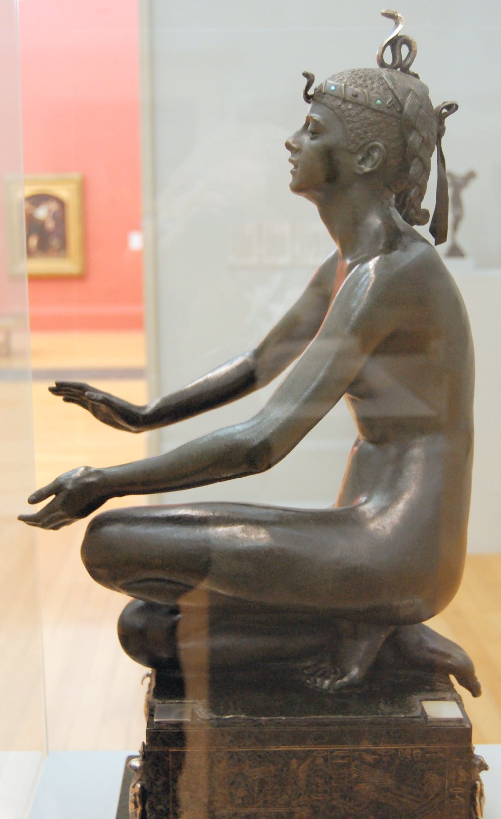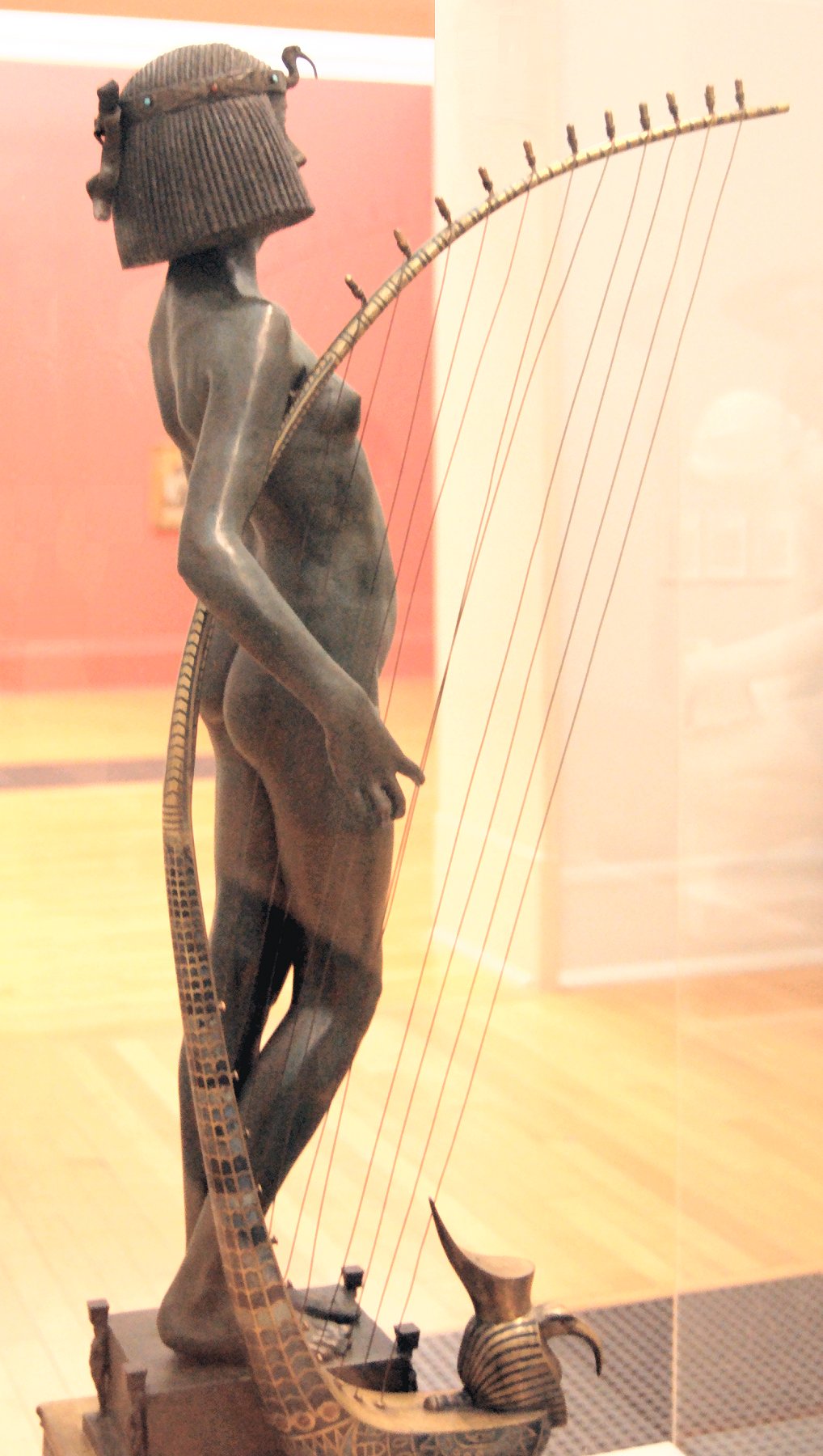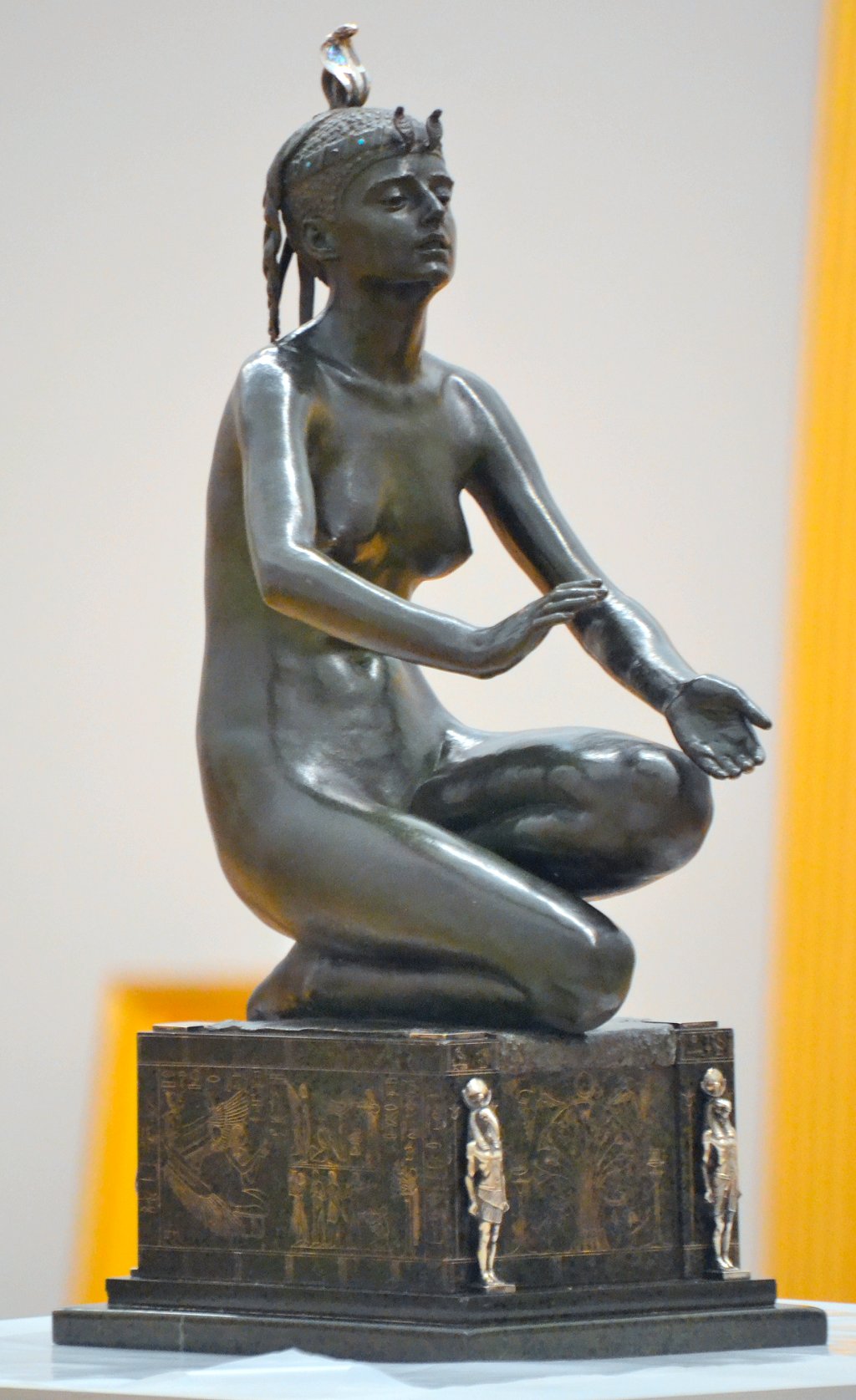 ![]() ![]() ![]() ![]() ![]() ![]() ![]() ![]() This 1893 companion piece to The Singer doesn’t seem to appear in many vintage art books, at least not the ones where I found the older photos of The Singer. Unlike The Singer, which was part of the original Tate collection, Applause used to be privately-owned and was hardly ever displayed. She was later acquired by the Tate and, her appearance there in the summer of 2010 was a rare opportunity for me to photograph her. Admittedly these images suffer from the same problems as my other Tate pictures, but apart from one small image on the official Tate website and a few more on Flickr, these were for a time be the only photos you could find of her anywhere. Finally in December 2012 she went back on permanent display at the Tate’s BP Walk Through British Art galleries - though frustratingly, The Singer has not been put back on display with her. One of the following shots (see if you can spot which one) was taken while the room was being prepared, before she was put back in her glass case. As for the rest, by using a wide angle lens, and wearing dark clothing and gloves, I was able to avoid some of the reflection problems I’d previously experienced with the glass, although in some views the wide angle makes her hands look freakishly big. ![]() ![]() ![]() ![]() ![]() ![]() ![]() ![]() ![]() ![]() ![]() ![]() ![]() ![]() ![]() ![]() Some rare old engravings show the statue on a tall pedestal, just like her ‘sister’. It would be fascinating to see the two statues displayed that way, but I guess it wasn’t practical, even assuming the pedestals still exist. As you can see, this girl also has a headdress and coronet, this time decorated with cobras (representing the Nile, apparently), and also sits on a sculpted pedestal. Although not as finely-detailed as The Singer, there’s still a lot to enjoy about this piece. ![]() This is a contrast-enhanced photo of the rear of the pedestal, showing two statuettes of Egyptian goddesses, and a hidden image that hopefully shouldn’t be too hard to make out... ![]() Amongst the Egyptian-style engravings on the sides of the pedestal (the left side is a mirror-image of the right) are two figures, one of which looks suspiciously similar to Applause herself, and the other of which is indubitably The Singer. The engraved Singer seems to have been promoted to lead singer in the band. Good for her. ![]() ![]() ![]() ![]() Finally, here’s a comparison between a real panel from an Ancient Egyptian tomb painting, now in the Metropolitan Museum of Art, New York, and the top row of musicians on the base of Applause. Note the similarities between the clothing (what there is of it!), decoration, headdresses and musical instruments, demonstrating that Ford had done some research on his subject. ![]() Dating from roughly the same period, French sculptress Jeanne Itasse’s statue Egyptian Harpist uses similar subject matter to Ford’s Egyptian girls. Unfortunately I’ve only been able to find one vintage photo of it, and it’s possible that it may not have survived the upheavals of the 20th century, which would be a shame. ![]() Meanwhile, rounding off this look at the two girls, here’s a comparison of their faces in profile. You’ll notice that in both cases the camera chose to focus on the foreground, so their headpieces came out sharper than their actual faces. ![]() Folly (1886) Tate Britain Gallery, London, August-September 2010.
