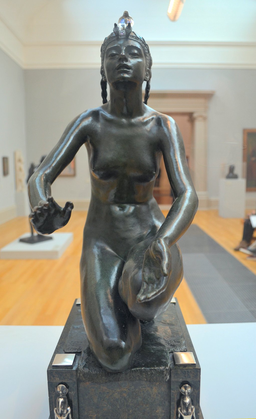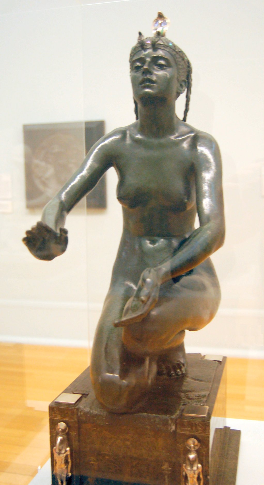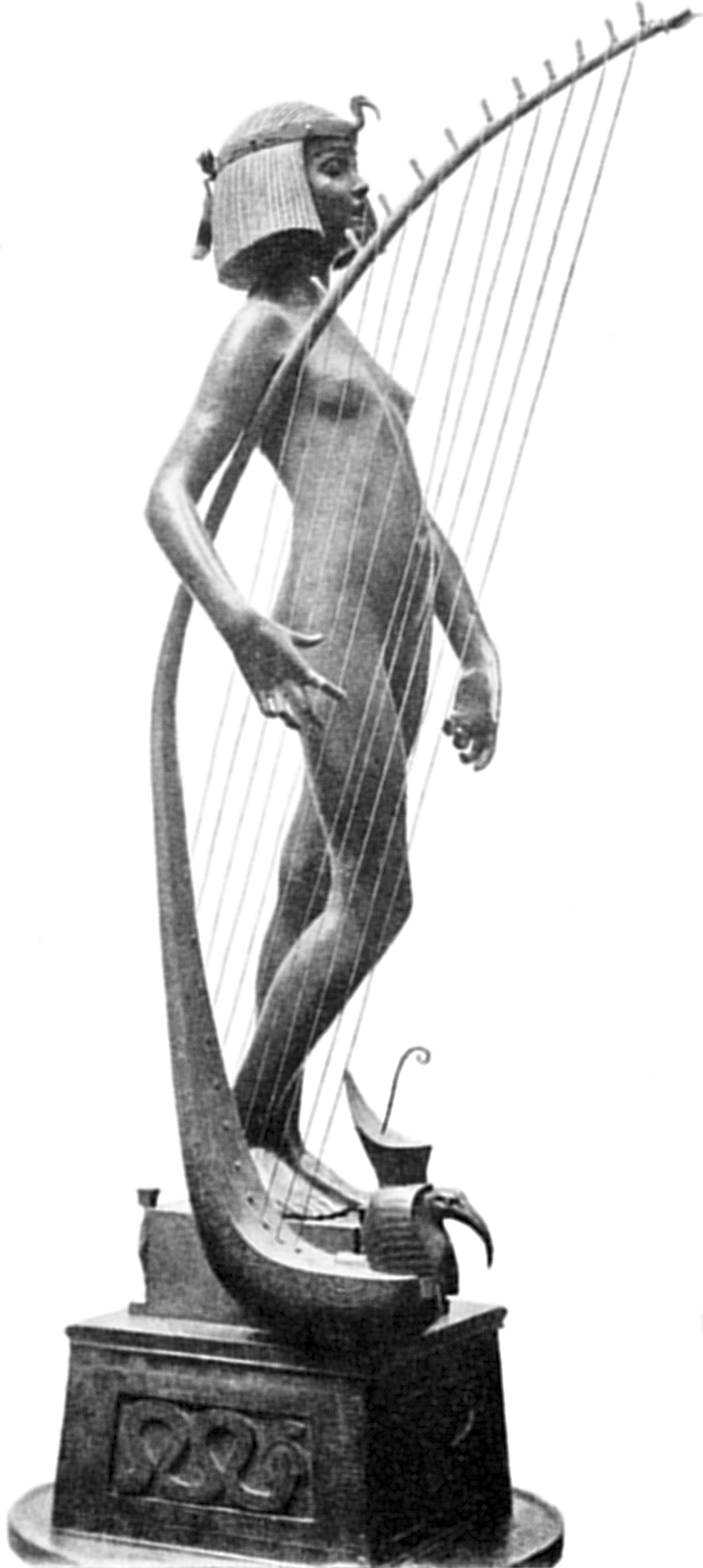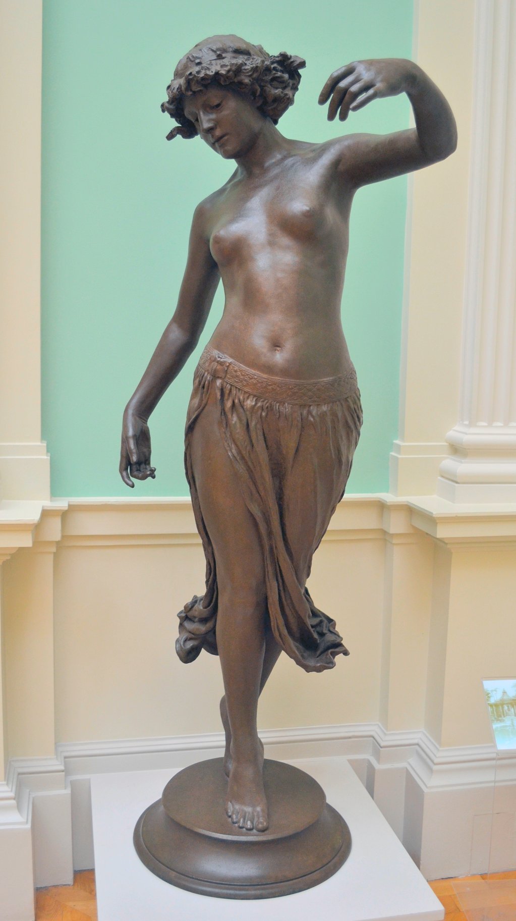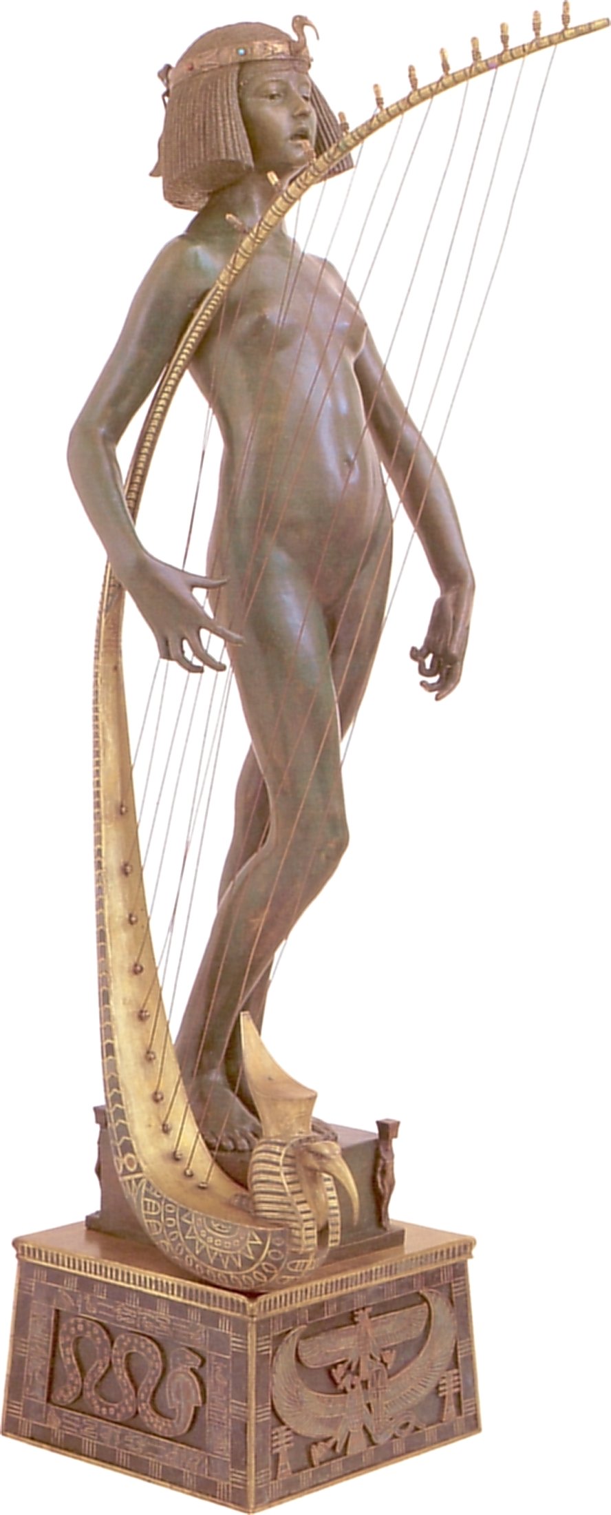 ![]() ![]() ![]() ![]() ![]() ![]() ![]() ![]() This 1893 companion piece to The Singer doesn’t seem to appear in many vintage art books, at least not the ones where I found the older photos of The Singer. Unlike The Singer, which was part of the original Tate collection, Applause used to be privately-owned and was hardly ever displayed. She was later acquired by the Tate and, her appearance there in the summer of 2010 was a rare opportunity for me to photograph her. Admittedly these images suffer from the same problems as my other Tate pictures, but apart from one small image on the official Tate website and a few more on Flickr, these were for a time be the only photos you could find of her anywhere. Finally in December 2012 she went back on permanent display at the Tate’s BP Walk Through British Art galleries - though frustratingly, The Singer has not been put back on display with her. One of the following shots (see if you can spot which one) was taken while the room was being prepared, before she was put back in her glass case. As for the rest, by using a wide angle lens, and wearing dark clothing and gloves, I was able to avoid some of the reflection problems I’d previously experienced with the glass, although in some views the wide angle makes her hands look freakishly big. ![]() ![]() ![]() ![]() ![]() ![]() ![]() ![]() ![]() ![]() ![]() ![]() ![]() ![]() ![]() ![]() Some rare old engravings show the statue on a tall pedestal, just like her ‘sister’. It would be fascinating to see the two statues displayed that way, but I guess it wasn’t practical, even assuming the pedestals still exist. As you can see, this girl also has a headdress and coronet, this time decorated with cobras (representing the Nile, apparently), and also sits on a sculpted pedestal. Although not as finely-detailed as The Singer, there’s still a lot to enjoy about this piece. ![]() This is a contrast-enhanced photo of the rear of the pedestal, showing two statuettes of Egyptian goddesses, and a hidden image that hopefully shouldn’t be too hard to make out... ![]() Amongst the Egyptian-style engravings on the sides of the pedestal (the left side is a mirror-image of the right) are two figures, one of which looks suspiciously similar to Applause herself, and the other of which is indubitably The Singer. The engraved Singer seems to have been promoted to lead singer in the band. Good for her. ![]() ![]() ![]() ![]() Finally, here’s a comparison between a real panel from an Ancient Egyptian tomb painting, now in the Metropolitan Museum of Art, New York, and the top row of musicians on the base of Applause. Note the similarities between the clothing (what there is of it!), decoration, headdresses and musical instruments, demonstrating that Ford had done some research on his subject. ![]() Dating from roughly the same period, French sculptress Jeanne Itasse’s statue Egyptian Harpist uses similar subject matter to Ford’s Egyptian girls. Unfortunately I’ve only been able to find one vintage photo of it, and it’s possible that it may not have survived the upheavals of the 20th century, which would be a shame. ![]() Meanwhile, rounding off this look at the two girls, here’s a comparison of their faces in profile. You’ll notice that in both cases the camera chose to focus on the foreground, so their headpieces came out sharper than their actual faces. ![]() Folly (1886) Tate Britain Gallery, London, August-September 2010.