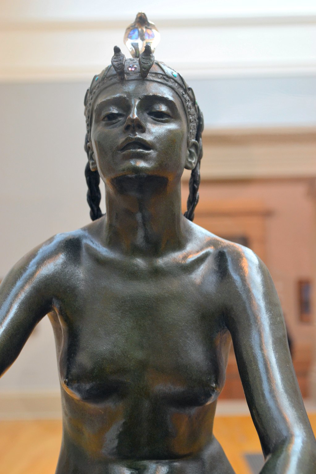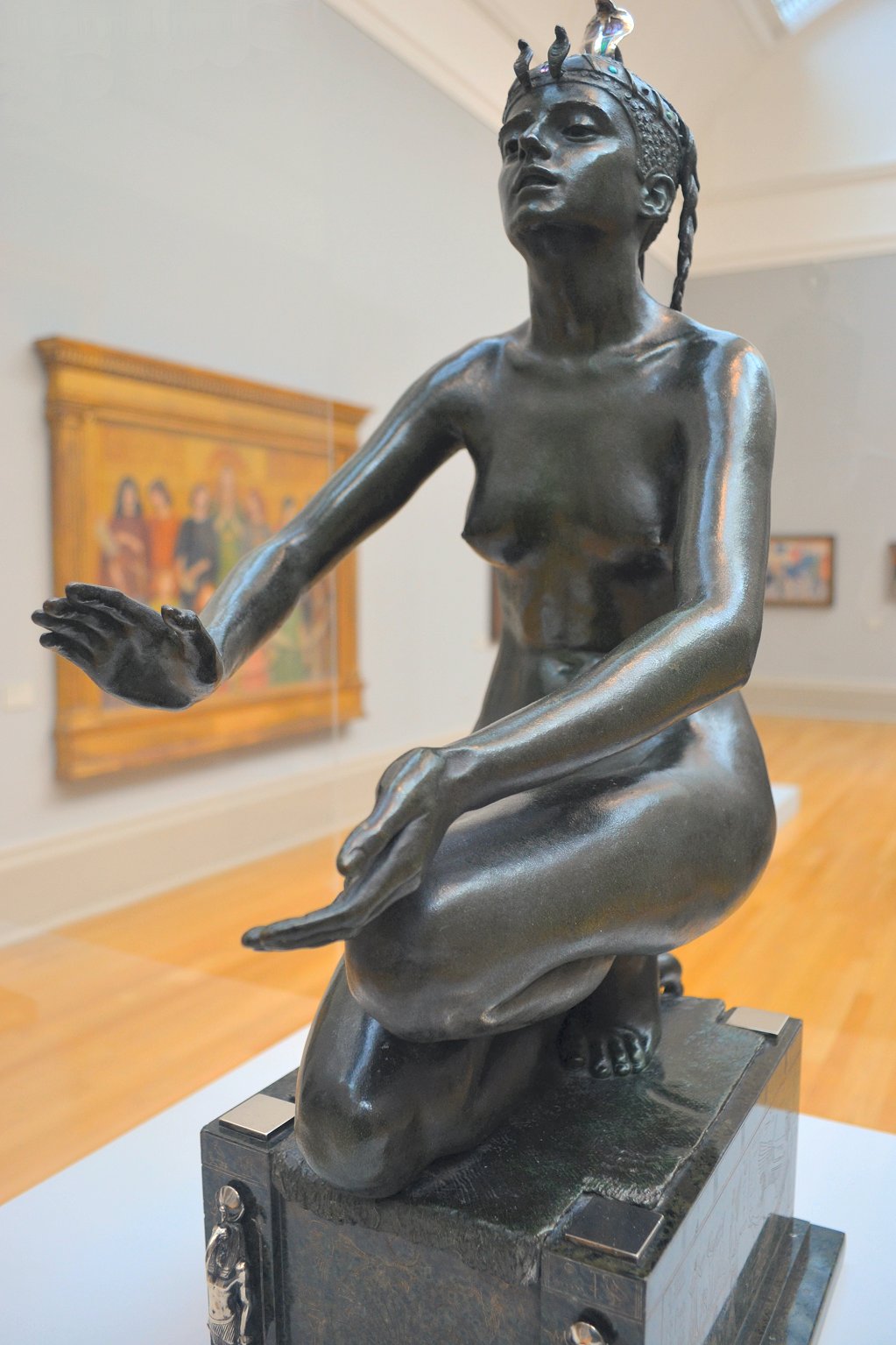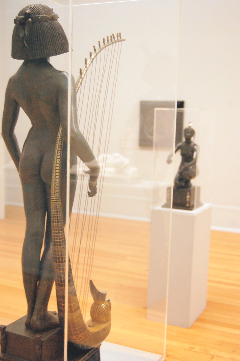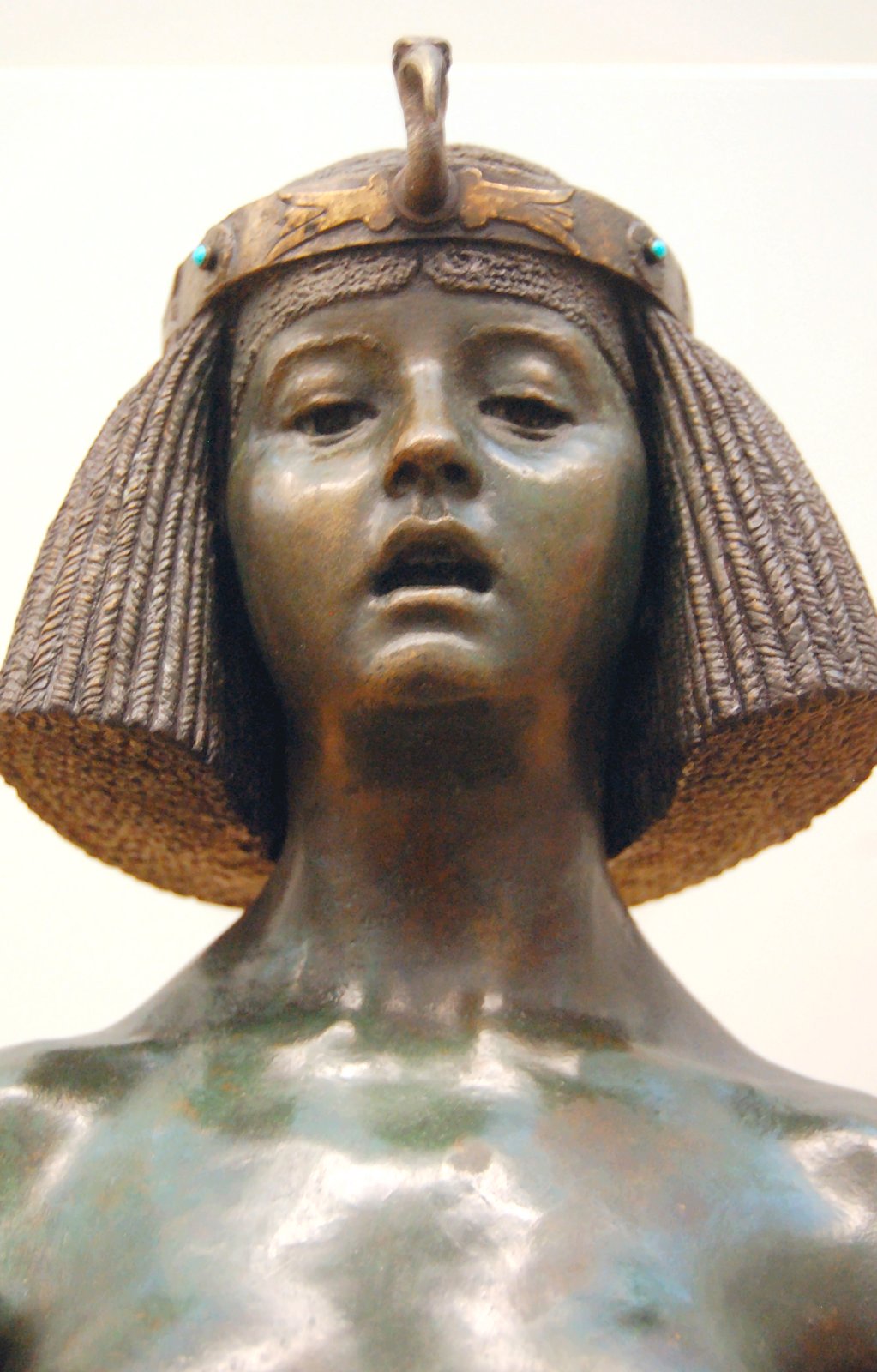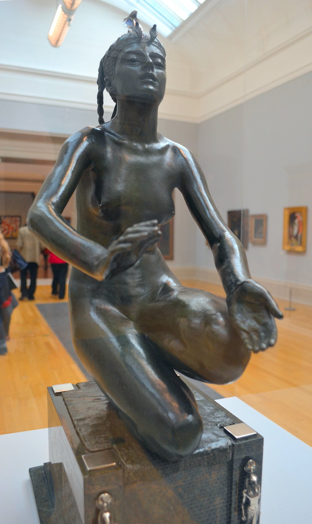![]() ![]() ![]() ![]() ![]() ![]() ![]() ![]() This 1893 companion piece to The Singer doesn’t seem to appear in many vintage art books, at least not the ones where I found the older photos of The Singer. Unlike The Singer, which was part of the original Tate collection, Applause used to be privately-owned and was hardly ever displayed. She was later acquired by the Tate and, her appearance there in the summer of 2010 was a rare opportunity for me to photograph her. Admittedly these images suffer from the same problems as my other Tate pictures, but apart from one small image on the official Tate website and a few more on Flickr, these were for a time be the only photos you could find of her anywhere. Finally in December 2012 she went back on permanent display at the Tate’s BP Walk Through British Art galleries - though frustratingly, The Singer has not been put back on display with her. One of the following shots (see if you can spot which one) was taken while the room was being prepared, before she was put back in her glass case. As for the rest, by using a wide angle lens, and wearing dark clothing and gloves, I was able to avoid some of the reflection problems I’d previously experienced with the glass, although in some views the wide angle makes her hands look freakishly big. ![]() ![]() ![]() ![]() ![]() ![]() ![]() ![]() ![]() ![]() ![]() ![]() ![]() ![]() ![]() ![]() Some rare old engravings show the statue on a tall pedestal, just like her ‘sister’. It would be fascinating to see the two statues displayed that way, but I guess it wasn’t practical, even assuming the pedestals still exist. As you can see, this girl also has a headdress and coronet, this time decorated with cobras (representing the Nile, apparently), and also sits on a sculpted pedestal. Although not as finely-detailed as The Singer, there’s still a lot to enjoy about this piece. ![]() This is a contrast-enhanced photo of the rear of the pedestal, showing two statuettes of Egyptian goddesses, and a hidden image that hopefully shouldn’t be too hard to make out... ![]() Amongst the Egyptian-style engravings on the sides of the pedestal (the left side is a mirror-image of the right) are two figures, one of which looks suspiciously similar to Applause herself, and the other of which is indubitably The Singer. The engraved Singer seems to have been promoted to lead singer in the band. Good for her. ![]() ![]() ![]() ![]() Finally, here’s a comparison between a real panel from an Ancient Egyptian tomb painting, now in the Metropolitan Museum of Art, New York, and the top row of musicians on the base of Applause. Note the similarities between the clothing (what there is of it!), decoration, headdresses and musical instruments, demonstrating that Ford had done some research on his subject. ![]() Dating from roughly the same period, French sculptress Jeanne Itasse’s statue Egyptian Harpist uses similar subject matter to Ford’s Egyptian girls. Unfortunately I’ve only been able to find one vintage photo of it, and it’s possible that it may not have survived the upheavals of the 20th century, which would be a shame. ![]() Meanwhile, rounding off this look at the two girls, here’s a comparison of their faces in profile. You’ll notice that in both cases the camera chose to focus on the foreground, so their headpieces came out sharper than their actual faces. ![]() Folly (1886) Tate Britain Gallery, London, August-September 2010.
