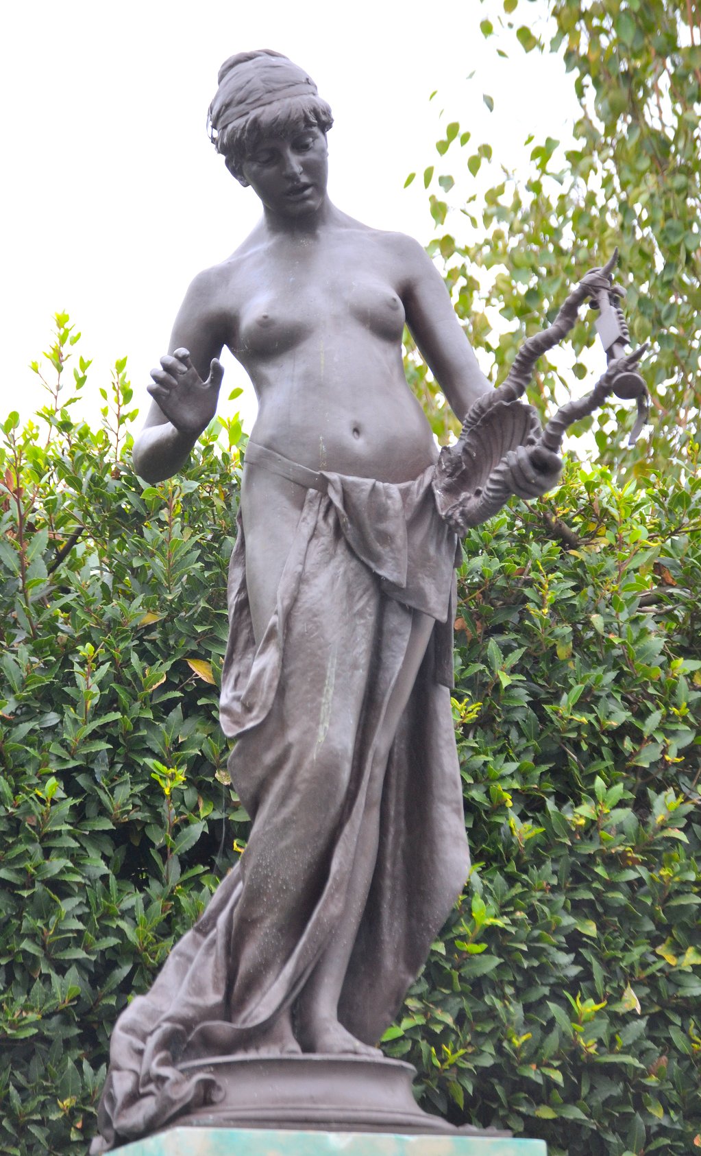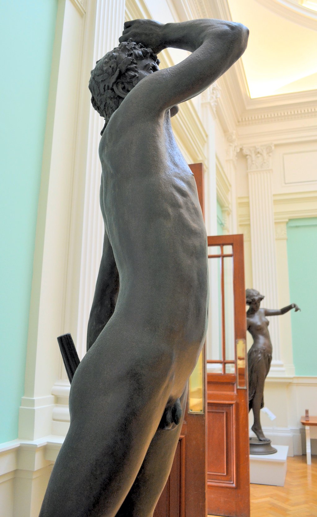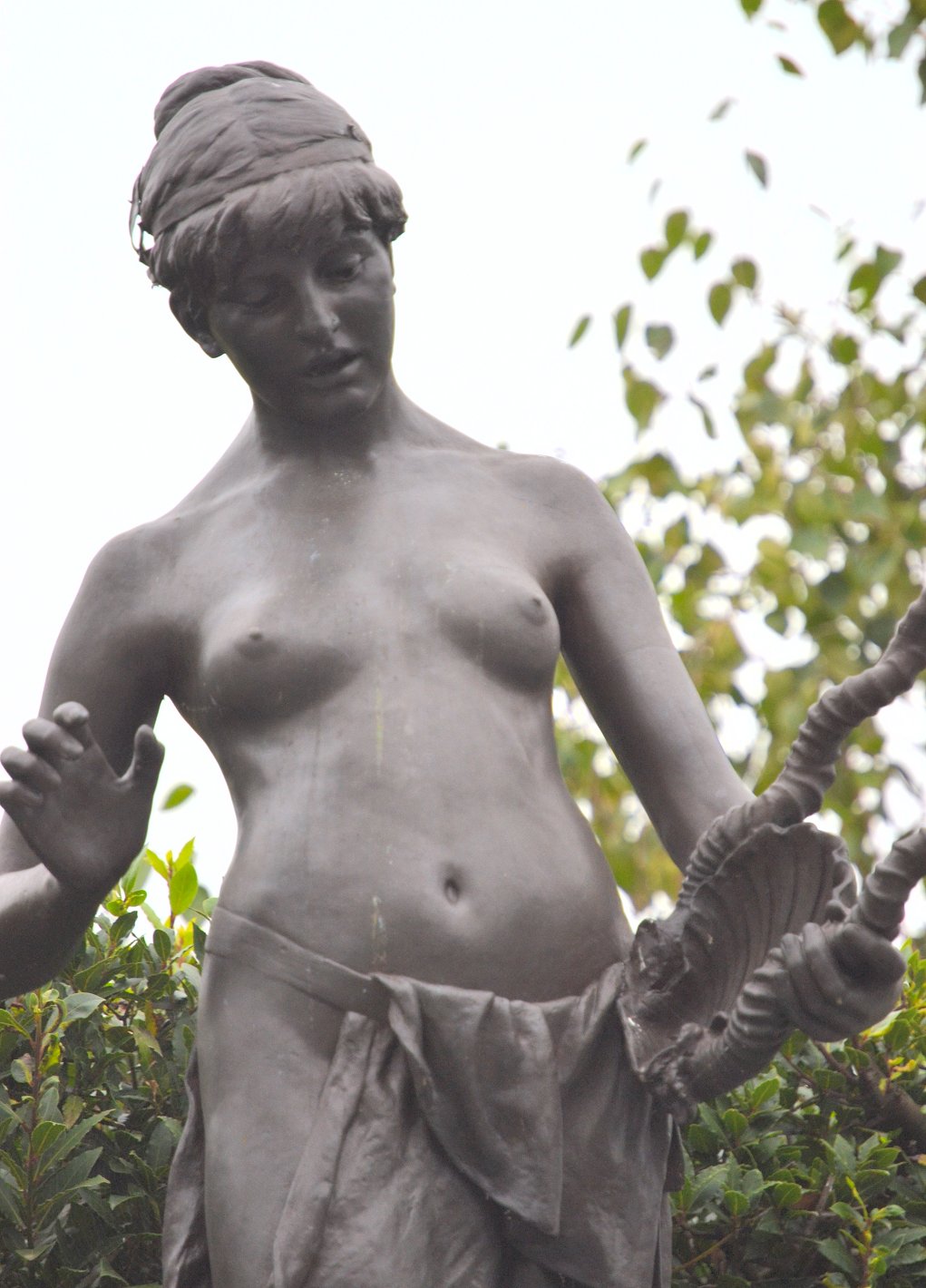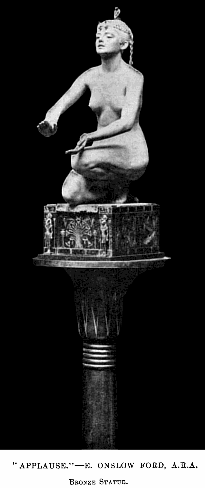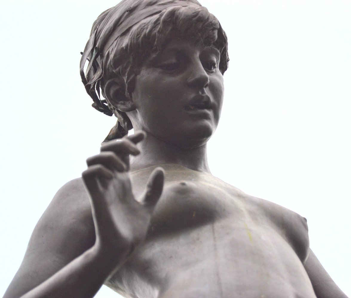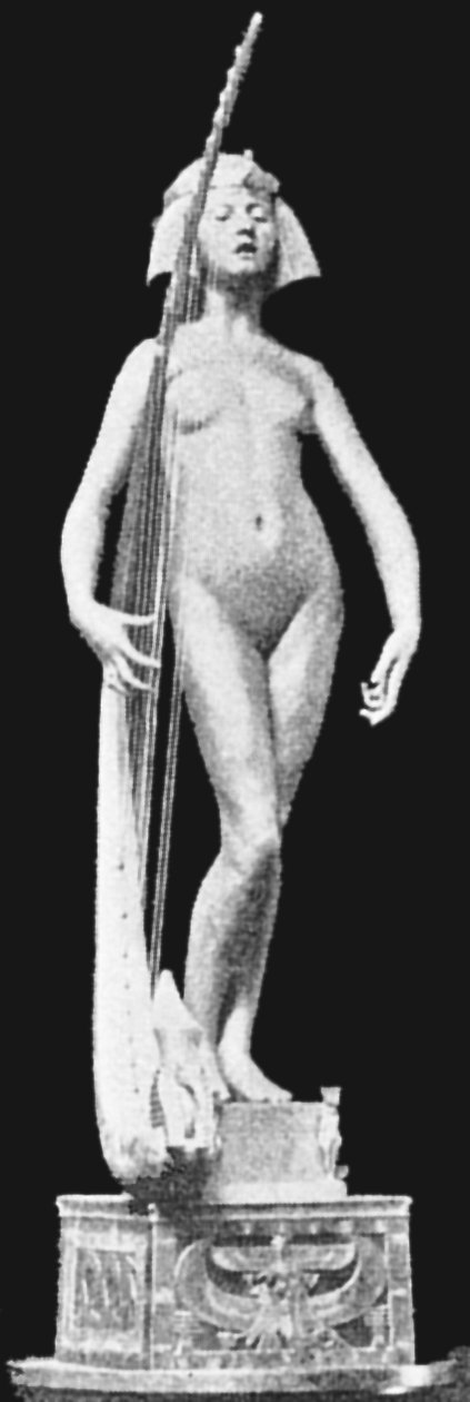 (1852-1901) The Singer and Other Works Revised and updated September 2010, August 2011, May-July 2013 and August 2014 This page has been massively expanded with new photos, and it ain’t quite done yet.. STILL TO BE ADDED: some photos of the Edward Onslow Ford memorial in London. PS: If you came here searching for Ford cars you’re in the wrong place The Singer | Applause | Folly | Peace | Topless Female Statues Shelley Memorial | The Snowdrift | Linos Introduction Skip Introduction The Late Mr. Onslow FordThe sudden death of Mr. Onslow Ford at the age of forty-nine is an event which gives one pause in the rush of contemporary life. As a near neighbour of Mr. Ford’s in St. John’s Wood I had many opportunities of recognising his kindly, genial nature; it was further a delight to talk with him on any subject pertaining to art or literature. His work, moreover, was so exceedingly varied; it included presentations in every branch of the world’s work; now he had for a sitter a member of the Royal Family, now a great general, and perhaps another day a distinguished actor... It was sometimes difficult to realise that Mr. Onslow Ford was an Englishman; he had at times well-nigh the appearance of a Spanish grandee. --Gossip of the Hour, The Tatler magazine, No. 27, January 1, 1902. Who can describe this gentle and amiable man? With the allure of the garçon du Quartier Latin, although I believe he studied only for a short time in Paris, his inner personality was that of a true-born, loyal Briton, with that intense love of home and of family life which is characteristic of the race. He was all his life dominated by two strong affections - love of his family and love of Art; and, as is usual where a man is not single-hearted in his loves, jealousies and conflicts occurred between the rival passions. But he was strong and patient in the depths of a nature that on the surface was so frail and fragile, that it vibrated like the leaves of an aspen at each breath of wind or touch of sunshine. He was born to enjoy much, and to suffer much. His life was comparable to the ever-restless seas that pass from buoyancy to calm, and from calm to storm, under the changing moods of mobile skies. We met in early life, and we walked side by side in joy and in sorrow until he died, nearly twenty years ago. He moulded his Follies and his Singers, “little waxen figures,” as a “friendly critic” once called them, and I limned my little portraits of big men; and we both were happy at our work and in our homes. John McClure Hamilton, Men I Have Painted, 1921 Edward Onslow Ford was one of the most highly-respected members of the so-called “New Sculpture” movement of the late 19th century, and I’ve gone out of my way (literally) to find and photograph as many of his nude works as humanly possible. You’ll find many of the results on this page, with more to follow. Sadly, like his near-contemporary Harry Bates, Ford did not live to see the age of 50. The exact cause of his death was never made public, but there is a suggestion that he may have committed suicide due to financial problems. Because of the massive stigma attached at the time, suicide was seldom publicised. If so, it’s a tragic end to a brilliant career. It’s a token of the respect in which he was held that his widow received dozens of letters and telegrams of condolence, including from such contemporary sculptors as Albert Toft, Alfred Gilbert, F. W. Pomeroy, William Goscombe John, Thomas Brock and George Frampton, as well as painter Arthur Hacker, and also one Maria Bates, presumably Harry Bates’s widow. Some of Ford’s statues spend most of their time locked away in basements, which I have always believed is a criminal waste. Consequently I was only ever able to view them in the form of photographs, some of them almost a hundred years old, or not at all.Then in the summer of 2010 the Tate Britain Gallery in London had an apparent rush of blood to the head, and opened a (sadly temporary) display area for “The New Sculpture” of the late 19th century. This included three of Ford’s statues, along with Pandora by Harry Bates. I was thrilled to be able to meet some of my favourite statues in the flesh (so to speak) for the first time, and I wasted no time photographing them in the round, including many angles that weren’t in the official photos. Conditions for photography were less than ideal (glass cases, artificial light and a total ban on flash), resulting in some grain, soft focus and stray reflections. Nonetheless, I don’t think my pictures came out looking too horrible, and you can now view the best ones here. Versions of some of my photos here have also been posted on my Flickr account, under the username Ketrin1407 (mostly before Flickr’s two idiotic redesigns). The Singer (1889) Found photos ![]() ![]() ![]() ![]() An Egyptian girl, naked but for a headdress, stands beside a tall harp...an image that, together wiith Albert Toft’s Spirit of Contemplation, inspired my adult story “The Singer”. Do not follow this link if you find erotic content offensive. Astonishingly, these four photographs were the only pictures of The Singer that I was ever able to find, apart from a couple of tiny images accompanying its official description on the Tate website (a few more have appeared there since then, accompanying a special feature about The Singer and Applause). Even from these few pictures it was clear that The Singer, with its beautifully observed figure, ornate decoration and gilding and carefully strung harp, was a remarkable piece of workmanship. Even so, seeing the real statue for the first time gave me an even greater respect for Ford’s skill. Tate Britain Gallery, London New Sculpture exhibition, August-September 2010
