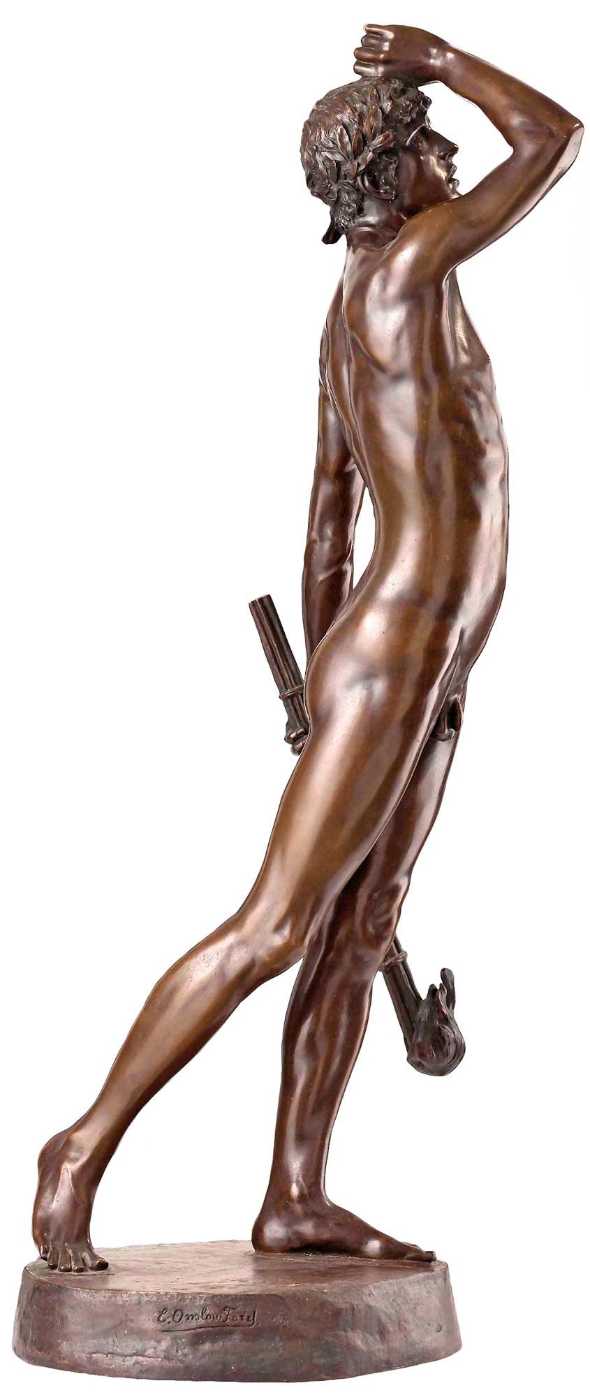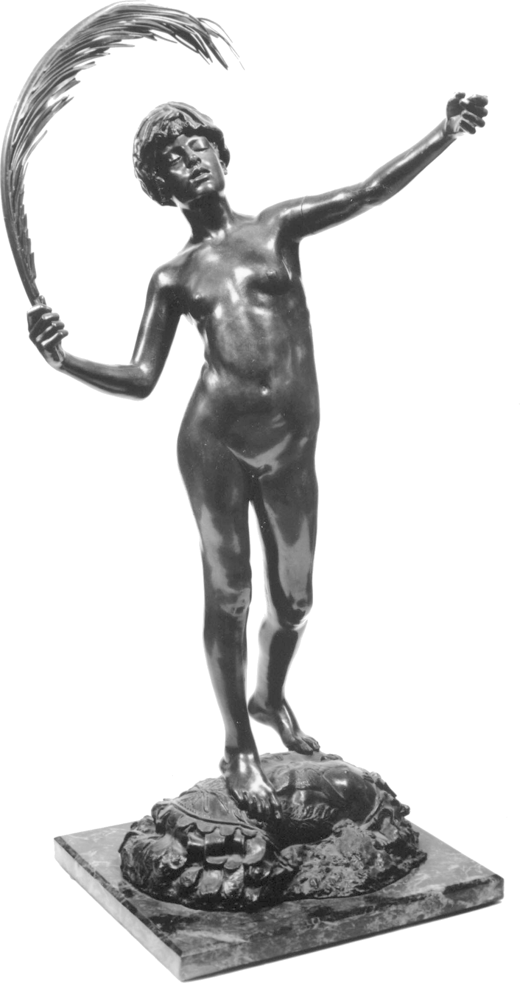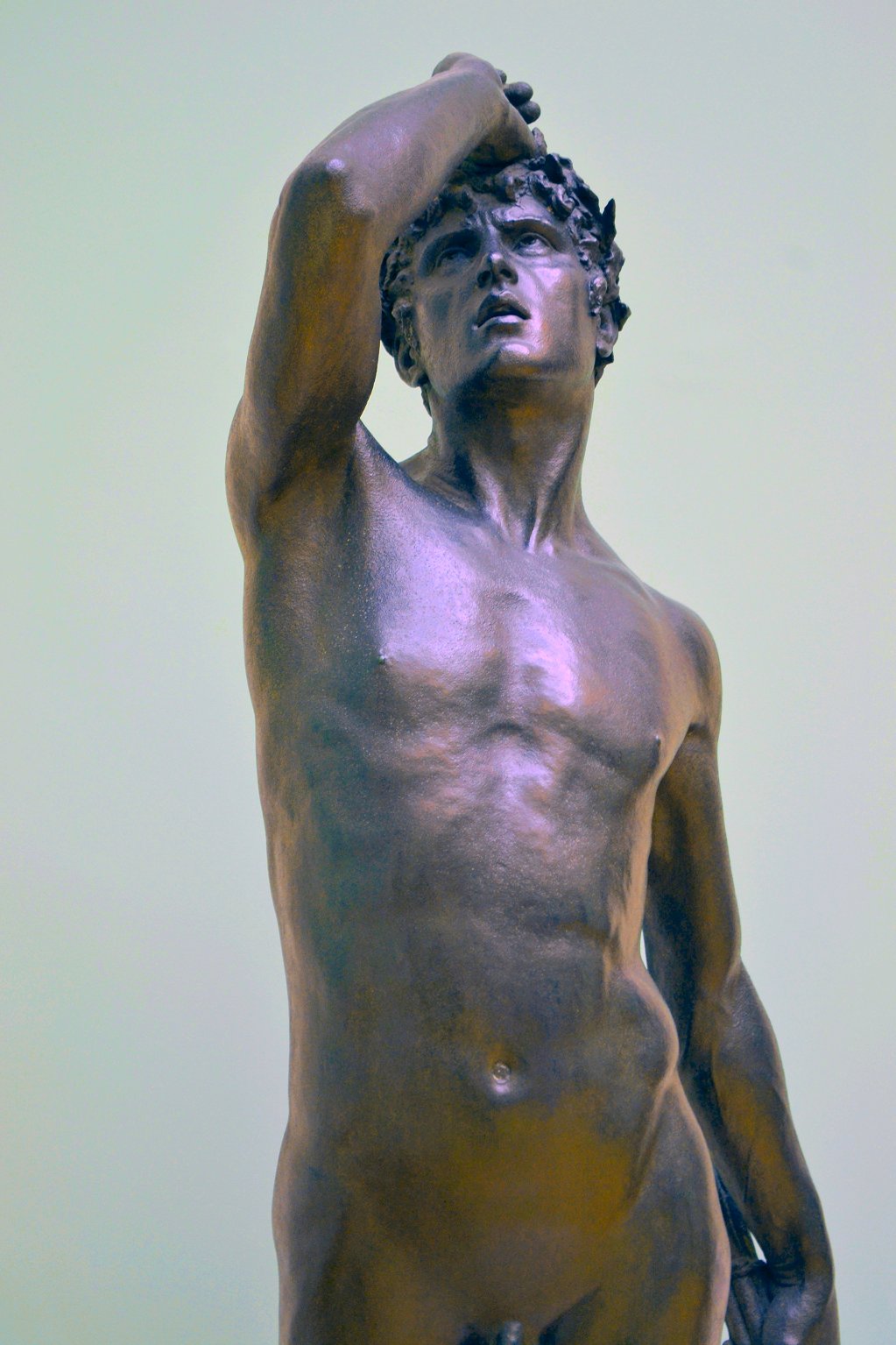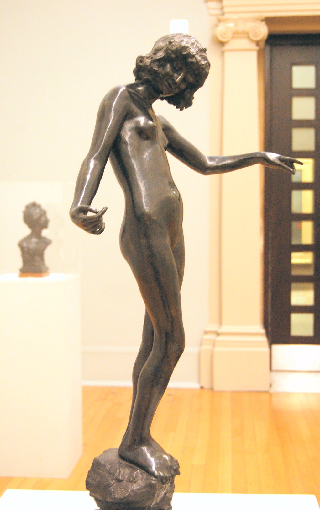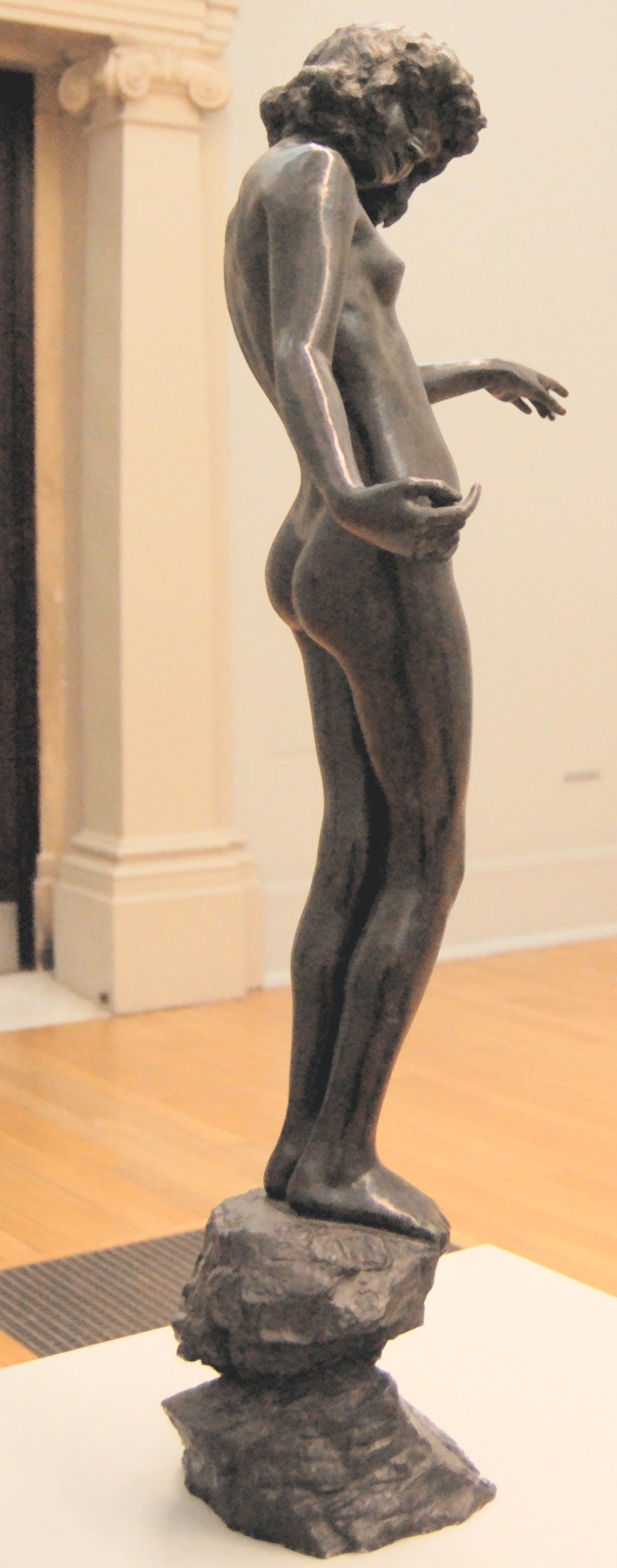 (1852-1901) The Singer and Other Works Revised and updated September 2010, August 2011, May-July 2013 and August 2014 This page has been massively expanded with new photos, and it ain’t quite done yet.. STILL TO BE ADDED: some photos of the Edward Onslow Ford memorial in London. PS: If you came here searching for Ford cars you’re in the wrong place The Singer | Applause | Folly | Peace | Topless Female Statues Shelley Memorial | The Snowdrift | Linos Introduction Skip Introduction The Late Mr. Onslow FordThe sudden death of Mr. Onslow Ford at the age of forty-nine is an event which gives one pause in the rush of contemporary life. As a near neighbour of Mr. Ford’s in St. John’s Wood I had many opportunities of recognising his kindly, genial nature; it was further a delight to talk with him on any subject pertaining to art or literature. His work, moreover, was so exceedingly varied; it included presentations in every branch of the world’s work; now he had for a sitter a member of the Royal Family, now a great general, and perhaps another day a distinguished actor... It was sometimes difficult to realise that Mr. Onslow Ford was an Englishman; he had at times well-nigh the appearance of a Spanish grandee. --Gossip of the Hour, The Tatler magazine, No. 27, January 1, 1902. Who can describe this gentle and amiable man? With the allure of the garçon du Quartier Latin, although I believe he studied only for a short time in Paris, his inner personality was that of a true-born, loyal Briton, with that intense love of home and of family life which is characteristic of the race. He was all his life dominated by two strong affections - love of his family and love of Art; and, as is usual where a man is not single-hearted in his loves, jealousies and conflicts occurred between the rival passions. But he was strong and patient in the depths of a nature that on the surface was so frail and fragile, that it vibrated like the leaves of an aspen at each breath of wind or touch of sunshine. He was born to enjoy much, and to suffer much. His life was comparable to the ever-restless seas that pass from buoyancy to calm, and from calm to storm, under the changing moods of mobile skies. We met in early life, and we walked side by side in joy and in sorrow until he died, nearly twenty years ago. He moulded his Follies and his Singers, “little waxen figures,” as a “friendly critic” once called them, and I limned my little portraits of big men; and we both were happy at our work and in our homes. John McClure Hamilton, Men I Have Painted, 1921 Edward Onslow Ford was one of the most highly-respected members of the so-called “New Sculpture” movement of the late 19th century, and I’ve gone out of my way (literally) to find and photograph as many of his nude works as humanly possible. You’ll find many of the results on this page, with more to follow. Sadly, like his near-contemporary Harry Bates, Ford did not live to see the age of 50. The exact cause of his death was never made public, but there is a suggestion that he may have committed suicide due to financial problems. Because of the massive stigma attached at the time, suicide was seldom publicised. If so, it’s a tragic end to a brilliant career. It’s a token of the respect in which he was held that his widow received dozens of letters and telegrams of condolence, including from such contemporary sculptors as Albert Toft, Alfred Gilbert, F. W. Pomeroy, William Goscombe John, Thomas Brock and George Frampton, as well as painter Arthur Hacker, and also one Maria Bates, presumably Harry Bates’s widow. Some of Ford’s statues spend most of their time locked away in basements, which I have always believed is a criminal waste. Consequently I was only ever able to view them in the form of photographs, some of them almost a hundred years old, or not at all.Then in the summer of 2010 the Tate Britain Gallery in London had an apparent rush of blood to the head, and opened a (sadly temporary) display area for “The New Sculpture” of the late 19th century. This included three of Ford’s statues, along with Pandora by Harry Bates. I was thrilled to be able to meet some of my favourite statues in the flesh (so to speak) for the first time, and I wasted no time photographing them in the round, including many angles that weren’t in the official photos. Conditions for photography were less than ideal (glass cases, artificial light and a total ban on flash), resulting in some grain, soft focus and stray reflections. Nonetheless, I don’t think my pictures came out looking too horrible, and you can now view the best ones here. Versions of some of my photos here have also been posted on my Flickr account, under the username Ketrin1407 (mostly before Flickr’s two idiotic redesigns). The Singer (1889) Found photos ![]() ![]() ![]() ![]() An Egyptian girl, naked but for a headdress, stands beside a tall harp...an image that, together wiith Albert Toft’s Spirit of Contemplation, inspired my adult story “The Singer”. Do not follow this link if you find erotic content offensive. Astonishingly, these four photographs were the only pictures of The Singer that I was ever able to find, apart from a couple of tiny images accompanying its official description on the Tate website (a few more have appeared there since then, accompanying a special feature about The Singer and Applause). Even from these few pictures it was clear that The Singer, with its beautifully observed figure, ornate decoration and gilding and carefully strung harp, was a remarkable piece of workmanship. Even so, seeing the real statue for the first time gave me an even greater respect for Ford’s skill. Tate Britain Gallery, London New Sculpture exhibition, August-September 2010