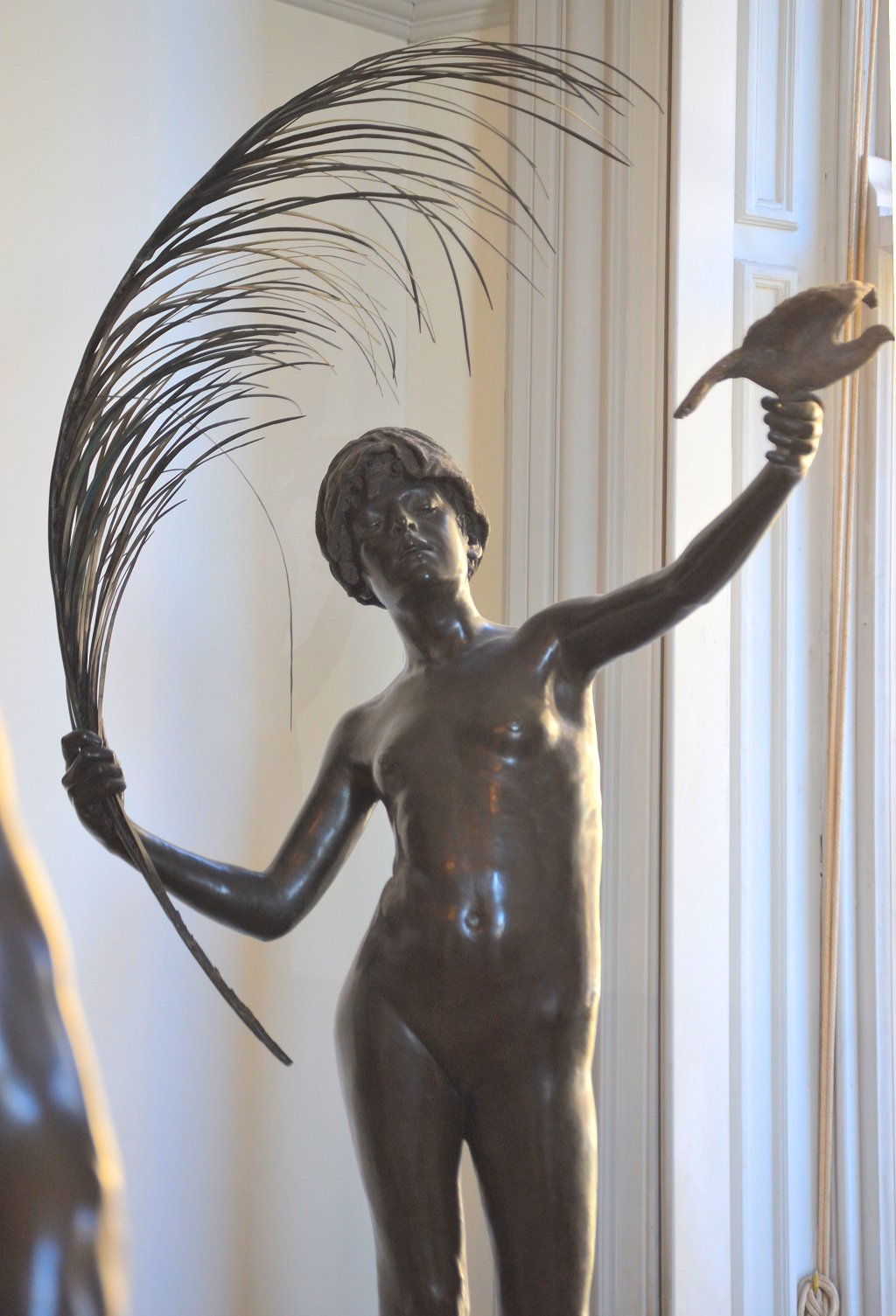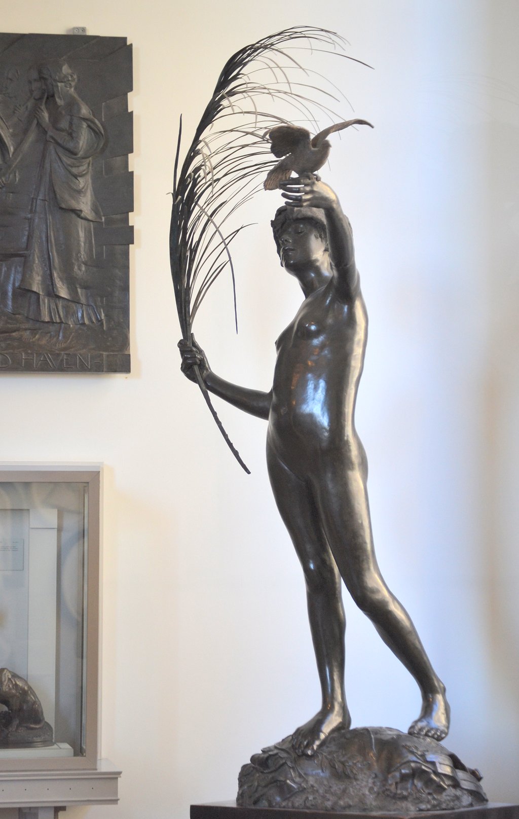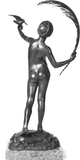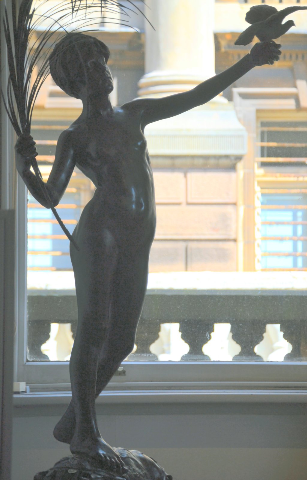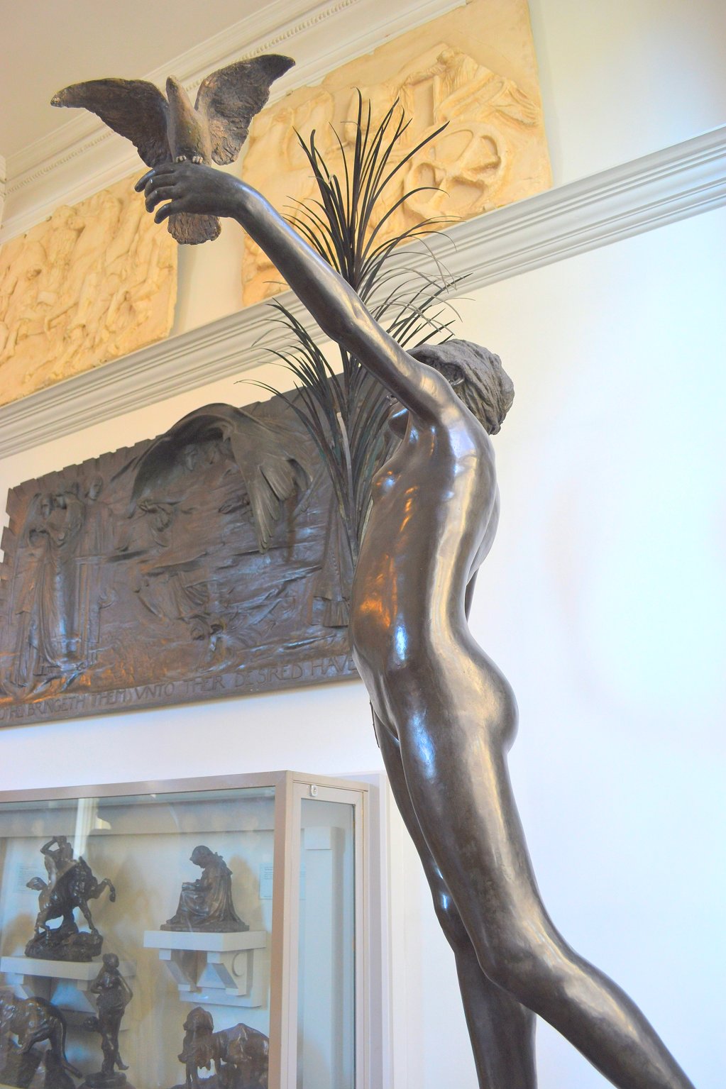 ![]() ![]() ![]() ![]() ![]() ![]() ![]() The spirit of Folly stands on the edge of a cliff beckoning us to follow. And all too often, human nature being what it is, we do... This was the only Tate statue by Ford I got to photograph that wasn’t in a glass case. There were still a few focus and exposure issues, but I don’t think the pictures came out too bad under the circumstances. With none of the ancillary decoration of the other statues this is by far the simplest of the three Ford works on display, but no less assured in its command of facial expression and body language. Peace (1887) Found photos: old book engraving and three bronze reproductions ![]() ![]() ![]() ![]() (1) Bronze statuette, colour (2, 3, 4) Lifesize bronze at the Walker Art Gallery, Liverpool, Flickr images; two by Sam the Sham and the Photos, December 2007, and one by Sheepdog Rex, January 2012 ![]() ![]() ![]() ![]() The figure of Peace holds an enormous palm frond and releases a dove - except in the upper left-hand bronze version, where the bird has evidently flown (possibly into the hands of an art thief). Speaking of Ford’s command of facial and body language... in this piece the girl’s face wears an expression of almost ecstatic euphoria. Given her tender years, maybe it’s best not to explore that in any great detail. The two pictures at bottom centre and right are from Flickr, with links to the relevant pages. They were taken at the Walker Art Gallery in Liverpool. I subsequently visited Liverpool myself, and my own photos of Peace can be seen below.