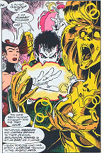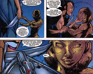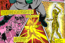 Meggan is touched and transforms into a golden statue. Early Joe Madureira