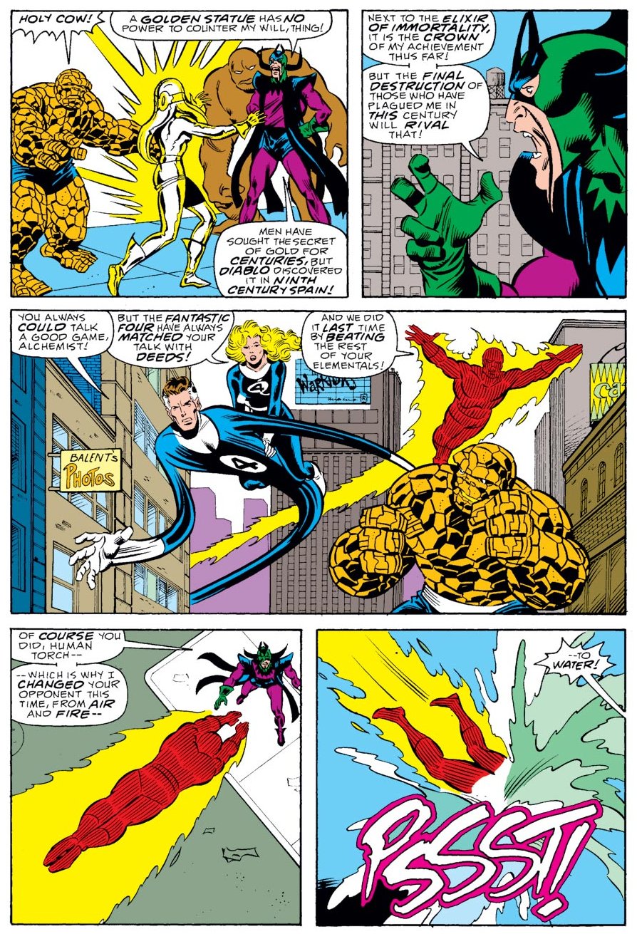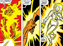Fantastic Four #20 (original series): Sue and the rest of the Fantastic Four coat themselves with plaster to resemble a group of statues sculpted by Alicia Masters. When the Molecule Man tries to convert the 'statues' into something else, his weakness against transforming living matter is revealed. (An unused cover version of the FF posing as statues and being menaced by the Molecule Man is found in the Jack Kirby Collector collected edition). Reprinted in Marvel Masterworks volume 6. [Marvel]