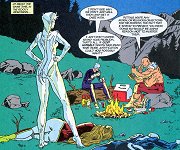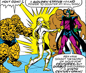 Fantastic Four #5 (current series): Crucible turns reporter Isabel Aguierre into a human gargoyle. Her face is flesh, but "the rest of her remains cold immobile stone" due to Crucible's ability to transform life itself. Pretty pic of her crouching, nude, and stone from the neck down. Hopefully Crucible will put his talents to use on Sue's soon! [Marvel]