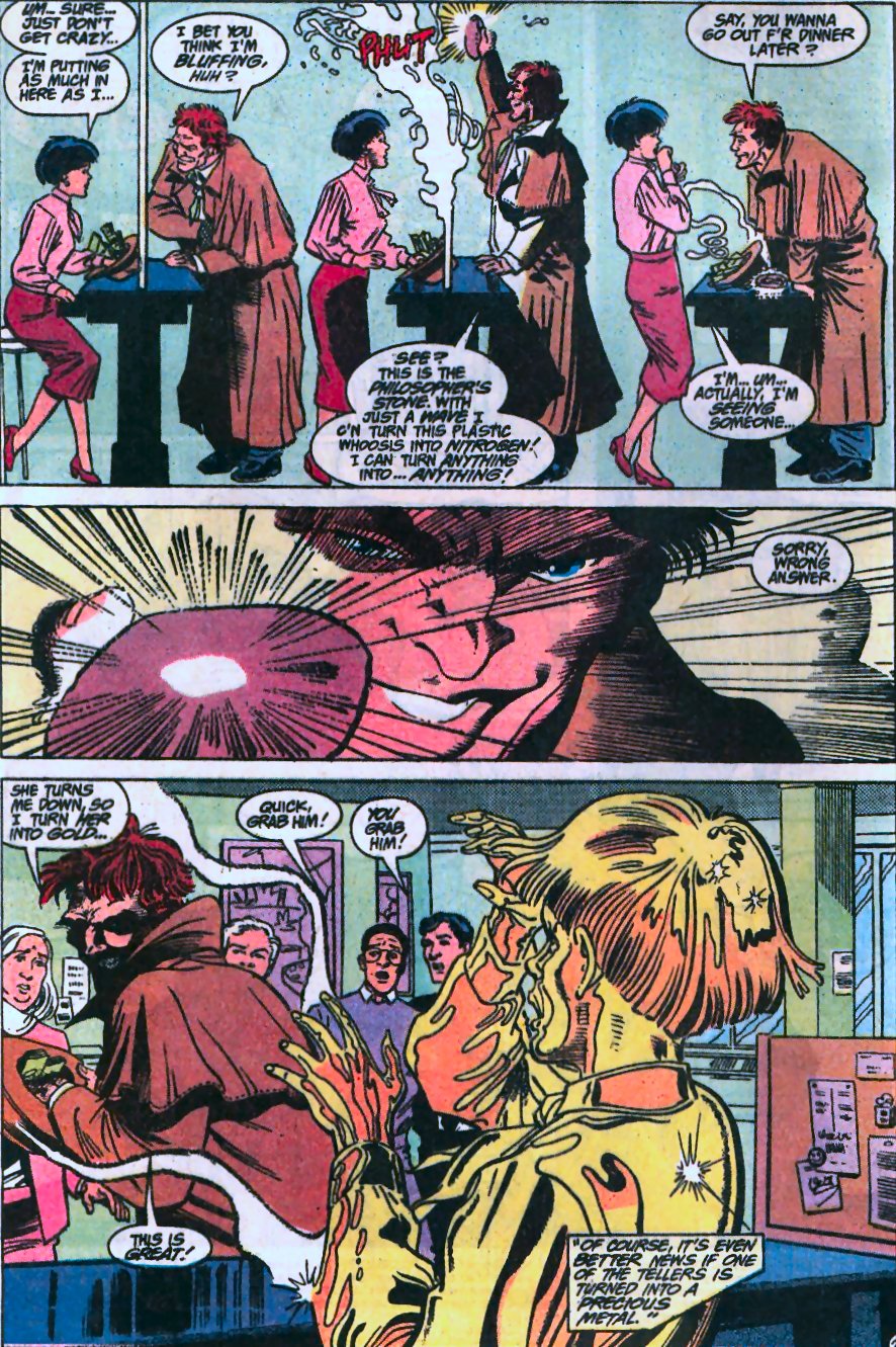 The Flash #41 (current series): Dr. Alchemy uses the Philosopher's Stone to turn a young lady to gold. (Shown Below at Left) [DC]