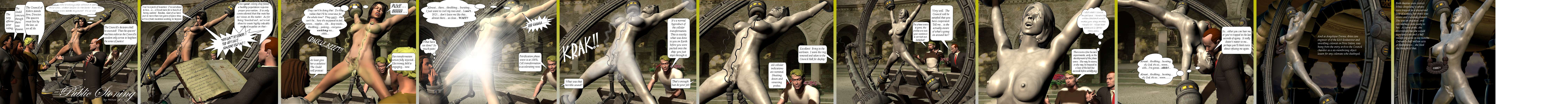 The buzzing was all around her now. She sensed a slight increase as Joneph took the controls. Please, let this all be over soon, whatever happens. Her back arched, sweat ran down her face. A low whine began, reverberating through her body, and out through the palms of her hands and soles of her feet, as if pouring up from the very bones of the earth itself. Now it begins, she thought in dread. She panted in deeply in fear, but also arousal. They can't... this can't be... how it's supposed to feel... mmm... nipples... clit... deep inside... throbbing... pulsing... everyone watching me! "...ohhh..." she moaned, nipples tightening rock-hard, diamond-hard, then beyond hardness, contracting to zero density as if swimming down a black hole. Fluids leaked down from between her legs where the probe spun and buzzed. "Aggh!" she cried, unable to keep it back. "Please... ohhh..." "What have we done? She's in so much pain..." the Prosecutor murmured. "Mind your own," Liese said shortly. "Keep us appraised, officer," he said to Joneph. "I want to know every detail." "Of course, Director," Joneph said in a patronizing tone. "Bio-transformation serum fully injected. Electromagnetic field is engaging now...." The tingling in her nipples and clit rose to unbearable levels. She wanted to squirm, dance where she was impaled, but she could not. She threw her head back, moaning in ecstasy. Everyone sees this, she thought, and there was shame in it, but also glory. She was fast approaching orgasm in front of hundreds of hostile strangers in this shameful device that might kill her, and... she didn't give a damn. Almost there... throbbing, bursting... I just want to curl my toes and ... I can't!... no... don't leave me like this... almost there... so close... WAIT!She opened her mouth to give a fullthroated cry of pure pleasure. "Petrification phase wave is at 100%... cell transformation accelerating now..." From the guts of the device came a monstrous crackling noise, tortured flicks of yellow-white energy playing over Angelique's outstretched form. "What's that noise?" Liese said in some urgency. "It's a normal byproduct of the cellular transformation," Joneph said, fingers playing at the controls. "This is exactly what was done to you on earth before you were packed on to the ship, you just slept through it." "That's enough! Do your job!" Liese snapped. "Oh! Gah!" Angelique cried. Then, she went silent. her body stopped the infinitesimal trembling and jerking and seized up, becoming still as a sculpture. Before the mesmerized eyes of the crowd she took on an ashy color that quickly darkened to iron-gray; at the same time she took on the texture of stone. Was stone. "All cellular indications are normal. Shutting down and removing probes." The vaginal and anal probes snaked themselves out, leaving visible channels in their wake. With them went the nipple probes, exposing a pair of stiff nipples pointed forever at the sky. A dark gray statue of a woman was suspended in the ring now. A statue trapped in the throes of sexual ecstasy... though many took it as pain. "Excellent," Liese murmured cruelly, eyes traveling over Angelique's suspended form. "Bring in the workmen, I want the ring removed and taken to the Council Hall for display." "People of New Salem, the first part of the sentencing has been carried out," the Council Leader announced. "Henceforth, for six months, pending further review, Miss Davies will be on display in the Council Hall for all to see, and take as precaution." The crowds began to disperse, some returning home or to places of work, others heading to the Council Hall to see the miscreant put on display. There was a curious mood among them. Some were subdued, others excited. Not a few looked back over their shoulders as if expecting Angelique to start writhing and moaning again, but she did not. "The phase waves are gone, the probes are out; your sentence is carried out. Satisfied?" Joneph said tiredly. "Very satisfied," Liese said coolly. "And the Council will be satisfied you have cooperated. Tell me... is she actually aware of what is going on around her?" I did what I could, Angelique. I knew the rotten bastard would make you stay awake. I knew it! I only hope that pleasure is better than pain. Joneph sighed, withdrawing from the console. He felt like he had blood on his hands, though he had acted for the best. "There were a few human experiments, Director Liese, early in the development of the phase wave, before the first spacers discovered how to calibrate the energies involved. Some became as Angelique, some... were unrecoverable. Of those who survived, their experiences differed. Angelique may be aware, or she may be trapped in a loop of the last few seconds before solidifying." Both men looked to the statue. Angelique's pretty face was caught in a grimace of ecstasy, teeth and tongue exposed, as if about to give cry; it was easy to imagine her last moments had been frozen forever. "At any rate, here is your six months of justice," Joneph said shortly. He moved off the speak to the Guild Leader, hoping, no doubt, to bring a turnaround to the situation. Liese knew that would not happen. He and the Guild had reached an uneasy accord over many years of being forced to depend on each other. The Guild had its power, but he had the final say. The workers had gone to fetch the draft horses, leaving him alone temporarily with the statue, so he spun her horizontal, bringing her cold, stony face close to his. Remarkable how lifelike she still was, yet definitely not alive -- at least in the way he knew. He stroked her cheek. The texture was not as smooth as a woman's skin, but had a slight stony burr, almost ironlike. The whole of her was very solid and unmoving. Cruelly he smiled. She might be very brittle as well. "Angelique," he whispered to her stony ear, "so you can either hear me, or you're trapped in the last few seconds of agony... It really doesn't matter to me, however." He chuckled