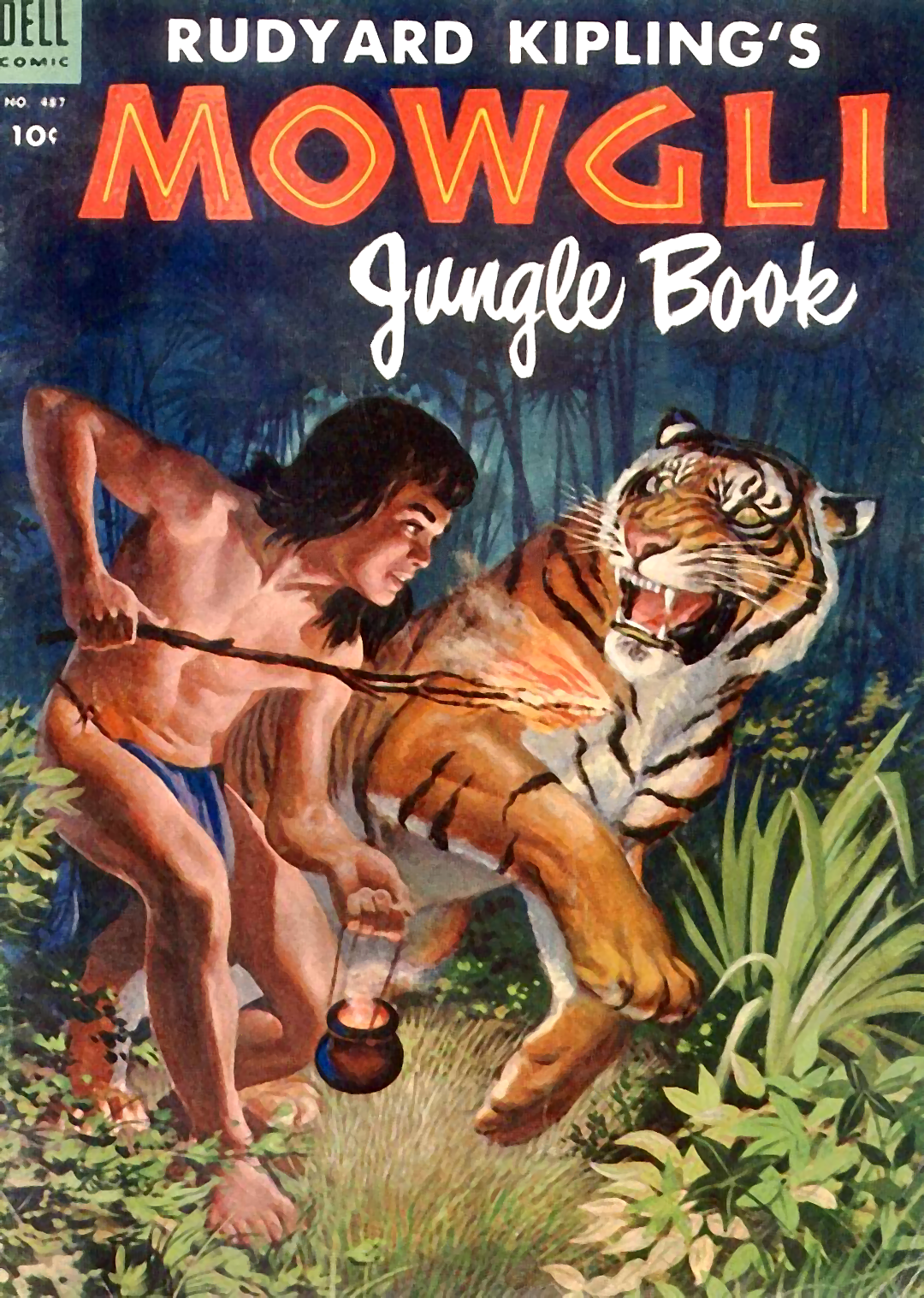 The first Mowgli comic, Dell #487, is based on the first two stories in The Jungle Book, “Mowgli’s Brothers” and “Kaa’s Hunting. In the original chronology, “Kaa’s Hunting” takes place between the first and second halves of “Mowgli’s Brothers”, so in the comic version the events of “Kaa’s Hunting” are sandwiched between the two halves of “Mowgli’s Brothers” to form a single narrative.