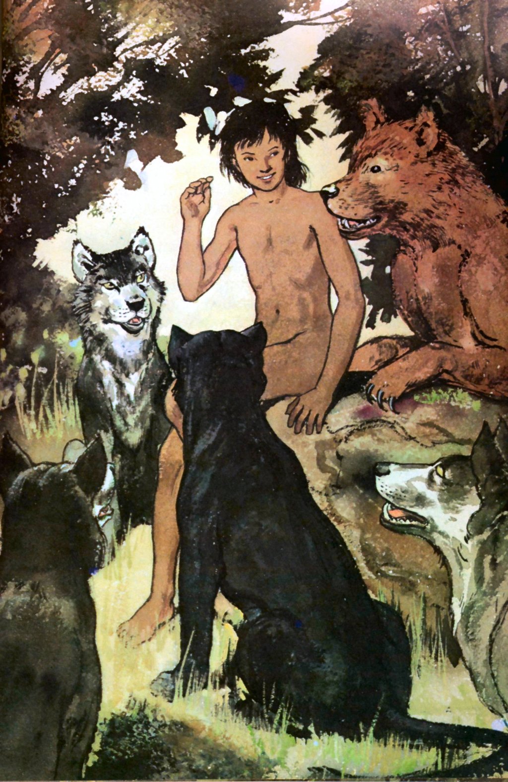 |  Mowgli (naked) and his animal friends: detail of an Illustration for Mowgli’s Brothers as seen in the anthology My Book House, Volume 5: Over the Hills, 1958, artist sadly unknown. |