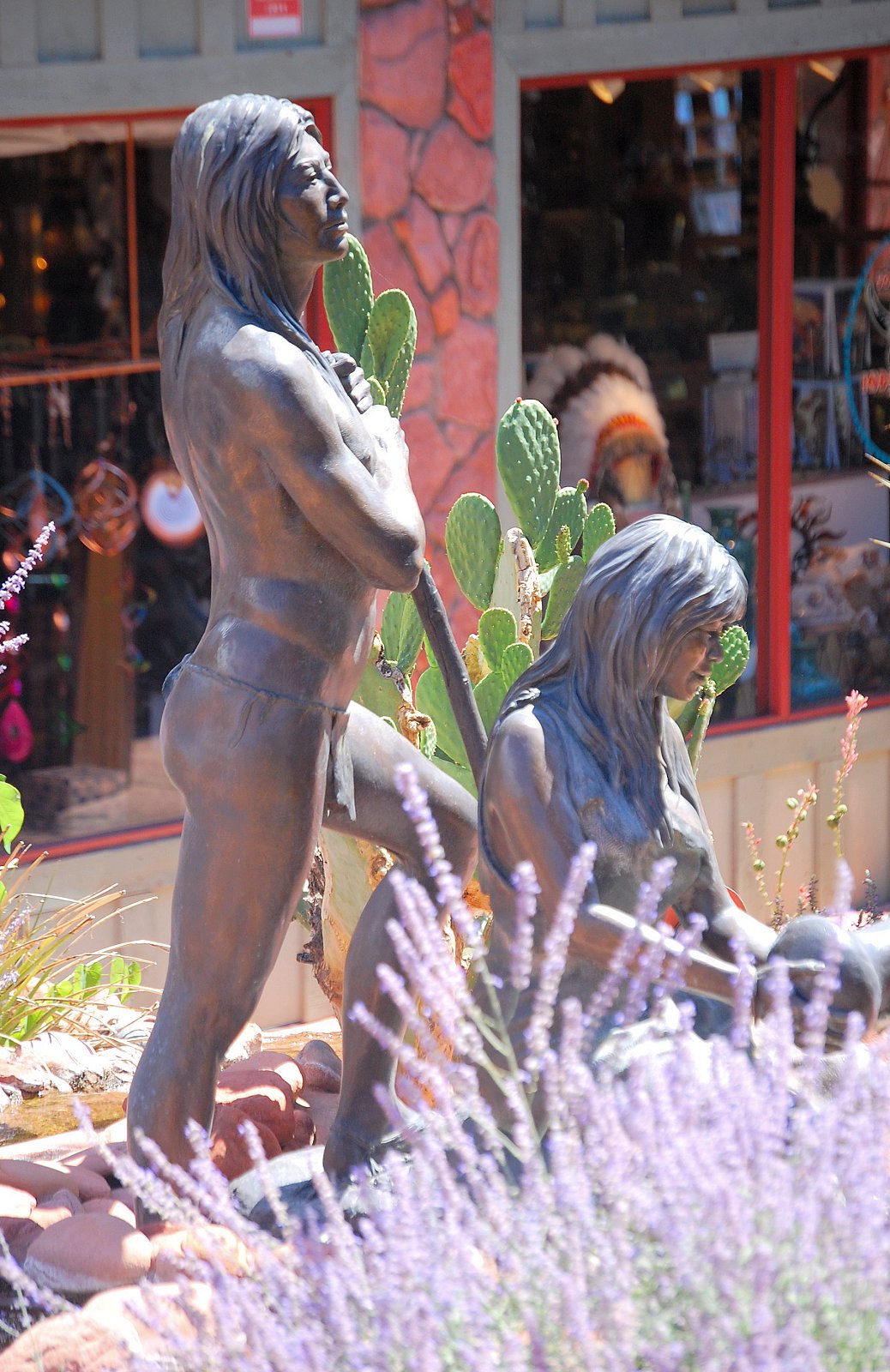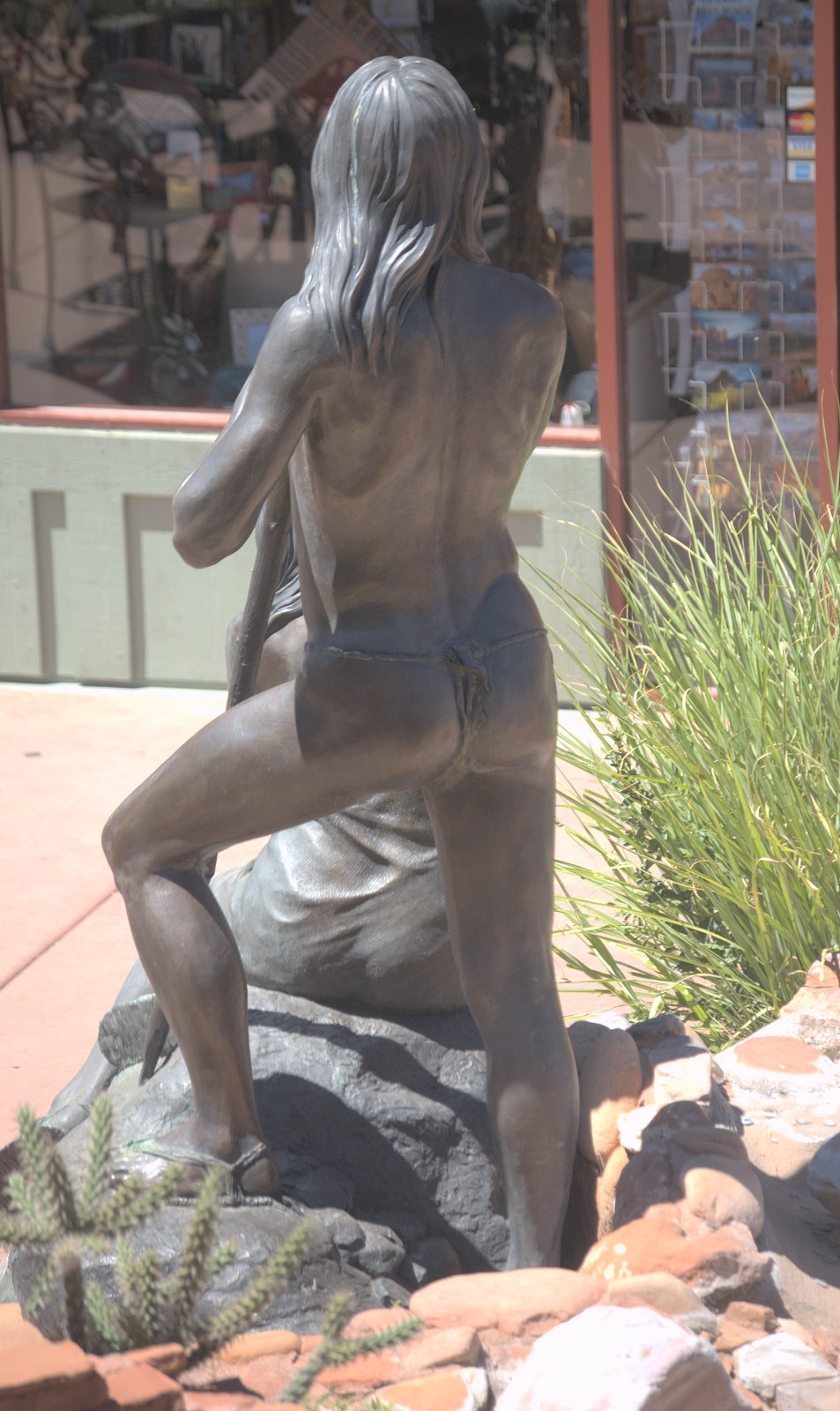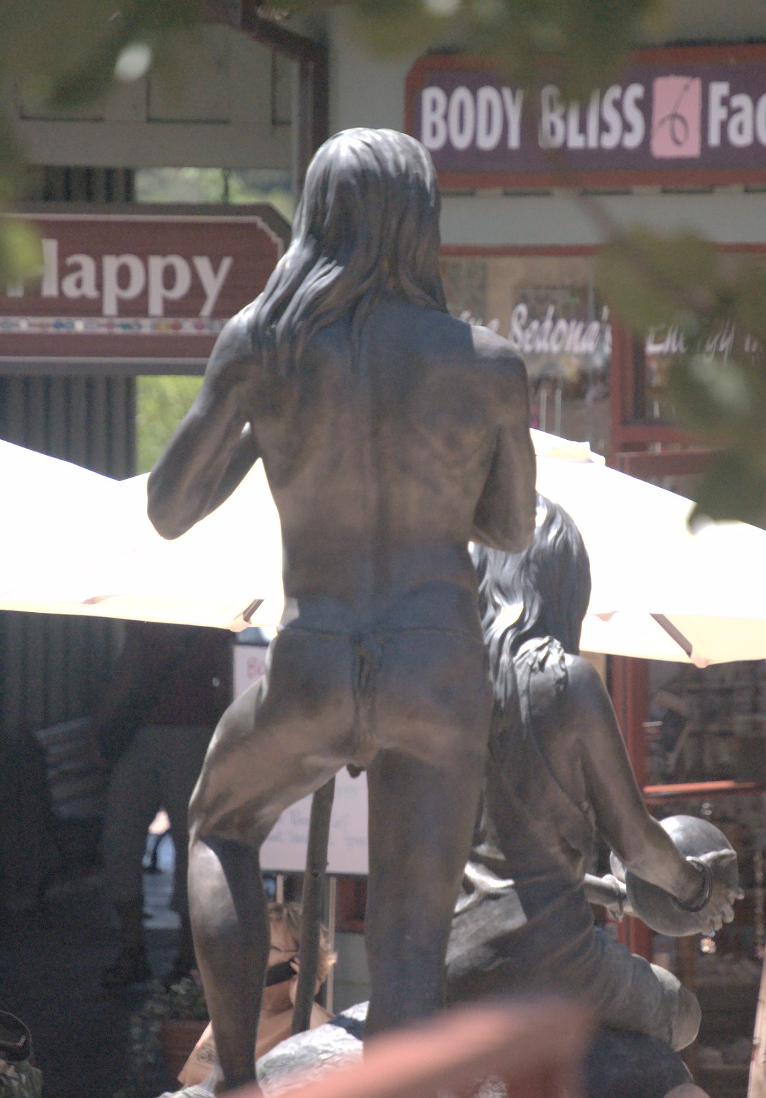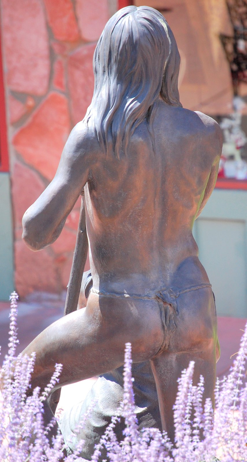 The ony living artist represented here, Susan Kliewer appears to be modest about her age, but has been living and sculpting in Sedona, Arizona for well over two decades. Not surprisingly, most of her statues have western themes. If you should ever take a tour of the American West (an experience I can thoroughly recommend) there’s a good chance you’ll pass through Sedona en route to the Grand Canyon. It’s an interesting little town - part artist’s retreat, part New Age vortex, and very large part tourist trap - located in the heart of picturesque Oak Creek Canyon with its distinctive red rock buttes and mesas. ![]() If while you’re there you have a bit of time between photographing the scenery, buying crystals and having lunch, you might want to drop in on Sinagua Plaza, just off the main street, where these guys are located. ![]() ![]() ![]() “Sinagua” is the name given to a long-vanished group of Native American peoples who lived in what is now Arizona between the 6th and 15th centuries AD. The figures in Kliewer’s fountain statue are supposedly representative of that culture, although I suppose their appearance is largely based on speculation. By the way, if this page piques your interest in this statue, you may be interested to know that a life-size copy was sold a few years ago for $65,000... You can still buy a small bronze version in a limited edition of 99 copies for a ‘mere’ $5,500 here. Personally, I’ll stick to photos - they’re a lot cheaper. When I photographed the statue it was part of a fountain, although in some of the pictures the water is off due to drought restrictions. A few years later it appears the fountain was removed, and the statue relocated to a standalone position nearby. ![]() ![]() ![]() ![]() The Plaza is on two levels, affording lots of good views of the statue except where obscured by the surrounding plants. Of course, what caught my eye about this statue was the male figure. The girl is pretty enough, but she’s quite modestly dressed (although it does look as though she might suffer a wardrobe malfunction if she raises her left arm). Compare that with the guy, who’s boldly stepping out in nothing more than a pair of flip-flops and a g-string. What was I saying about red buttes??? ![]() ![]() ![]() ![]() ![]() ![]() ![]() Versions of most of these photos have been posted on my Flickr account under the username “ketrin1407”. ![]() ![]() ![]() ![]() ![]() ![]() ![]() ![]() Many of these pictures were taken in August 2007 when the southwest was suffering a blistering heatwave. The temperature that day was aproximately 105° Fahrenheit (41° Celsius). Not that I minded all that much - I just daydreamed about what it would be like to be him, standing virtually naked in that heat all day and every day, watching all the crazy tourists coming and going, and never having to use sunscreen... ![]() ![]() ![]() ![]() And I guess the signs in the bottom (sic) right hand picture inadvertently sum up my feelings about this statue... “Happy” and “Body Bliss”! Thank you, and happy trails. Comment on This Page Site Introduction | Art Gallery Index | Return to Top of Page |