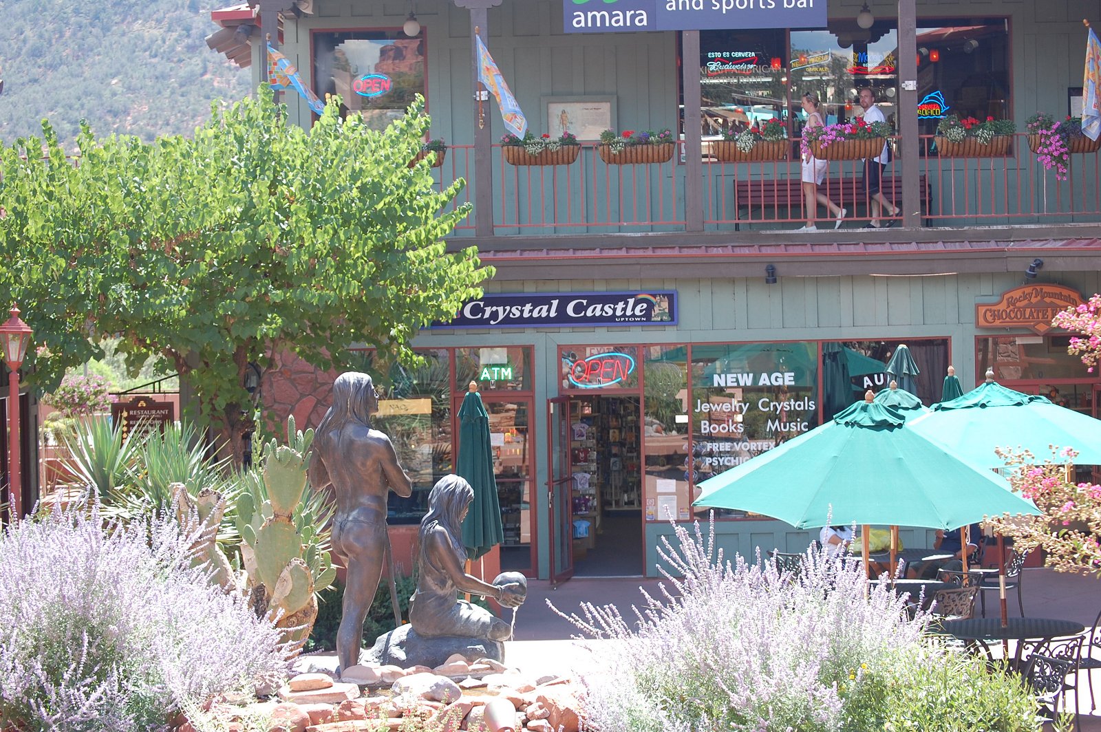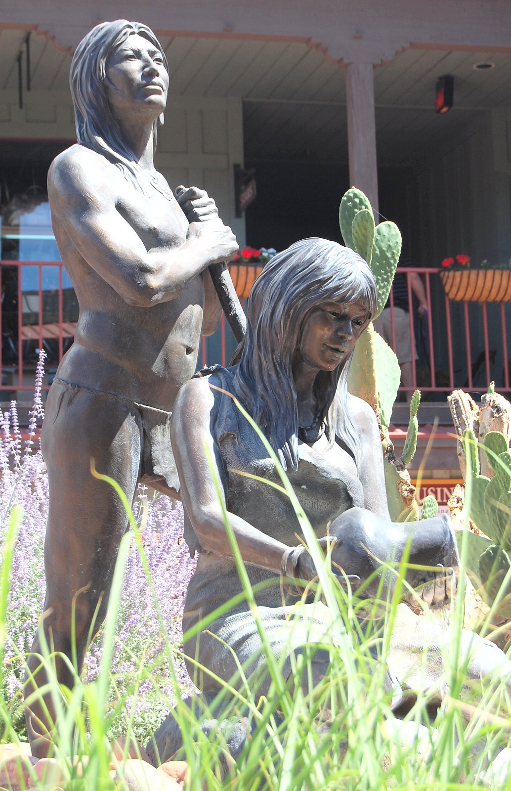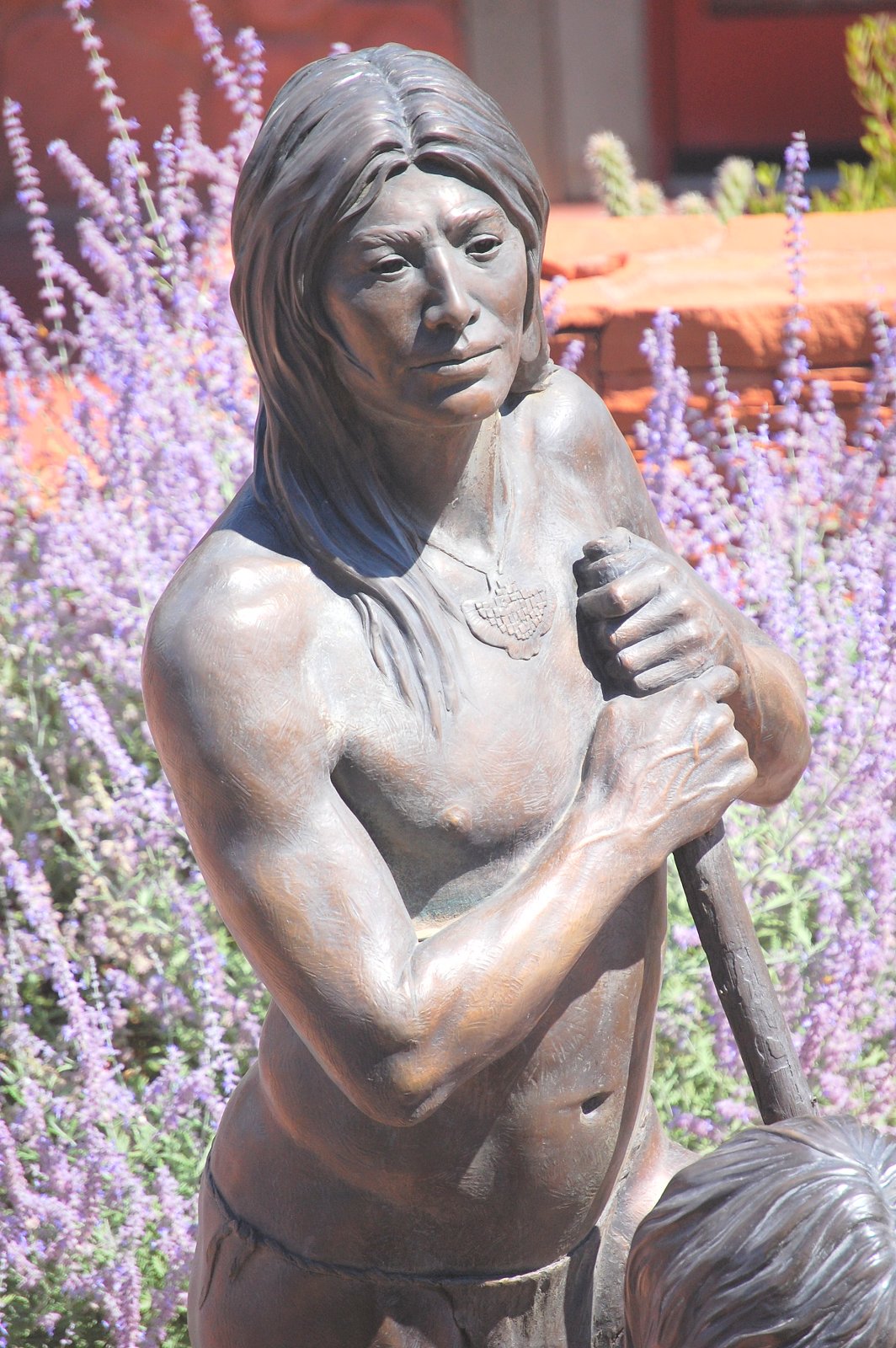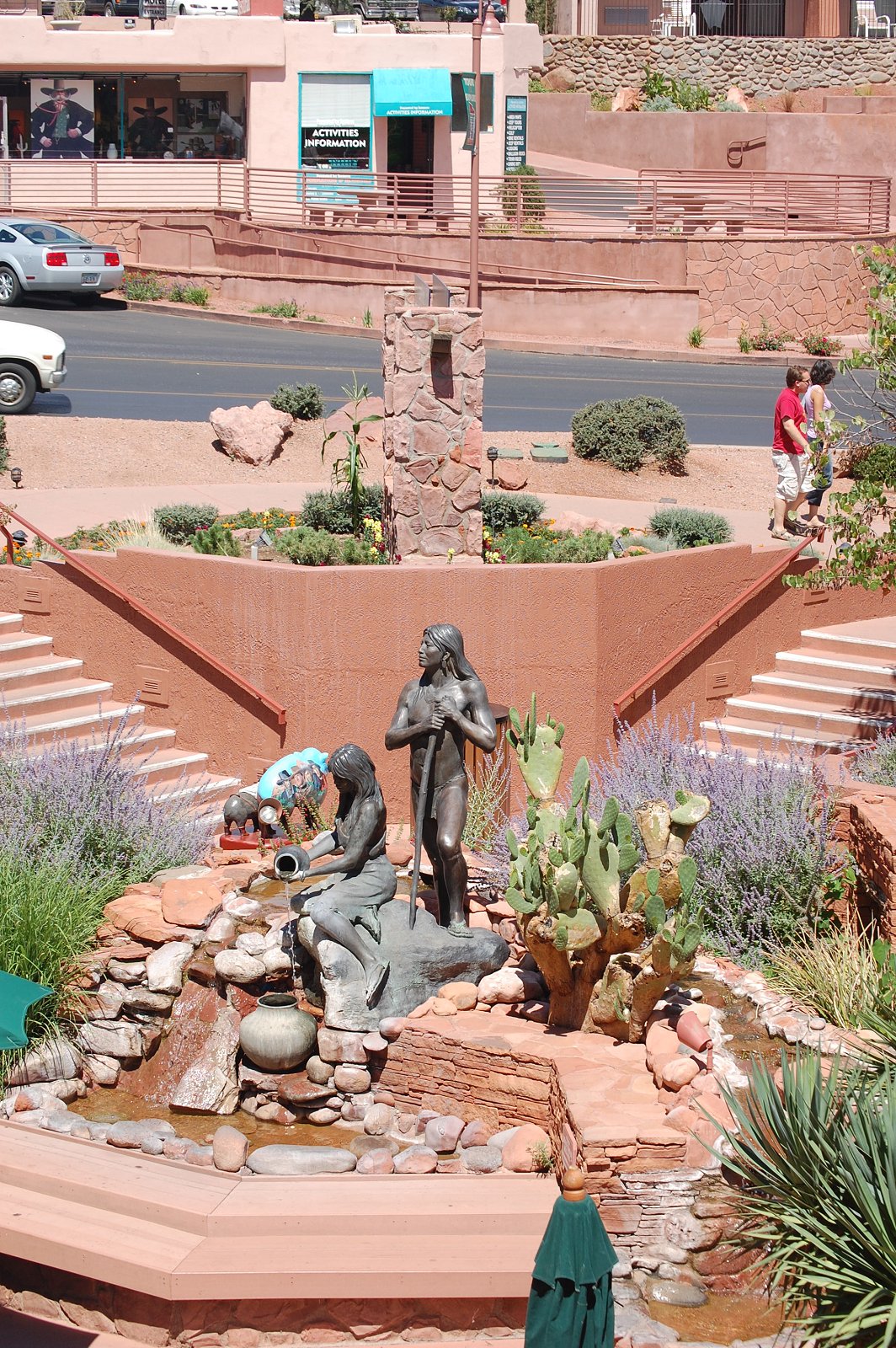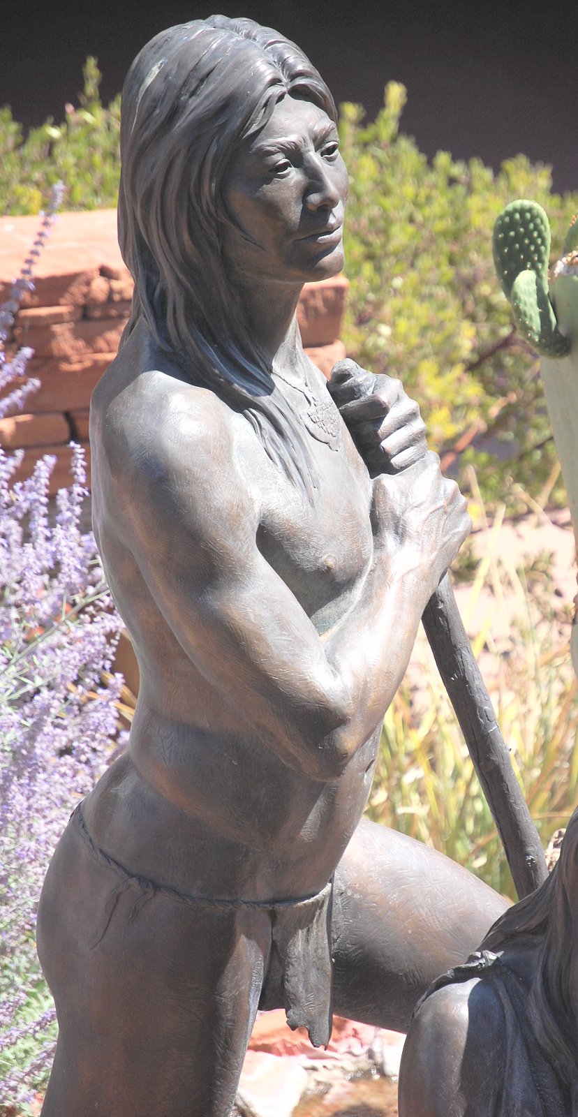 The ony living artist represented here, Susan Kliewer appears to be modest about her age, but has been living and sculpting in Sedona, Arizona for well over two decades. Not surprisingly, most of her statues have western themes. If you should ever take a tour of the American West (an experience I can thoroughly recommend) there’s a good chance you’ll pass through Sedona en route to the Grand Canyon. It’s an interesting little town - part artist’s retreat, part New Age vortex, and very large part tourist trap - located in the heart of picturesque Oak Creek Canyon with its distinctive red rock buttes and mesas. ![]() If while you’re there you have a bit of time between photographing the scenery, buying crystals and having lunch, you might want to drop in on Sinagua Plaza, just off the main street, where these guys are located. ![]() ![]() ![]() “Sinagua” is the name given to a long-vanished group of Native American peoples who lived in what is now Arizona between the 6th and 15th centuries AD. The figures in Kliewer’s fountain statue are supposedly representative of that culture, although I suppose their appearance is largely based on speculation. By the way, if this page piques your interest in this statue, you may be interested to know that a life-size copy was sold a few years ago for $65,000... You can still buy a small bronze version in a limited edition of 99 copies for a ‘mere’ $5,500 here. Personally, I’ll stick to photos - they’re a lot cheaper. When I photographed the statue it was part of a fountain, although in some of the pictures the water is off due to drought restrictions. A few years later it appears the fountain was removed, and the statue relocated to a standalone position nearby. ![]() ![]() ![]() ![]() The Plaza is on two levels, affording lots of good views of the statue except where obscured by the surrounding plants. Of course, what caught my eye about this statue was the male figure. The girl is pretty enough, but she’s quite modestly dressed (although it does look as though she might suffer a wardrobe malfunction if she raises her left arm). Compare that with the guy, who’s boldly stepping out in nothing more than a pair of flip-flops and a g-string. What was I saying about red buttes??? ![]() ![]() ![]() ![]() ![]() ![]() ![]() Versions of most of these photos have been posted on my Flickr account under the username “ketrin1407”. ![]() ![]() ![]() ![]() ![]() ![]() ![]() ![]() Many of these pictures were taken in August 2007 when the southwest was suffering a blistering heatwave. The temperature that day was aproximately 105° Fahrenheit (41° Celsius). Not that I minded all that much - I just daydreamed about what it would be like to be him, standing virtually naked in that heat all day and every day, watching all the crazy tourists coming and going, and never having to use sunscreen... ![]() ![]() ![]() ![]() And I guess the signs in the bottom (sic) right hand picture inadvertently sum up my feelings about this statue... “Happy” and “Body Bliss”! Thank you, and happy trails. Comment on This Page Site Introduction | Art Gallery Index | Return to Top of Page |