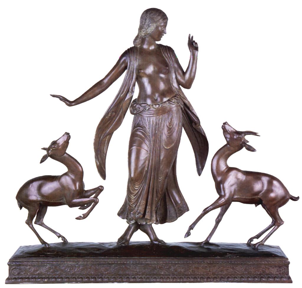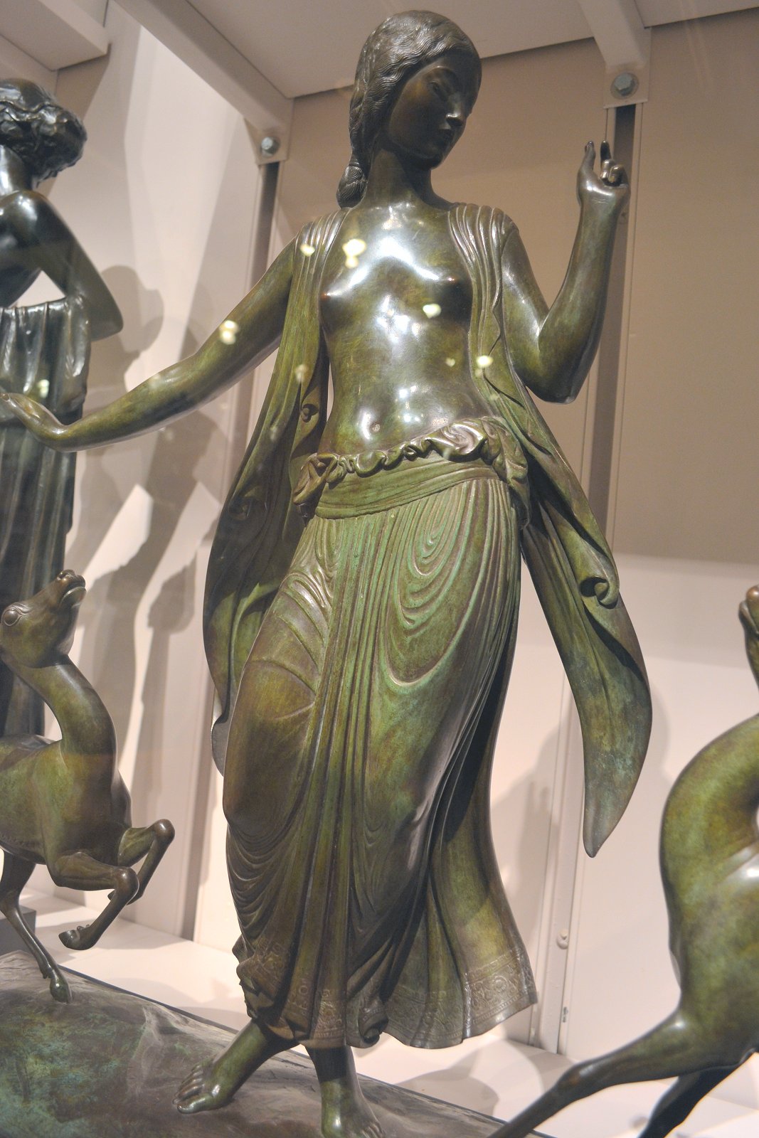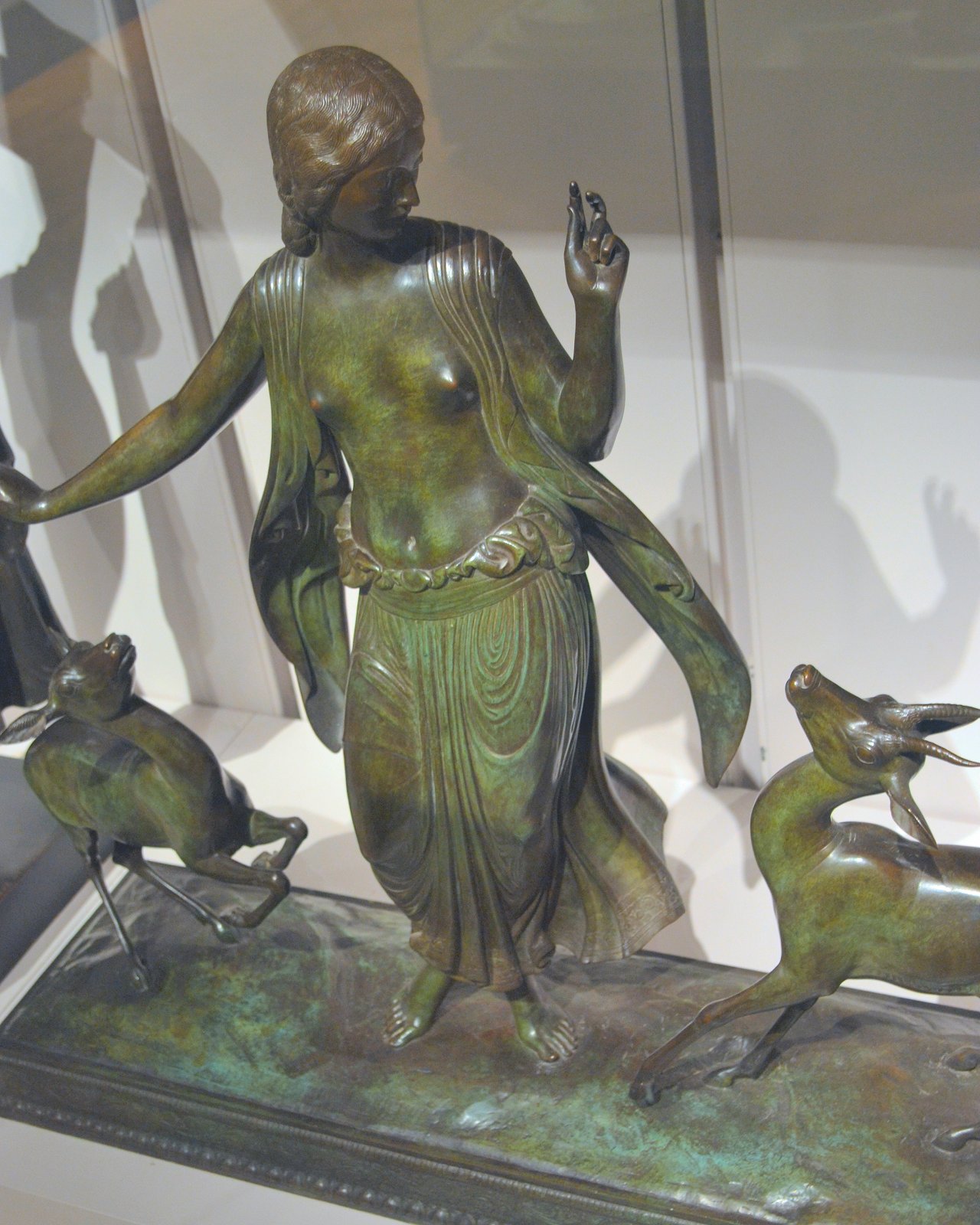 The Dancer’s situation is slightly more plausible. Her headscarf and gauzy costume suggest that she might be from India. She has trained the gazelles to dance alongside her in response to her hand signals. The statue captures a moment in which she restrains one and coaxes the other with her gestures. Diana and Actaeon (lifesize)