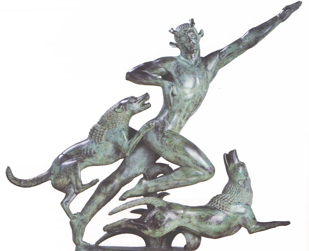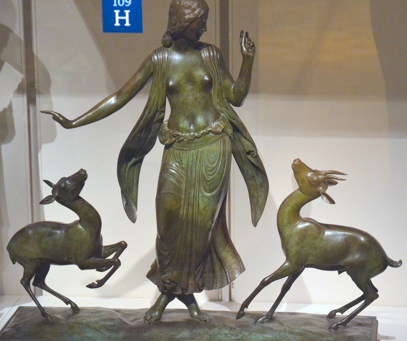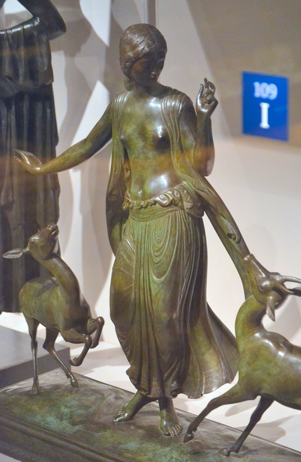 The Dancer’s situation is slightly more plausible. Her headscarf and gauzy costume suggest that she might be from India. She has trained the gazelles to dance alongside her in response to her hand signals. The statue captures a moment in which she restrains one and coaxes the other with her gestures. Diana and Actaeon (lifesize)