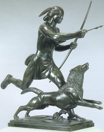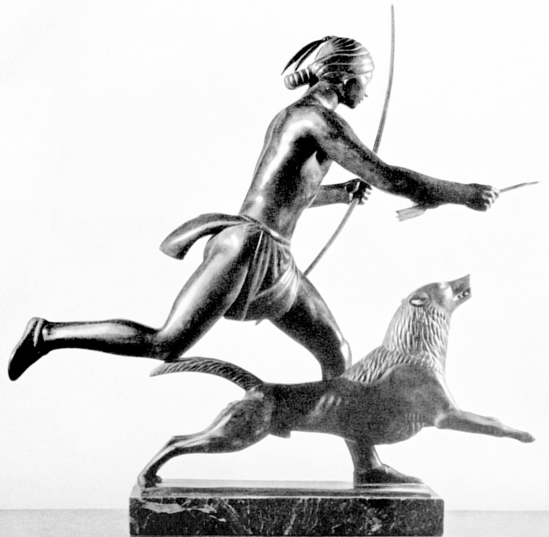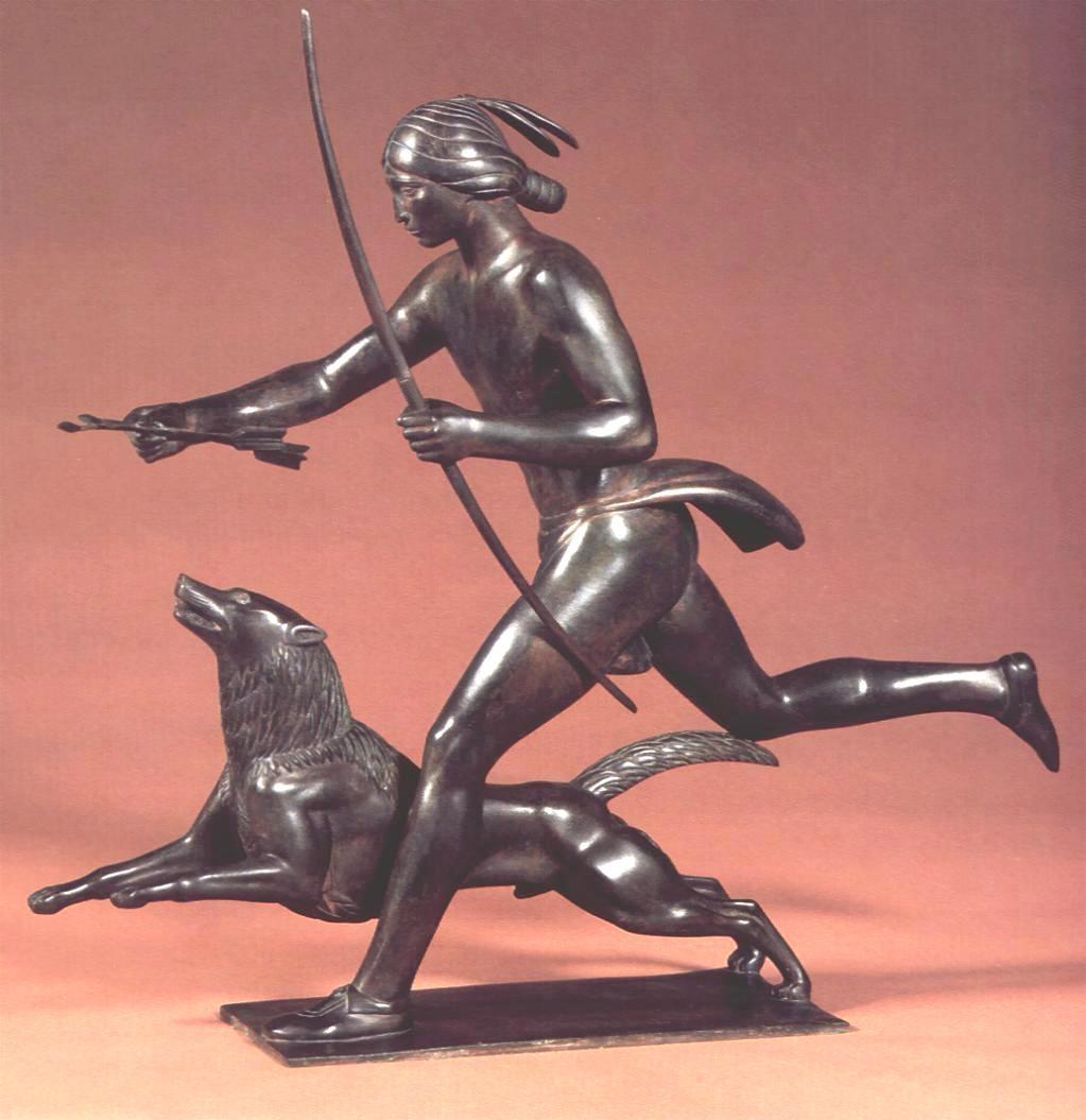 The lifesize Diana has numerous differences from the earlier statuette, notably the position of Diana’s right hand as she reaches for an arrow, her stylised art deco hair, and the position of her left thumb as she holds the bow. And now for the first time we see her quarry. Actaeon was a mortal hunter who came upon Diana bathing one day. Enraged by this invasion of privacy the goddess shot him with an arrow that transformed him into a stag and he was torn to pieces by his own hounds. In Manship’s version he is still mostly human in form, with only the shapes of his ears and a pair of budding antlers indicating that the change has begun. But the hounds are already attacking him mercilessly, presumably indicating that his scent has already changed beyond recognition. It is quite unusual to see violence depicted so graphically in sculpture, although the ancient Laocoön Group (depicting Laocoön and his two sons attacked by venomous snakes) sets a precedent for it. ![]() A pair of living statue performers as Diana and Actaeon, date and location unknown but believed to be late 1990s or early 2000s, somewhere in the United States. Unfortunately there doesn’t seem to be a better photo anywhere. Indian Hunter and his Dog - miscellaneous versions