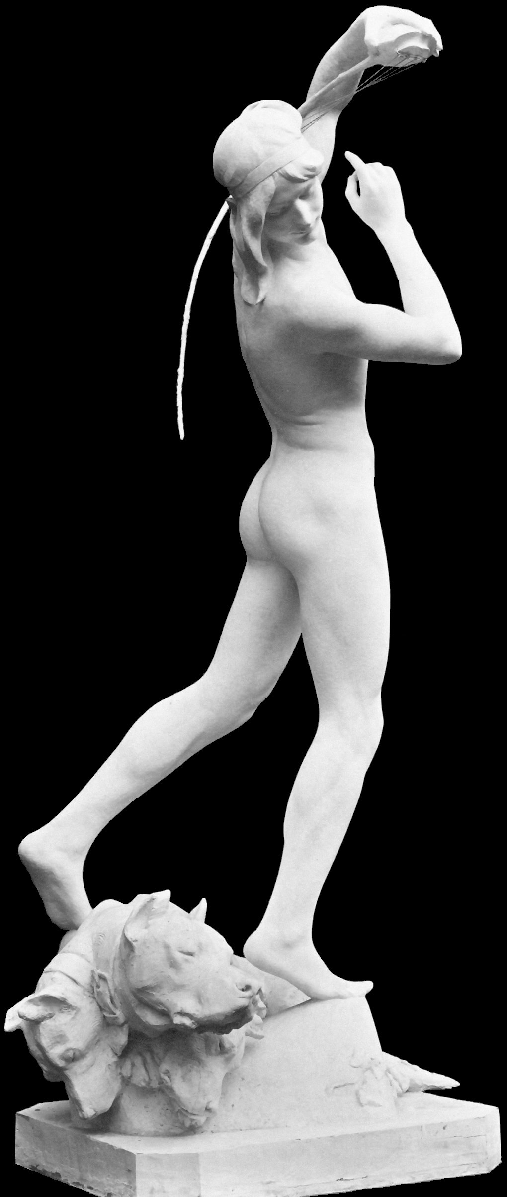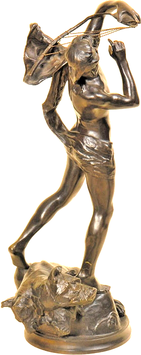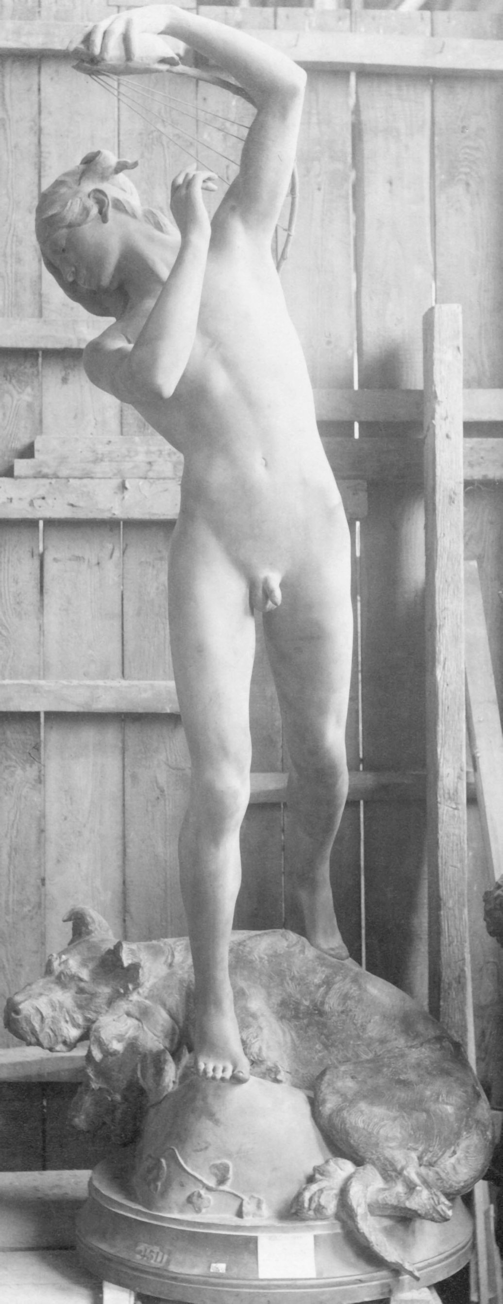 This statue depicts Orpheus singing a lullaby to put the three-headed dog Cerberus, guardian of the Underworld, to sleep. (And yes, J. K. Rowling did steal the idea for the first Harry Potter book.) The first picture is cleaned up from a vintage sepia photo that I found on the internet - don’t you just love the angle on this one? The second picture is also a vintage shot, possibly taken in the artist’s studio - pity about the ugly wooden gate in the background. The final picture shows a bronze reproduction, by an amazing coincidence matching the angle of the first picture, and here, as all too often in reproduction bronzes, we see censorship rearing its ugly head and obscuring poor Orpheus’s finest asset.