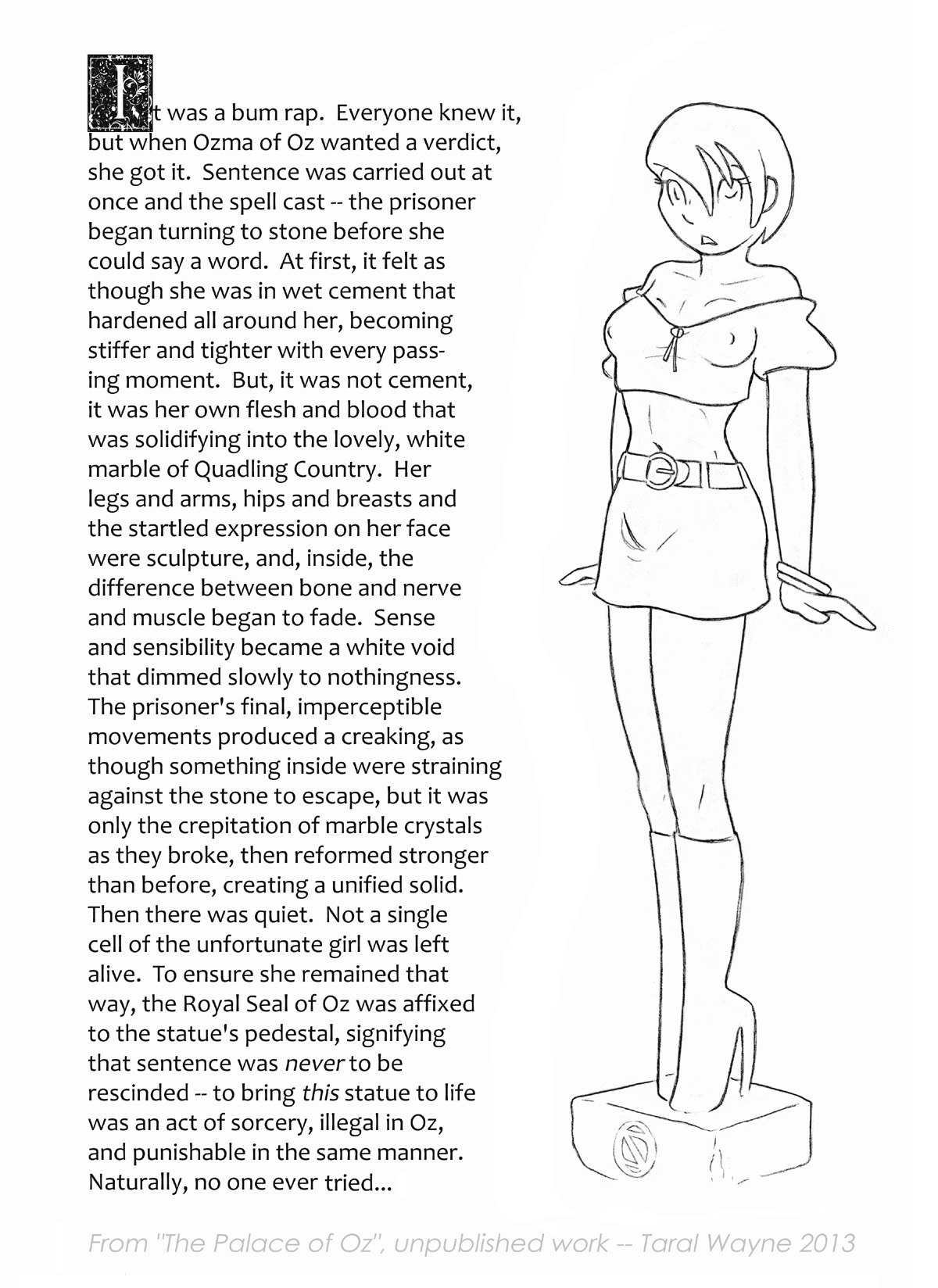 | Note by Leem: Scaled to fit - see full-size image. Originally posted on Taral’s FurAffinity pages, with the comment: There is a surprising amount of petrification in L. Frank Baum’s Oz books ... also a surprising amount of taxidermy and beheading, but I don’t find those to be as appealing. In one of the books, some Quadling’s or Munchkin’s elderly parents are accidentally turned to stone (by a witch’s potion, I believe) and the bereaved son seeks an audience with the Princess of Oz herself. But Ozma has outlawed witchcraft throughout Oz, and declares that she cannot break her own law by bringing the statues back to life! Tough nuggies, she tells the kid, in a winsome, adorable way you have to love. So the kid goes off to find a magical counterspell anyway. Wouldn’t you? This drawing of one of Ozma’s courtiers turned to stone was inspired by the story, though it would mean that Ozma could hand out magical punishments at will, even if she wouldn’t use magic to do good. But at my age, I expect hypocrisy from government. Leem here. It occurs to me that if Ozma wants to pass a hypocritical sentence she can always do what Cordwainer Smith’s Lords of the Instrumentality would do under similar circumstances - order it added to the record, and then strike the record from the record. Comment on this picture | Index | Return to Top of Page |