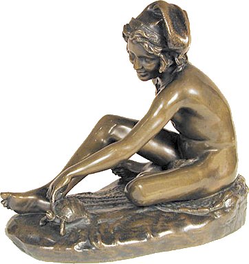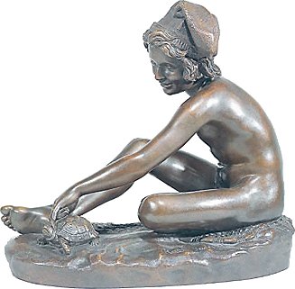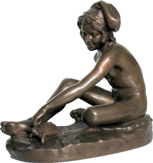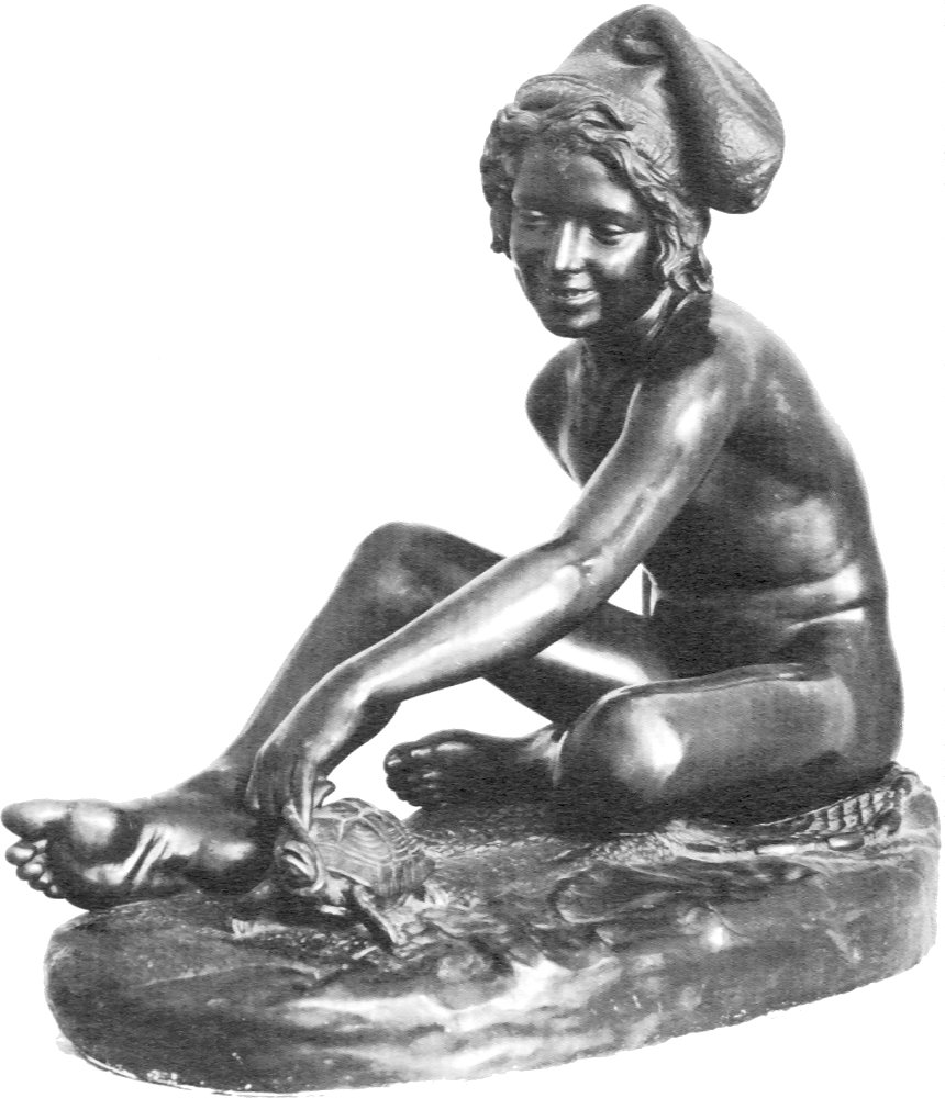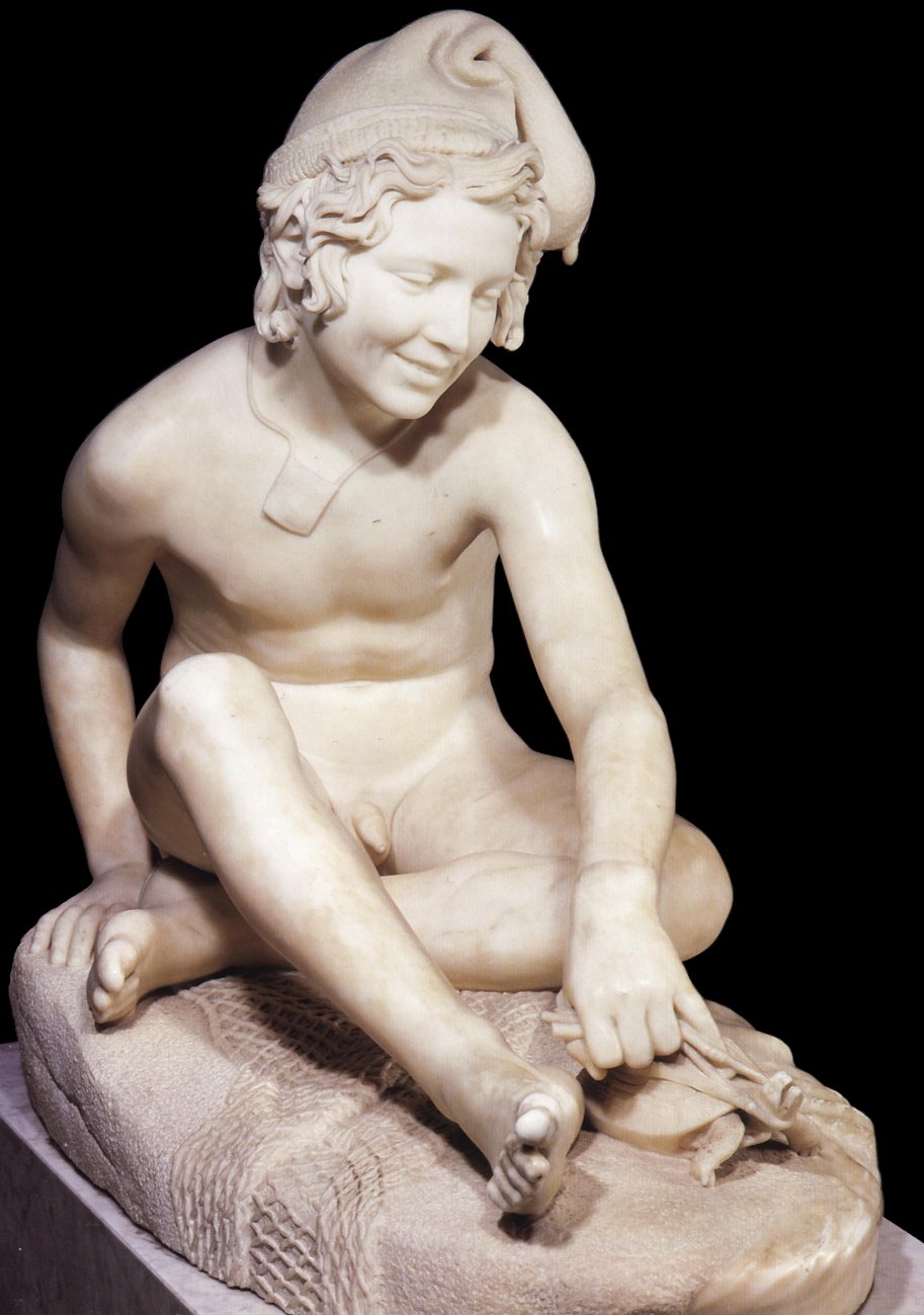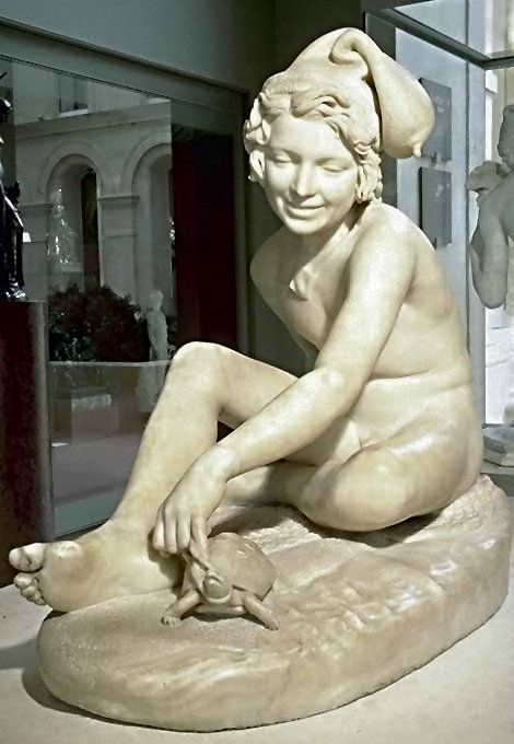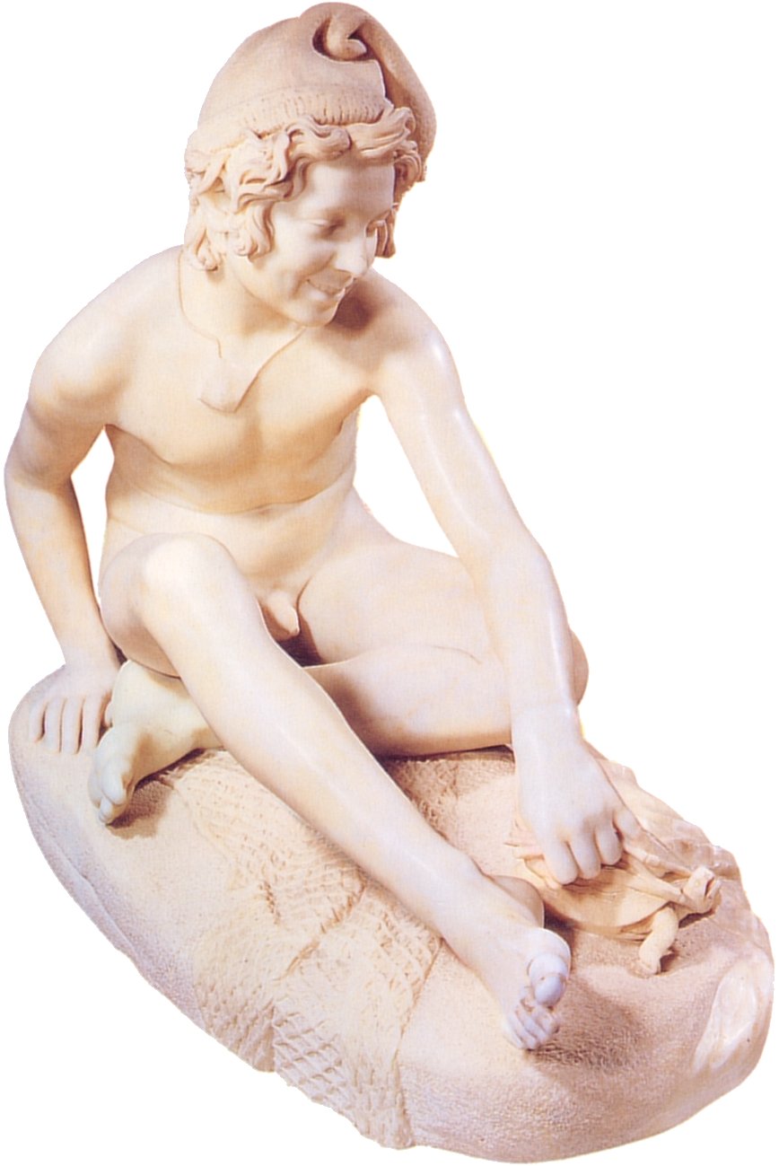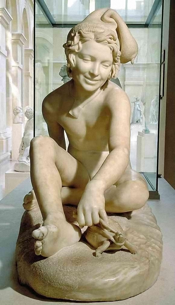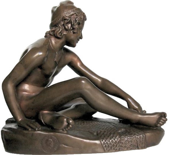 (1784-1855) Neapolitan Fisherboy and Other Works I was sorely tempted to call this page “Rude’s Nudes”. Rude, François (1784 - 1855) French sculptor. He was the principal French sculptor of the Romantic period whose most important work is the heroic relief of the Departure of the Volunteers of 1792 (‘The Marseillaise’) on the Arc de Triomphe in Paris (1833-6). Trained in the art school of his home town, Dijon, in the Neoclassical style, he moved to Paris in 1807. He entered the École des Beaux-Arts in 1809 and won the Prix de Rome in 1812, but was unable to make the trip to Rome because of lack of public funds. A supporter of Napoleon, he left for Brussels when Bonaparte abdicated in 1814, remaining there till 1827. His first major success on his return to France was at the 1831 Salon with his plaster Neapolitan Fisherboy, which the State bought in marble (1831-3, Paris, Louvre) and which earned him the cross of the Legion d’Honneur. Although his work was firmly grounded in his Neoclassical training, and despite the popular success of The Marseillaise, Rude’s sculpture was considered too fervently Romantic for the conservative Académie and he was never elected an Academician. An enthusiastic follower of Napoleon till the end of his days, his final great work was the extraordinary Napoleon Reawakening to Immortality (1845-7), a private commission, the plaster (now in Paris, Musée d’Orsay) executed free of charge for another Bonapartist, Captain Claude Noisot, for erection as a bronze monument on his own estate (Parc Noisot, Fixin, France). Rude’s most important pupil was Carpeaux. --from Xrefer (no longer available) François Rude’s sculpture: ![]() ![]() ![]() ![]() (1) Napoleon Reawakening to Immortality (detail). (In other words, Napoleon was given a Rude “Awakening”.) (2) Hebe from the Musée de Beaux Arts, Dijon. (3) Departure of the Volunteers of 1792 on the Arc de Triomphe, Paris (detail). (4) Aristaeus Mourning the Loss of his Bees, bronze statuette. Neapolitan Fisherboy: Images link to bigger versions, some of which are on other sites. Right Side: ![]() ![]() ![]() ![]() (1) The original marble statue in the Louvre, from Mary Anne Sullivan’s Digital Imaging Project. See Mary Anne Sullivan’s image use policy. (2) A more recent view from a Flickr user. The statue has been moved betwen photos. (3) Bronze reproduction, size unknown. (4) Full-size bronze copy in the Museum of Fine Arts, Dijon. (NB: in the background can be seen a plaster copy of another Fisherboy by Jean-Baptiste Carpeaux.) Front View: ![]() ![]() ![]() ![]() ![]() ![]() ![]() ![]() (1) The original marble statue in the Louvre - above, three-quarter right view (2) The original marble statue in the Louvre - ahead, three-quarter right view (3) Another view of the original marble statue, from Mary Anne Sullivan’s Digital Imaging Project. See Mary Anne Sullivan’s image use policy. (4) The original marble statue behind a plaster replica of Carpeaux’s Fisherboy, photo by Anonymous Benefactor. (5) The original marble statue again, slightly dark. (6) And not so dark. (7) Full-size bronze copy in the Museum of Fine Arts, Dijon. (8) Bronze reproduction, height 9½” / 24.1cm. Left Side: ![]() ![]() ![]() ![]() ![]() ![]() (1) The original marble statue in the Louvre. (2), (3), (4), (5), (6), Various bronze reproductions, sizes unknown. Back Side: ![]() (1) The original marble statue in the Louvre, photo by Anonymous Benefactor. Comment on this page Site Introduction | Art Gallery Index | Return to Top of Page | ||||
