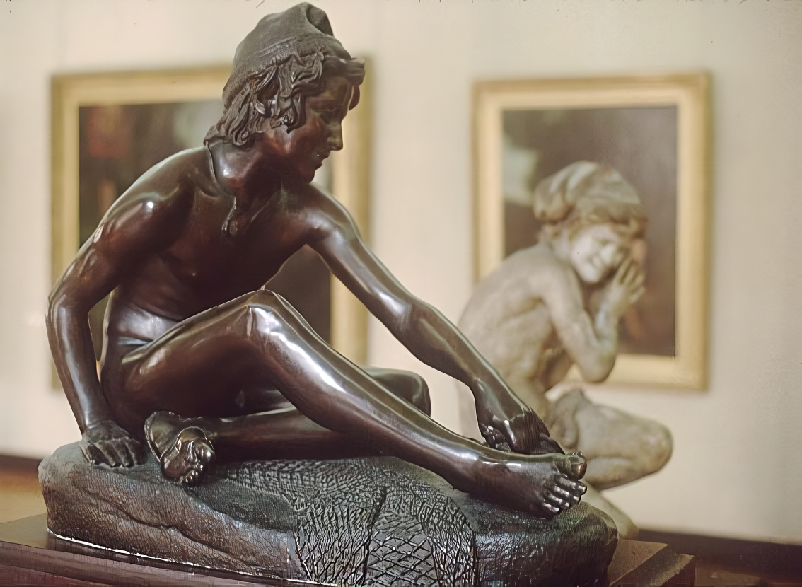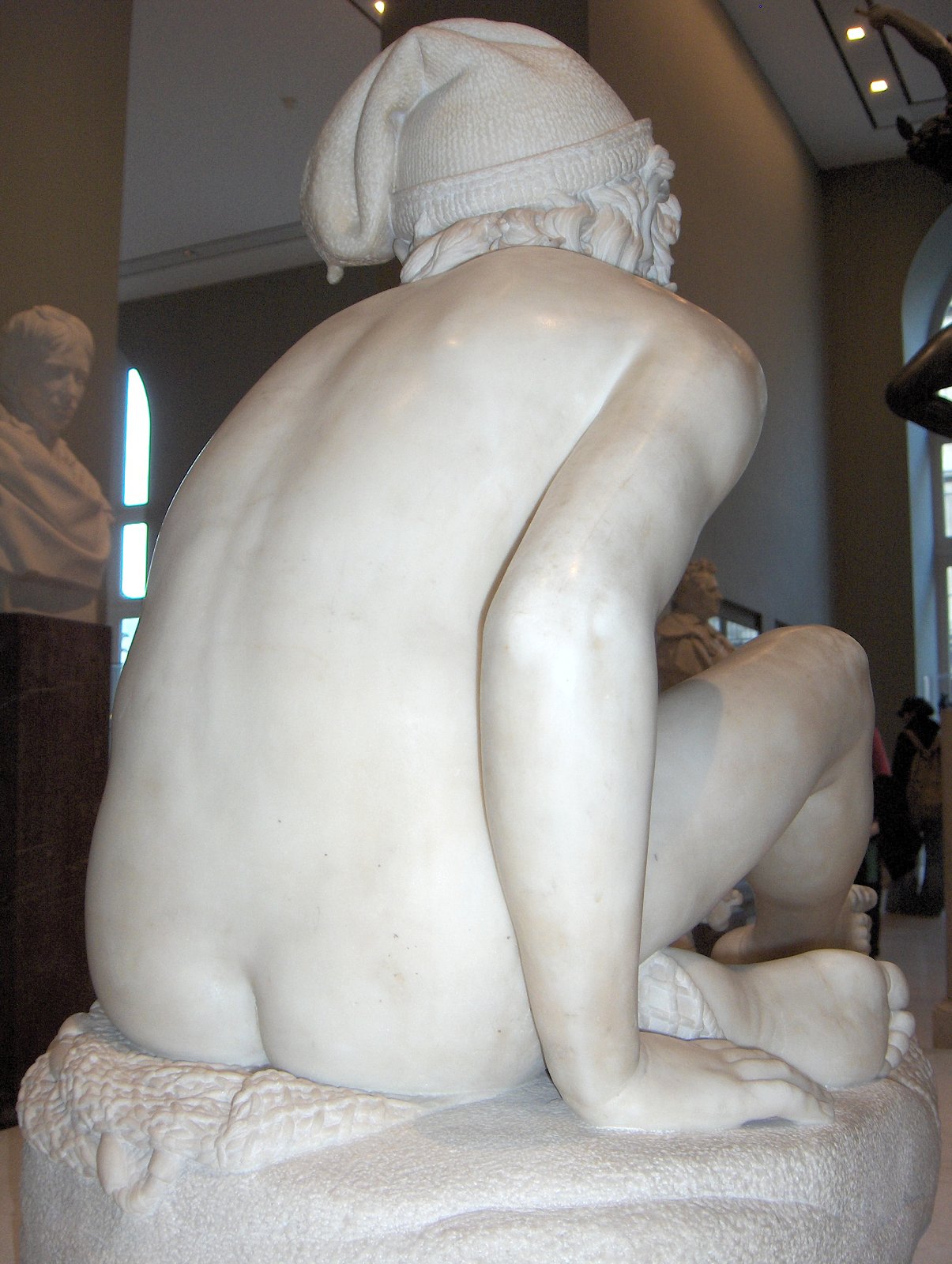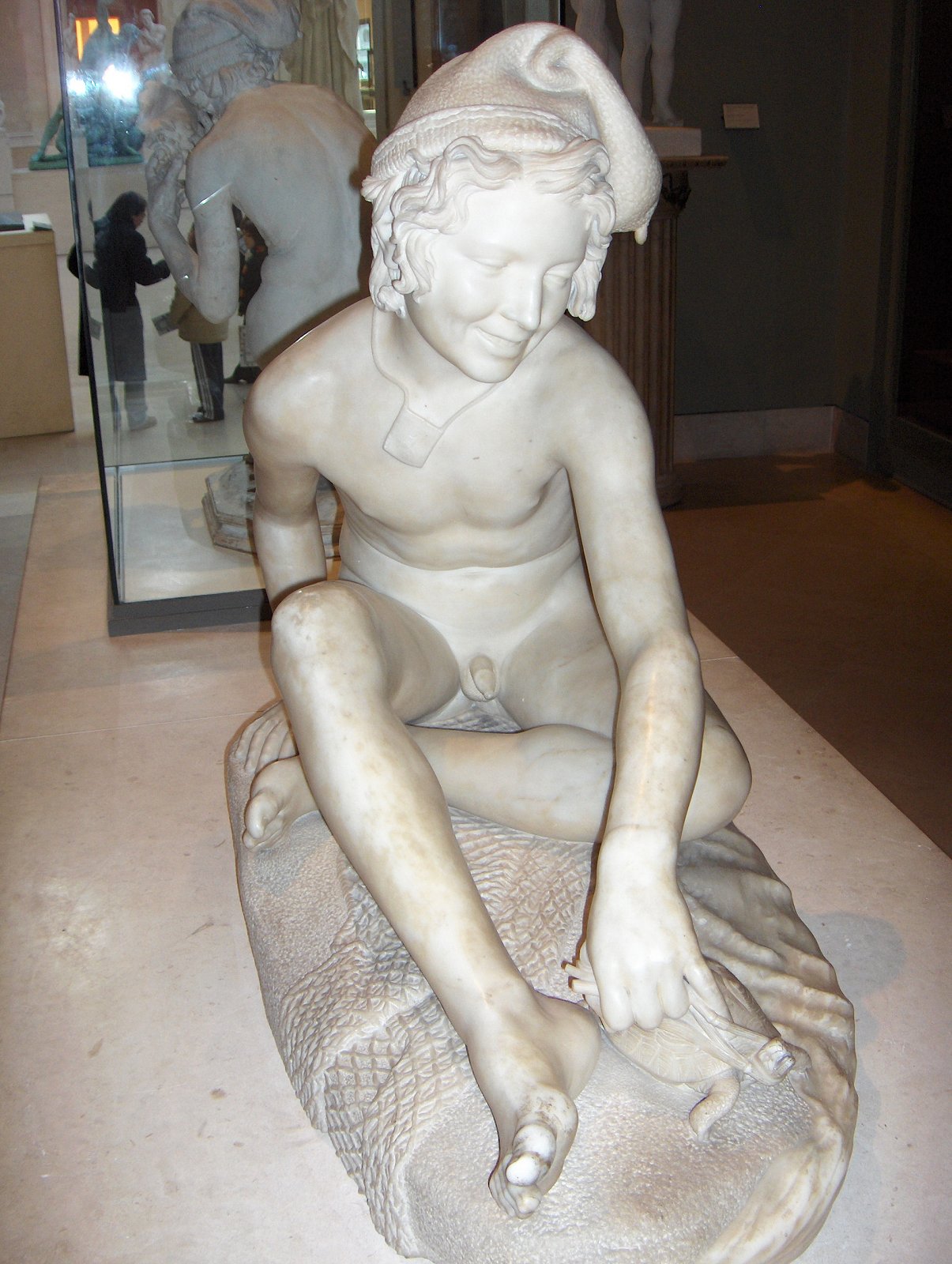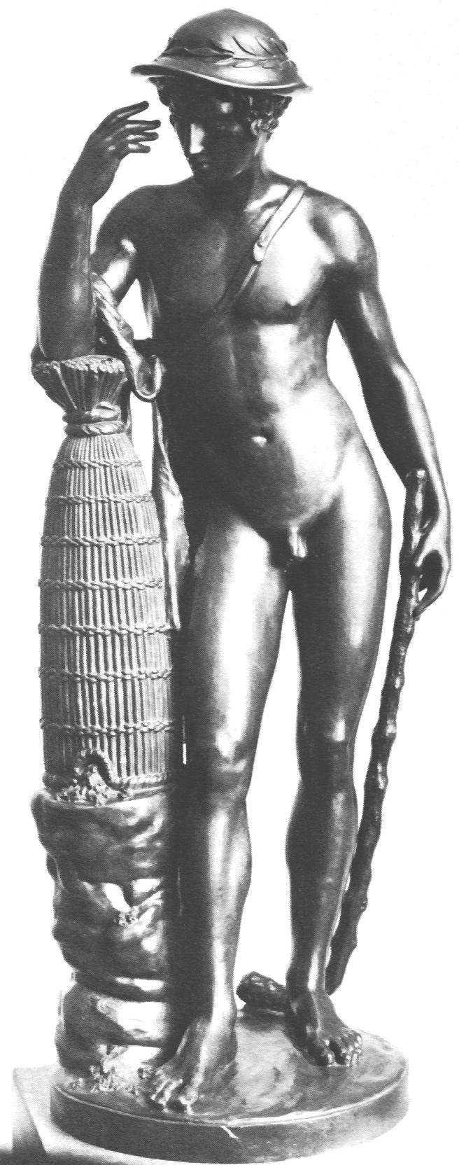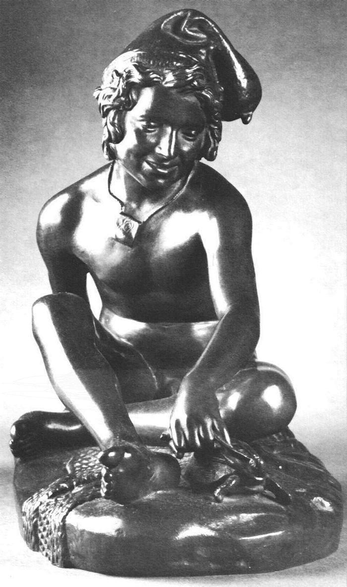 (1784-1855) Neapolitan Fisherboy and Other Works I was sorely tempted to call this page “Rude’s Nudes”. Rude, François (1784 - 1855) French sculptor. He was the principal French sculptor of the Romantic period whose most important work is the heroic relief of the Departure of the Volunteers of 1792 (‘The Marseillaise’) on the Arc de Triomphe in Paris (1833-6). Trained in the art school of his home town, Dijon, in the Neoclassical style, he moved to Paris in 1807. He entered the École des Beaux-Arts in 1809 and won the Prix de Rome in 1812, but was unable to make the trip to Rome because of lack of public funds. A supporter of Napoleon, he left for Brussels when Bonaparte abdicated in 1814, remaining there till 1827. His first major success on his return to France was at the 1831 Salon with his plaster Neapolitan Fisherboy, which the State bought in marble (1831-3, Paris, Louvre) and which earned him the cross of the Legion d’Honneur. Although his work was firmly grounded in his Neoclassical training, and despite the popular success of The Marseillaise, Rude’s sculpture was considered too fervently Romantic for the conservative Académie and he was never elected an Academician. An enthusiastic follower of Napoleon till the end of his days, his final great work was the extraordinary Napoleon Reawakening to Immortality (1845-7), a private commission, the plaster (now in Paris, Musée d’Orsay) executed free of charge for another Bonapartist, Captain Claude Noisot, for erection as a bronze monument on his own estate (Parc Noisot, Fixin, France). Rude’s most important pupil was Carpeaux. --from Xrefer (no longer available) François Rude’s sculpture: ![]() ![]() ![]() ![]() (1) Napoleon Reawakening to Immortality (detail). (In other words, Napoleon was given a Rude “Awakening”.) (2) Hebe from the Musée de Beaux Arts, Dijon. (3) Departure of the Volunteers of 1792 on the Arc de Triomphe, Paris (detail). (4) Aristaeus Mourning the Loss of his Bees, bronze statuette. Neapolitan Fisherboy: Images link to bigger versions, some of which are on other sites. Right Side: ![]() ![]() ![]() ![]() (1) The original marble statue in the Louvre, from Mary Anne Sullivan’s Digital Imaging Project. See Mary Anne Sullivan’s image use policy. (2) A more recent view from a Flickr user. The statue has been moved betwen photos. (3) Bronze reproduction, size unknown. (4) Full-size bronze copy in the Museum of Fine Arts, Dijon. (NB: in the background can be seen a plaster copy of another Fisherboy by Jean-Baptiste Carpeaux.) Front View: ![]() ![]() ![]() ![]() ![]() ![]() ![]() ![]() (1) The original marble statue in the Louvre - above, three-quarter right view (2) The original marble statue in the Louvre - ahead, three-quarter right view (3) Another view of the original marble statue, from Mary Anne Sullivan’s Digital Imaging Project. See Mary Anne Sullivan’s image use policy. (4) The original marble statue behind a plaster replica of Carpeaux’s Fisherboy, photo by Anonymous Benefactor. (5) The original marble statue again, slightly dark. (6) And not so dark. (7) Full-size bronze copy in the Museum of Fine Arts, Dijon. (8) Bronze reproduction, height 9½” / 24.1cm. Left Side: ![]() ![]() ![]() ![]() ![]() ![]() (1) The original marble statue in the Louvre. (2), (3), (4), (5), (6), Various bronze reproductions, sizes unknown. Back Side: ![]() (1) The original marble statue in the Louvre, photo by Anonymous Benefactor. Comment on this page Site Introduction | Art Gallery Index | Return to Top of Page | ||||