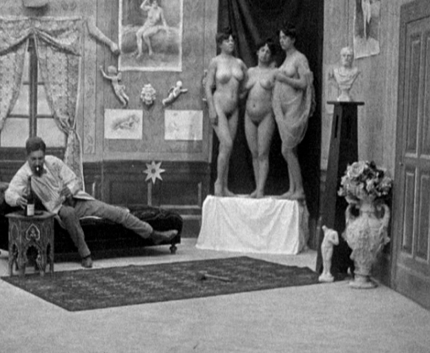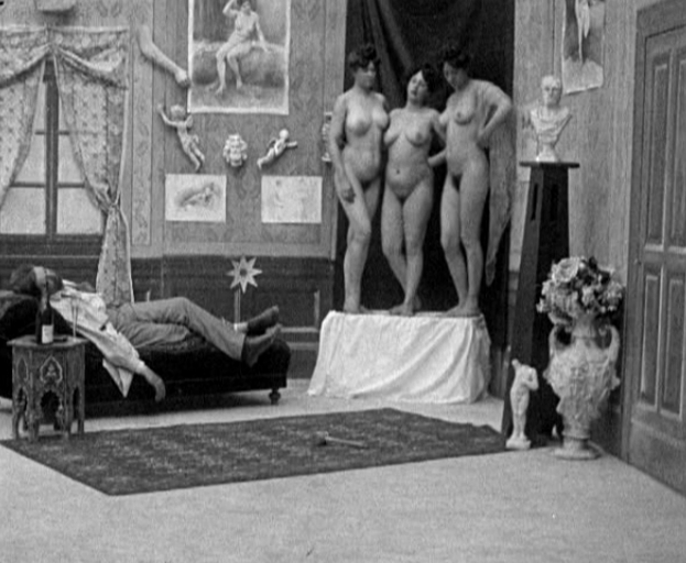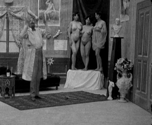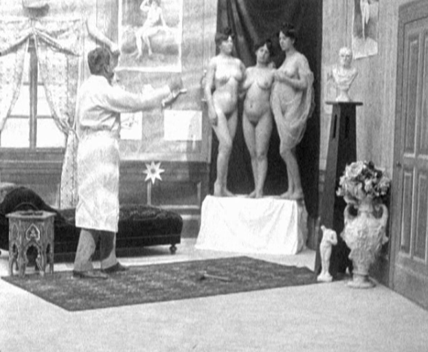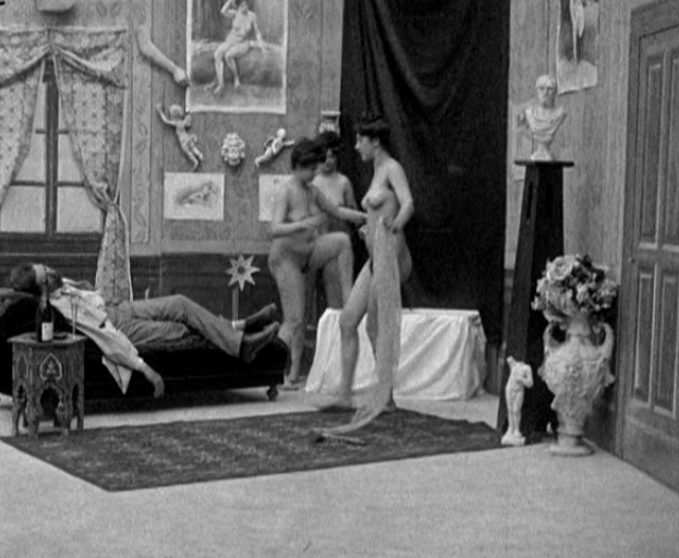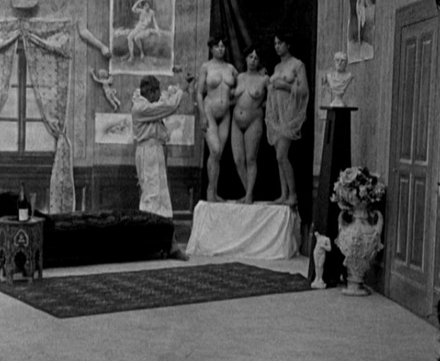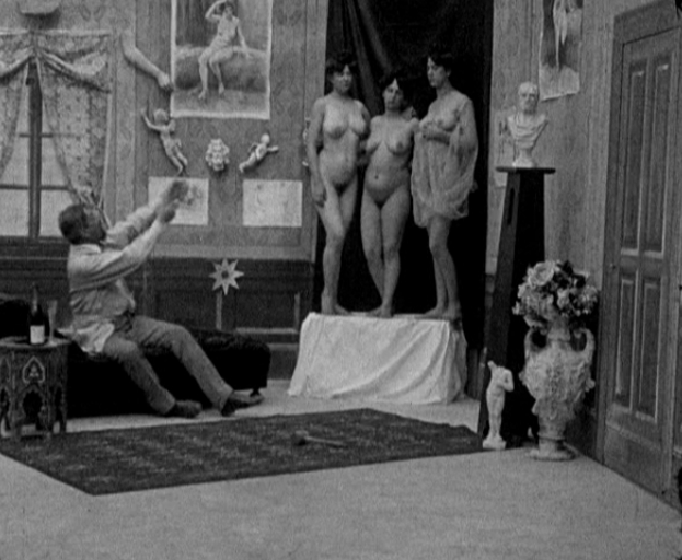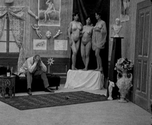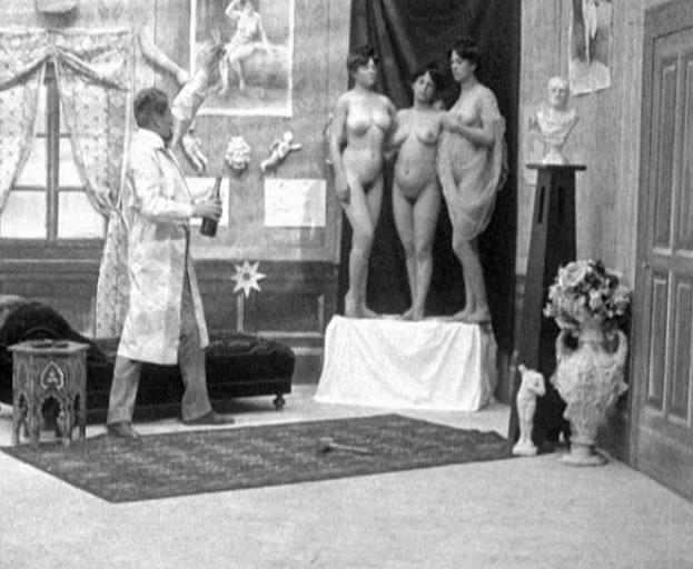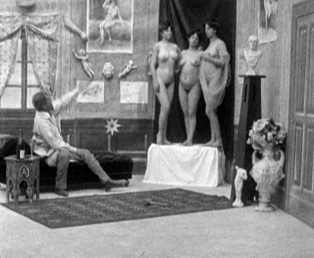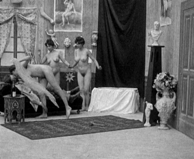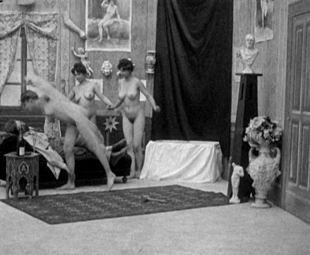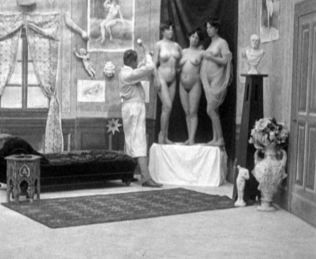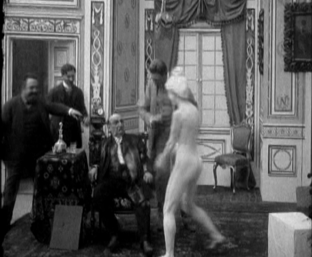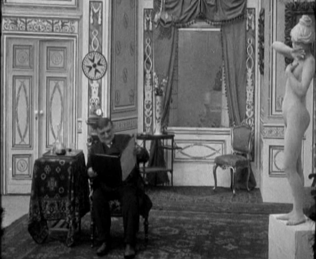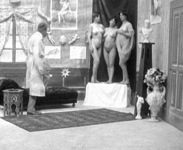 Saturn-Film was an Austrian film company that made erotic shorts from 1906-1911. Their material is extremely softcore by today’s standards, but would probably have been considered pretty shocking back then. Many of these films have appeared on an Austrian compilation DVD, and a couple of them feature actresses posing as nude statues. I first became aware of this thanks to a post on one of the Yahoo! Groups (unfortunately, I can’t remember which one) and got hold of a copy of the DVD, from which the following screencaps are taken. The actresses do a pretty good job of posing motionless. It’s only when you fast-forward the DVD that you can see them swaying slightly for balance.